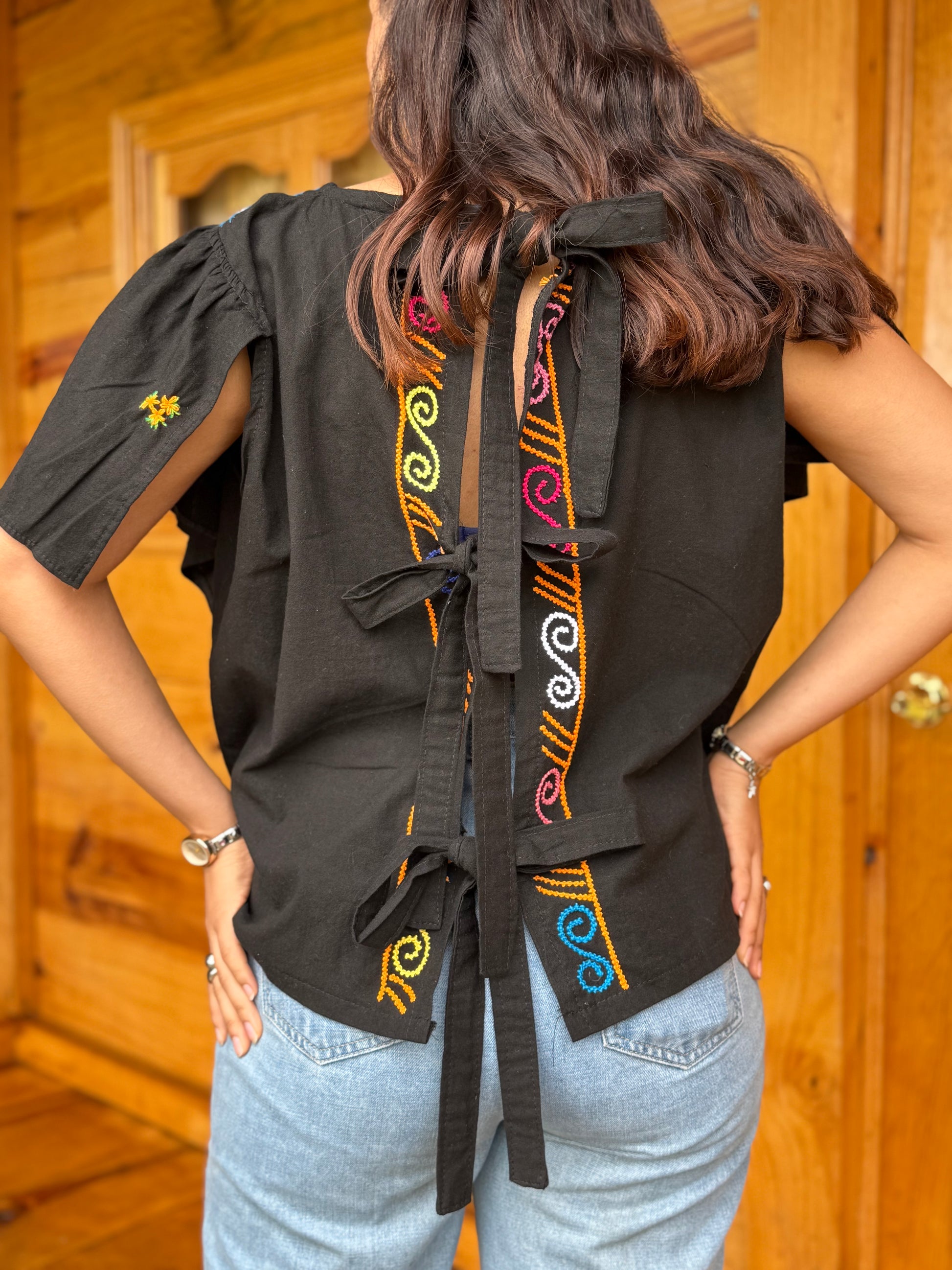 Manta 100% algodón, color negro y bordado de historias totalmente a mano.