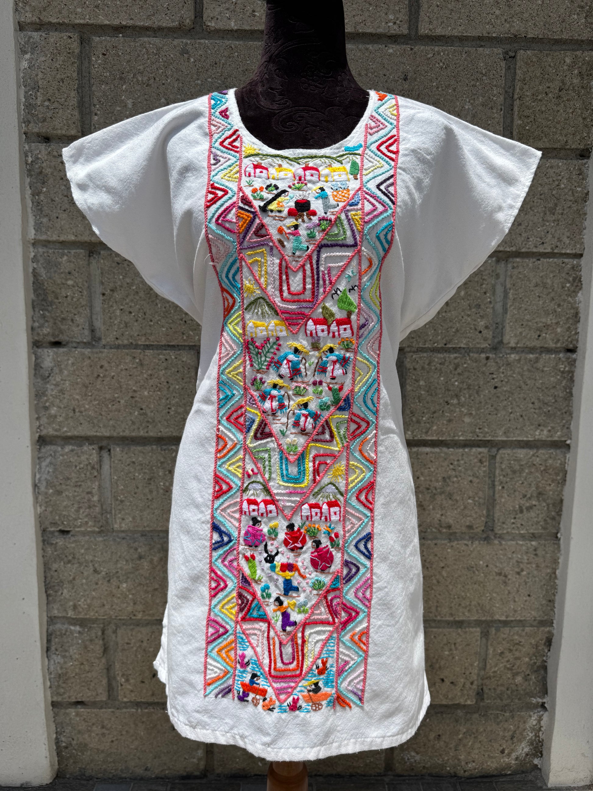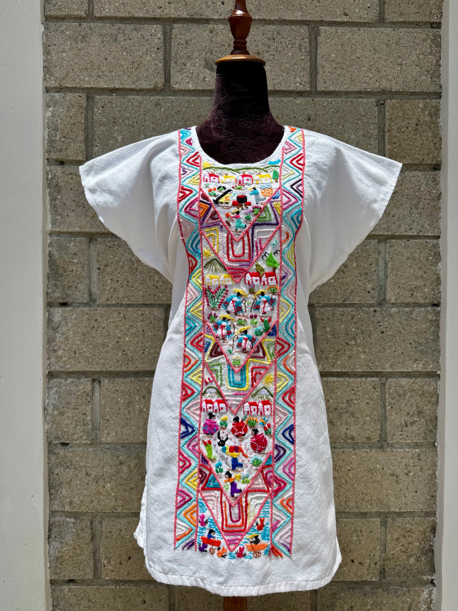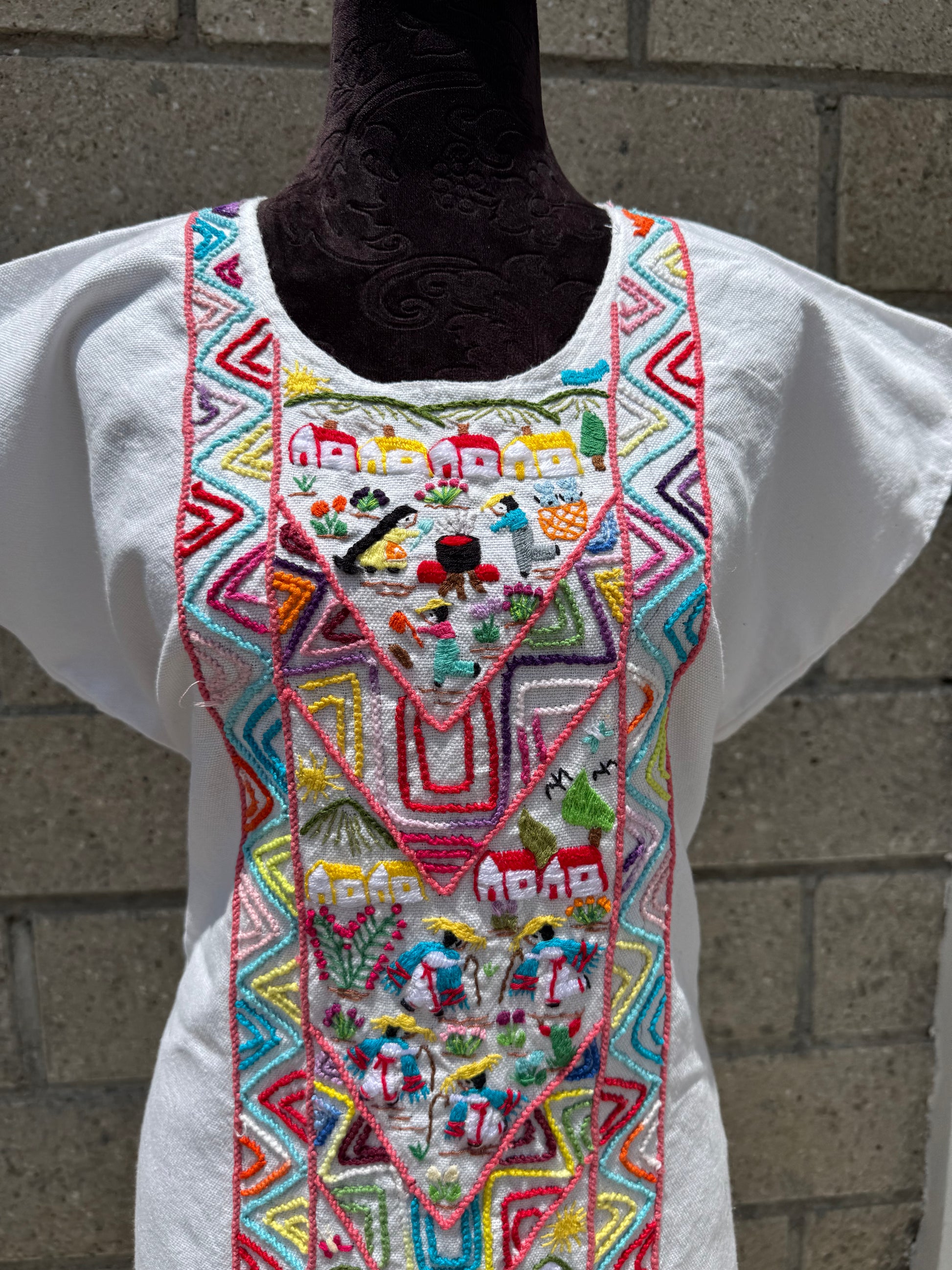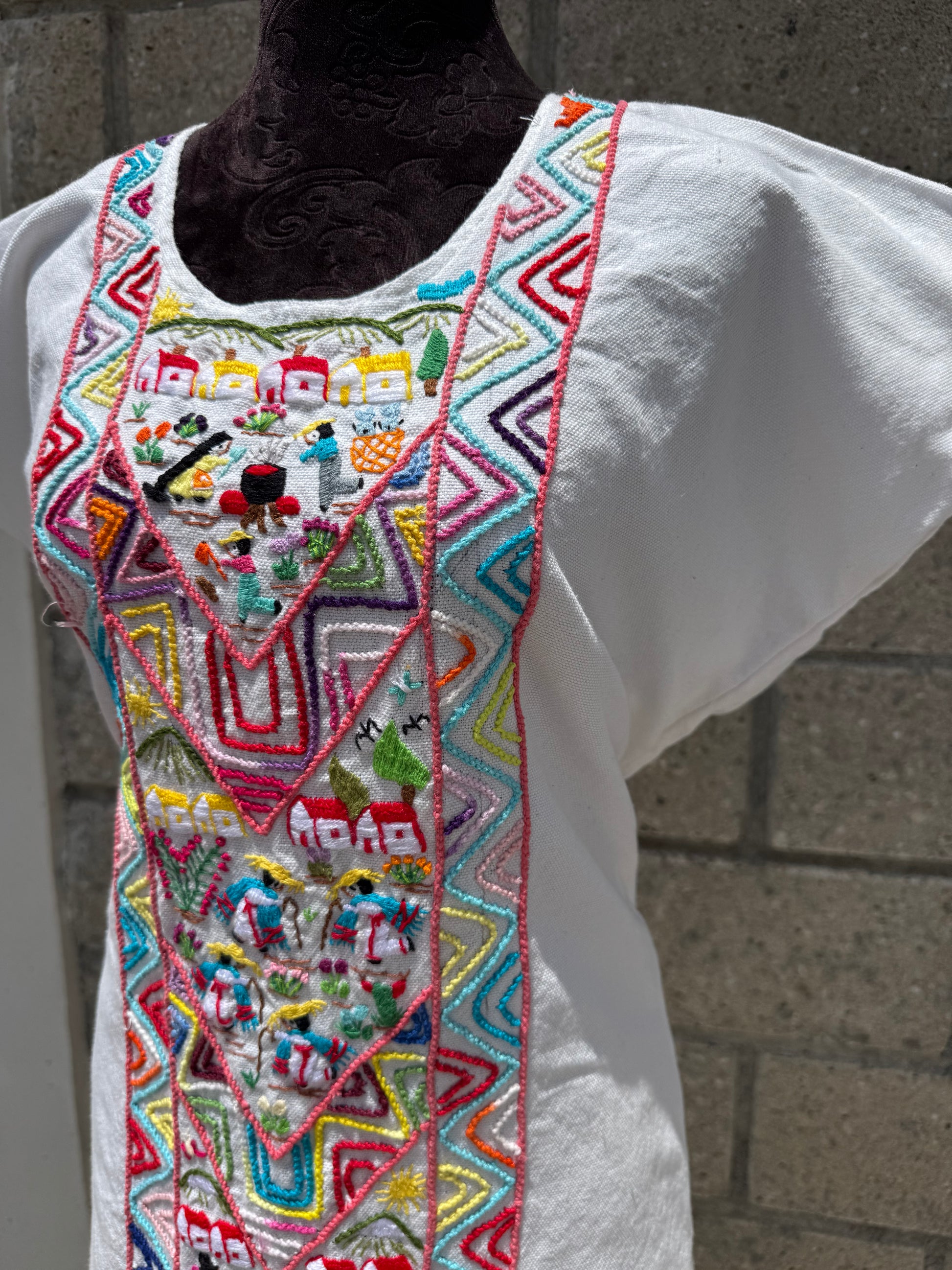 Tejido telar rústico, confeccionado y bordado de historias totalmente a mano.