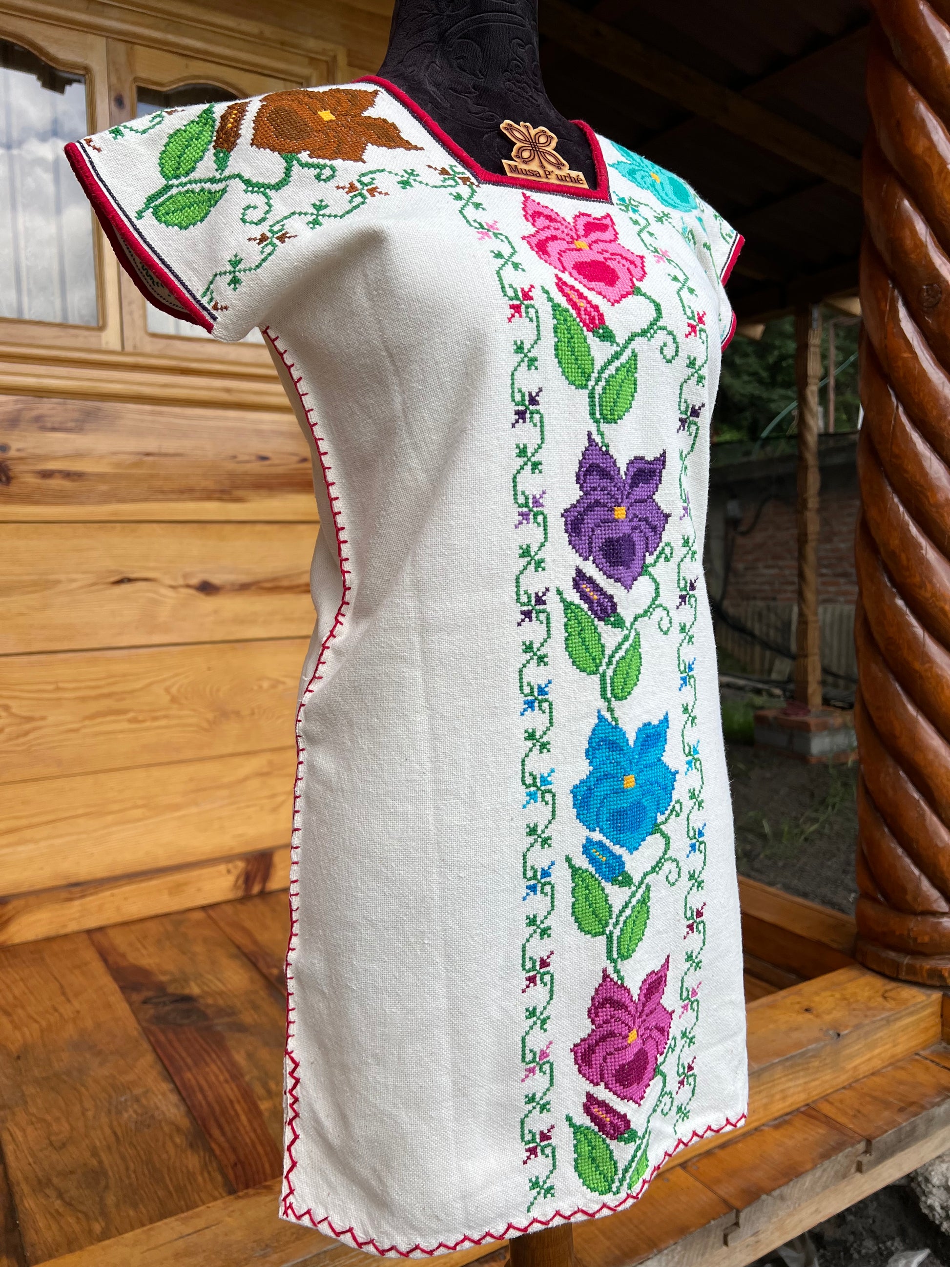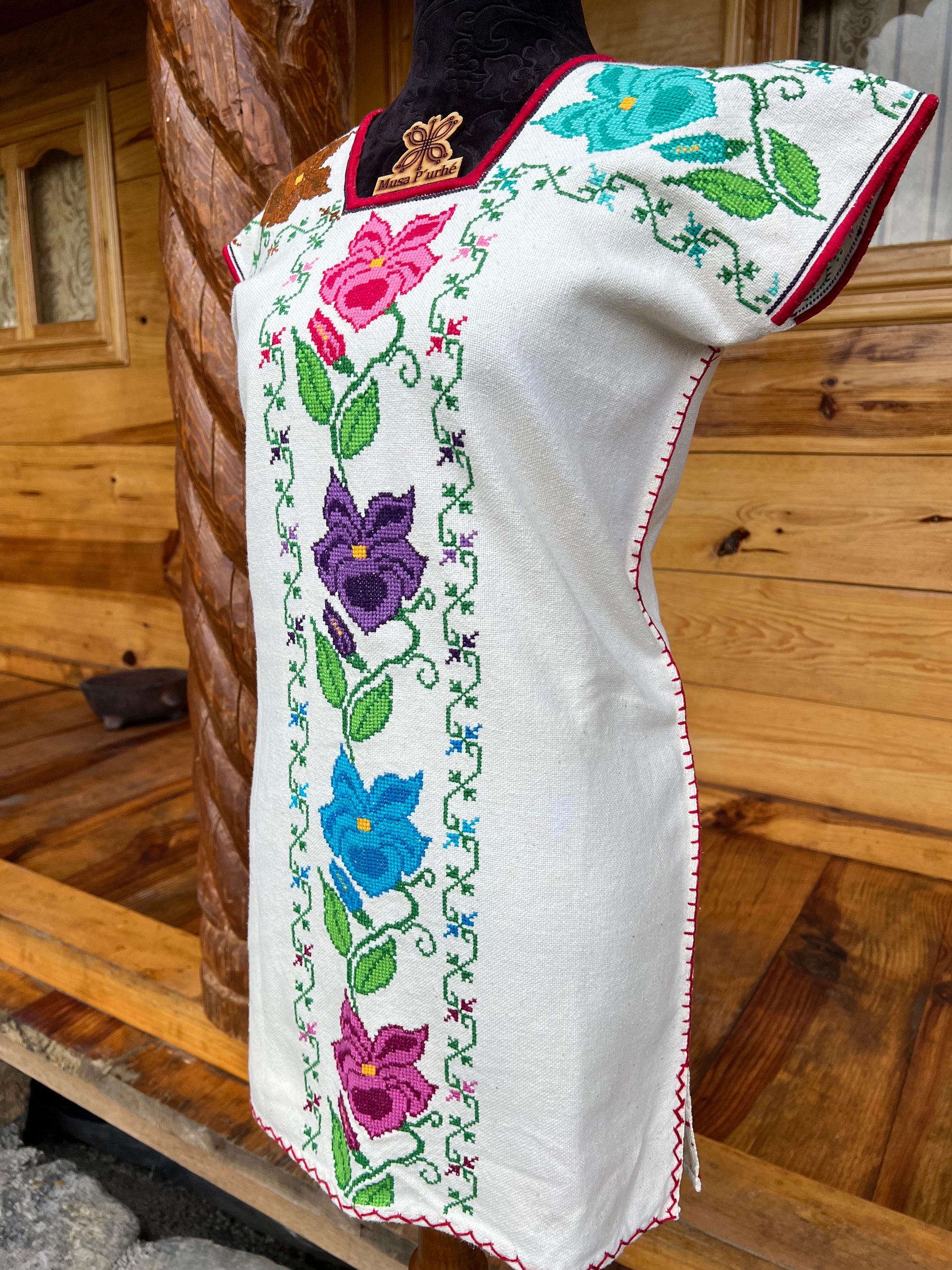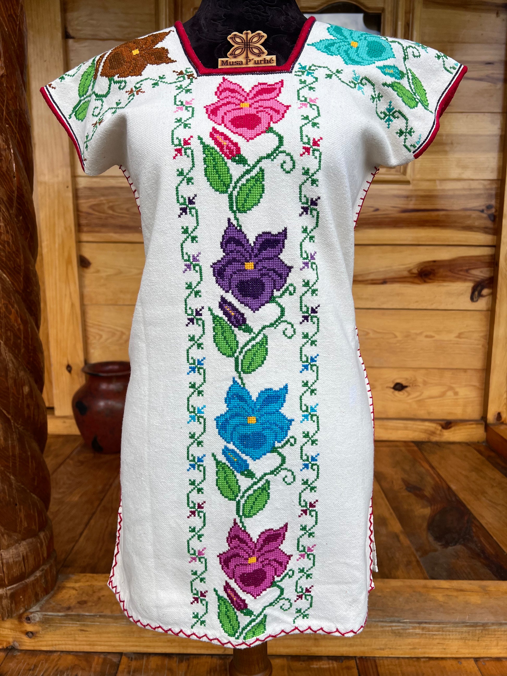 Tejido en telar rústico, confeccionado y bordado en punto de cruz totalmente a mano