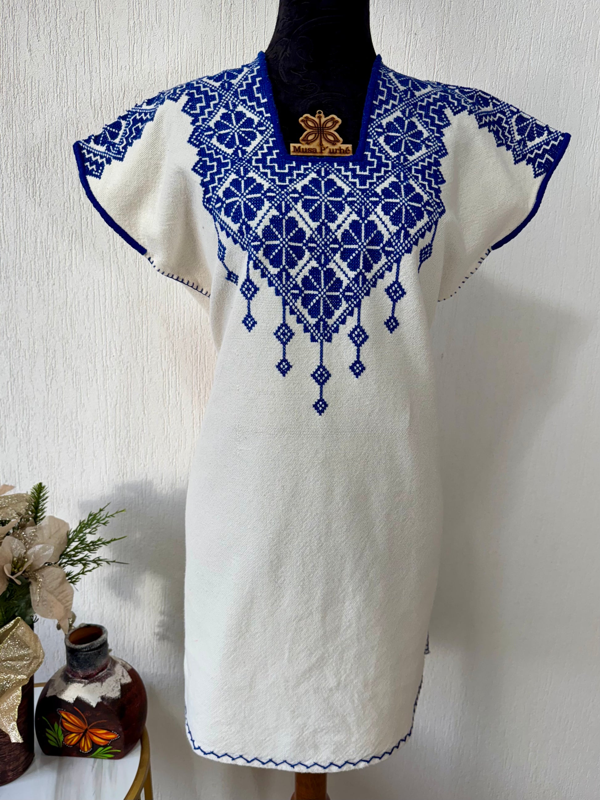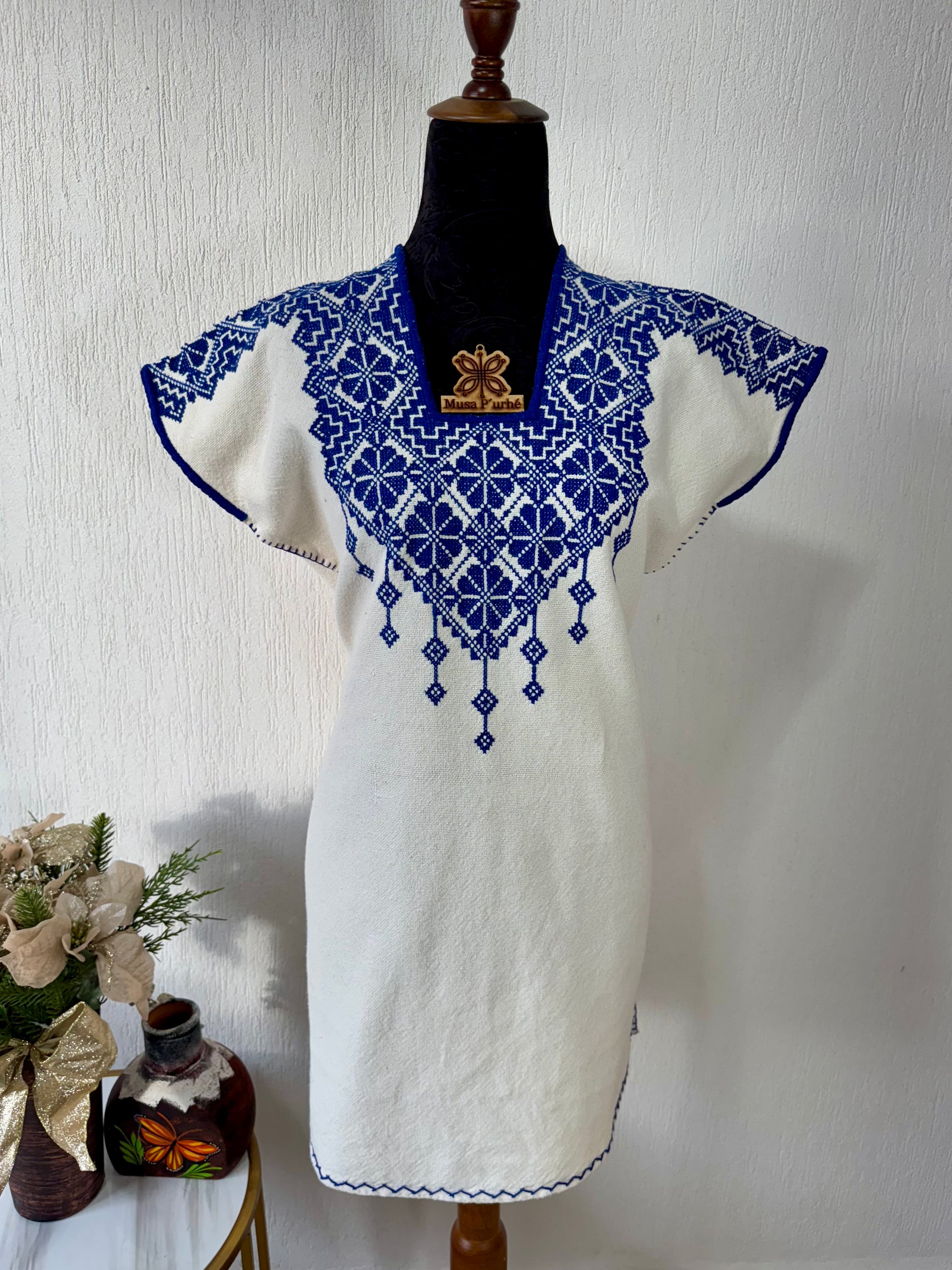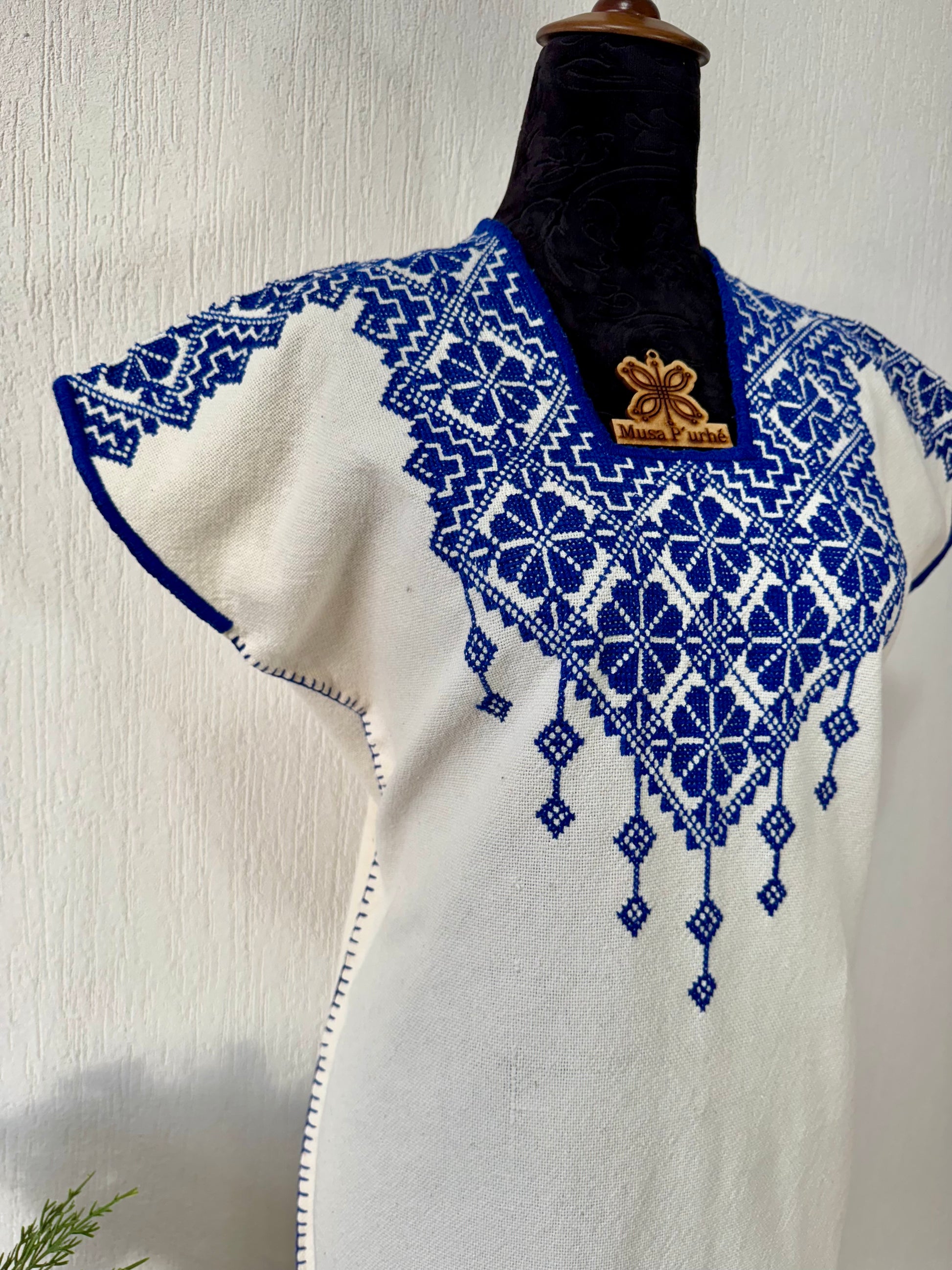 Tejido en telar rústico, confeccionado y bordado en punto de cruz totalmente a mano por ambos lados.