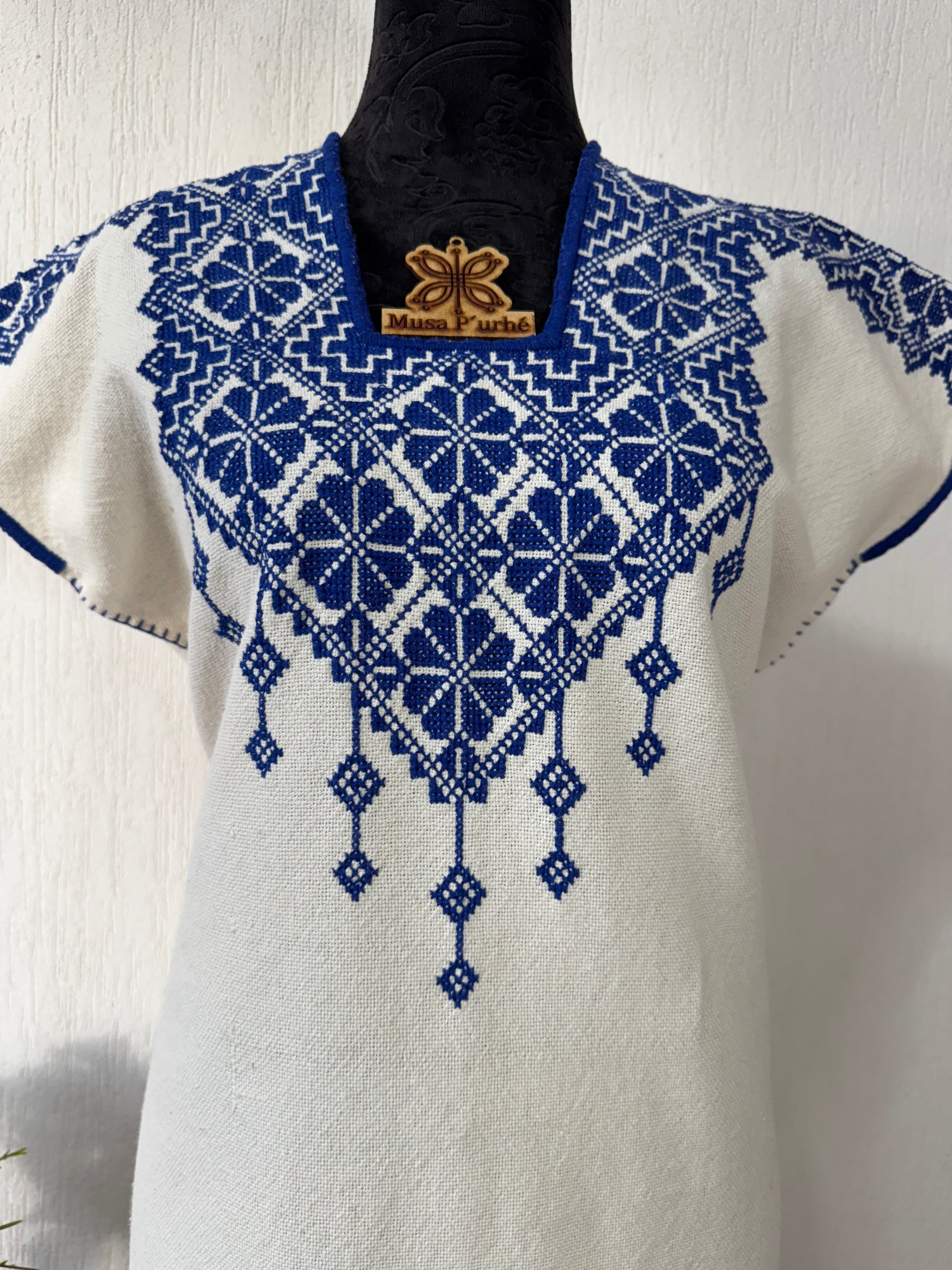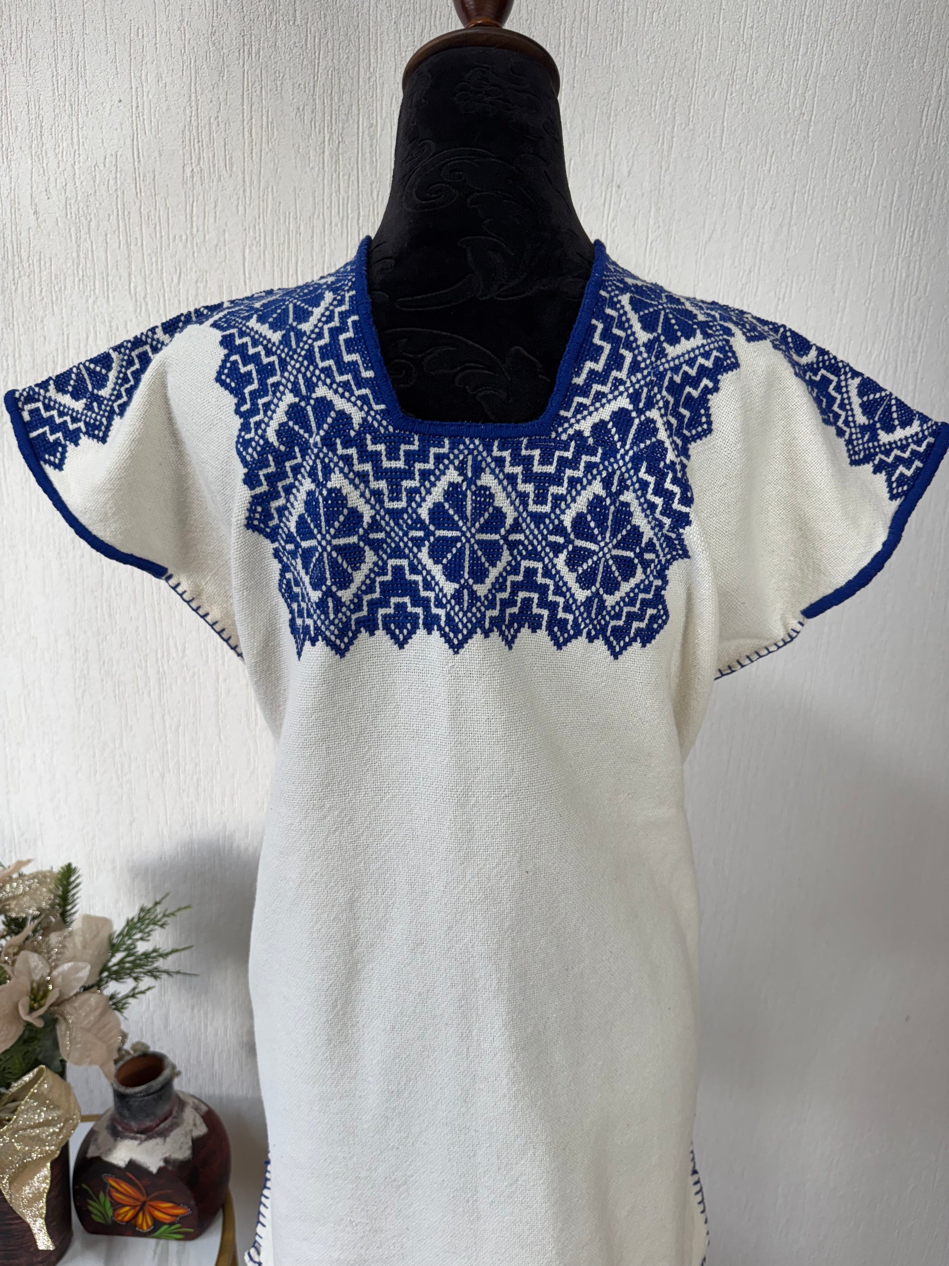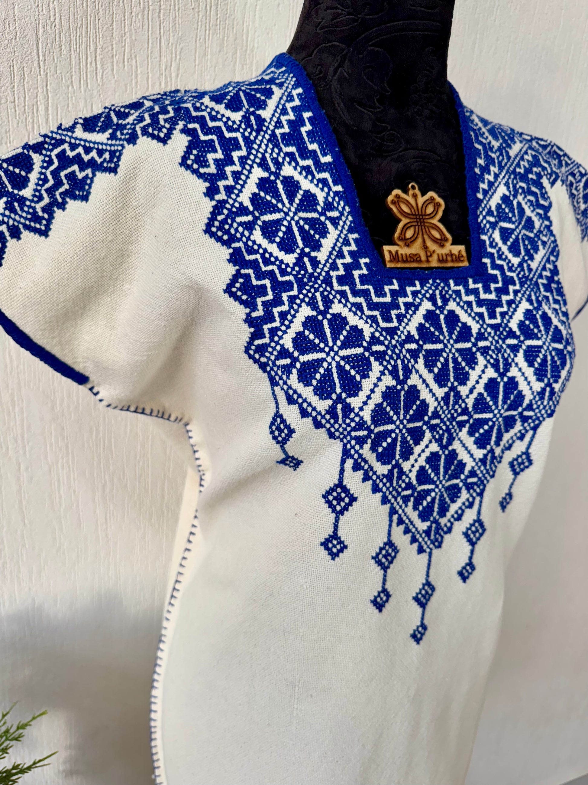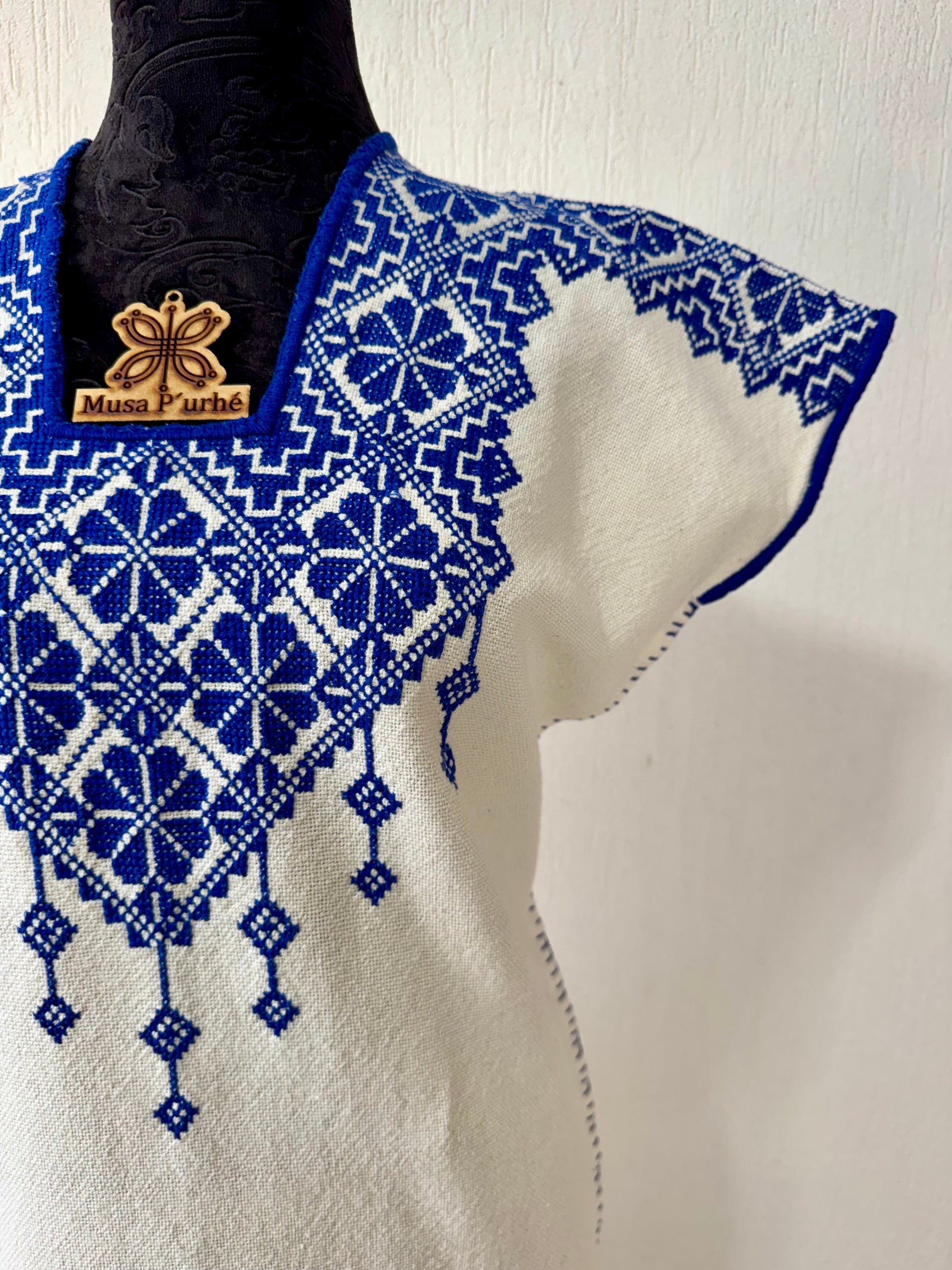 Tejido en telar rústico, confeccionado y bordado en punto de cruz totalmente a mano por ambos lados.