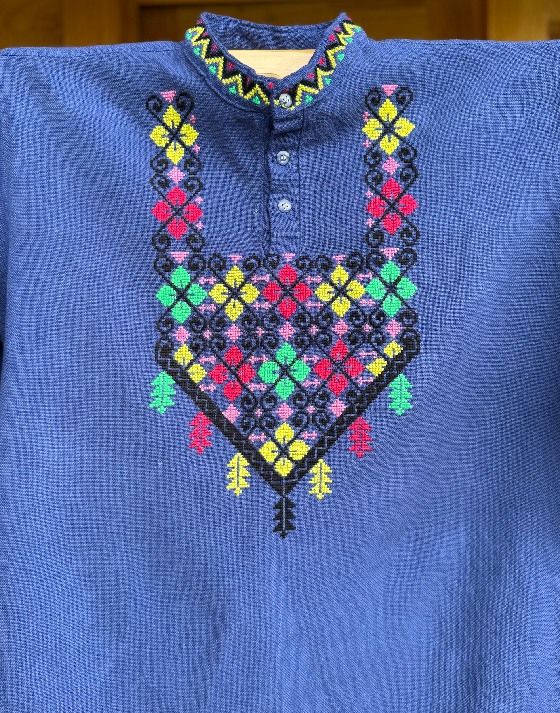 Tejido en telar rústico, confeccionado y bordado en punto de cruz totalmente a mano, punto pequeño.