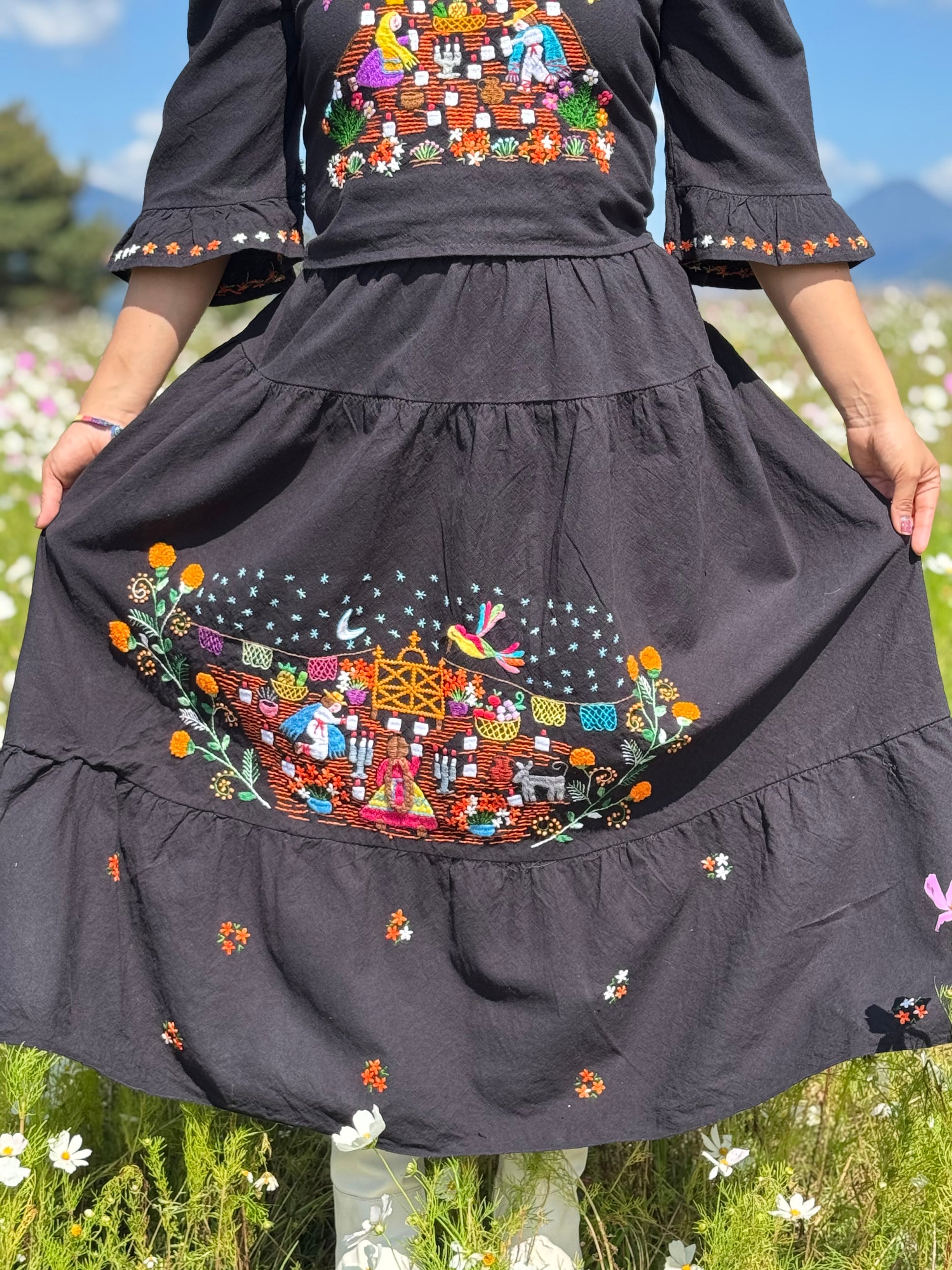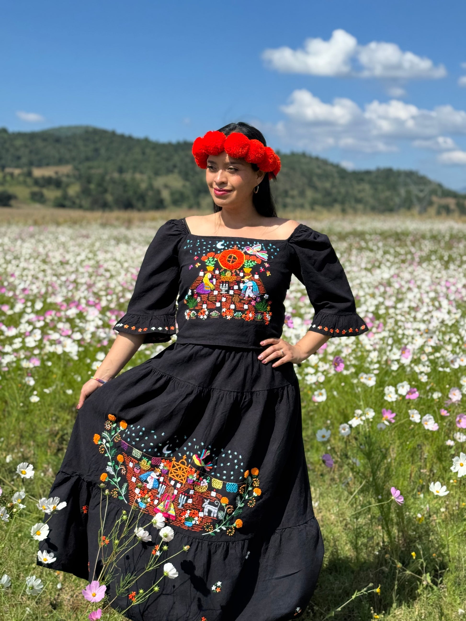 Tejido telar rústico, confeccionado y bordado de historias totalmente a mano.