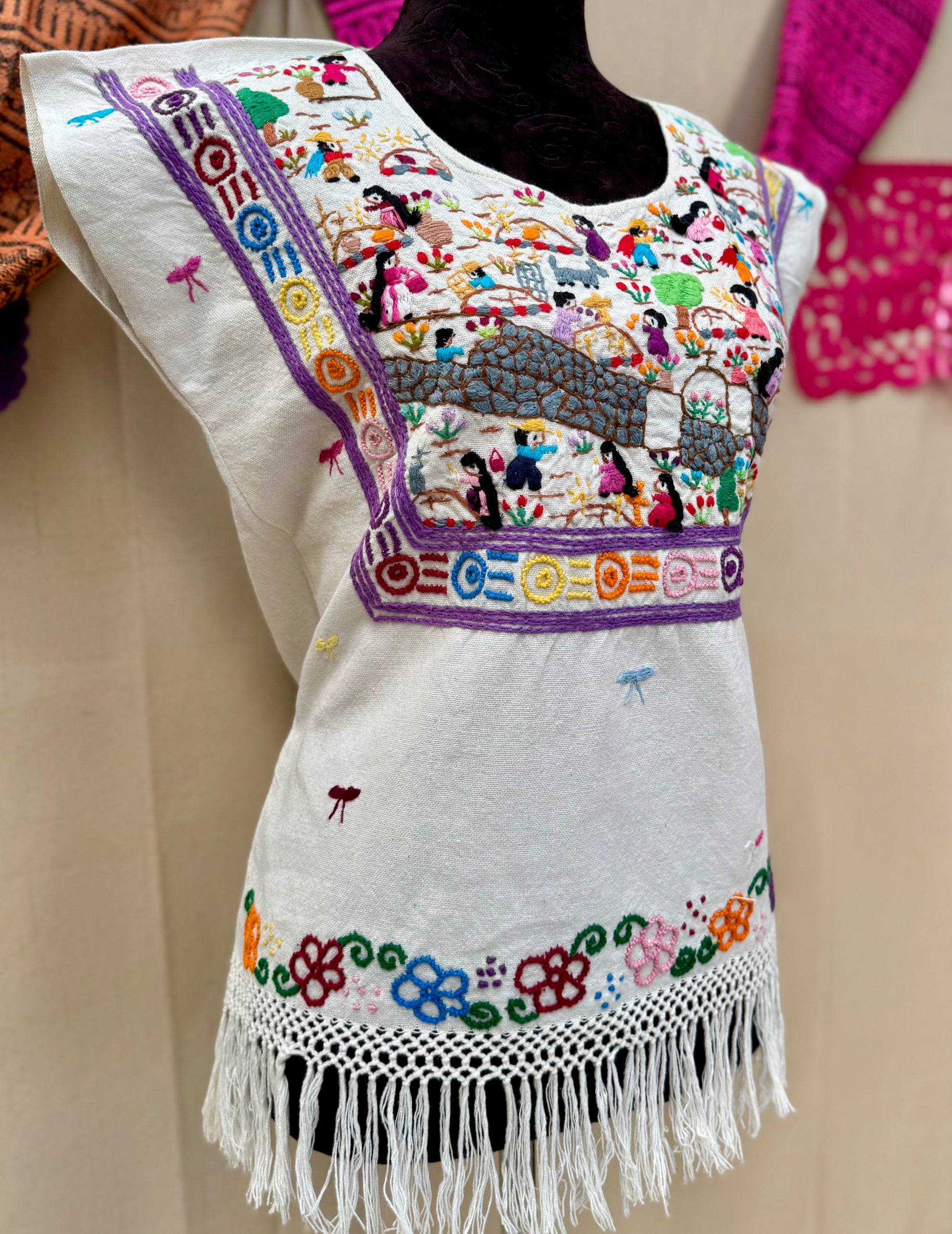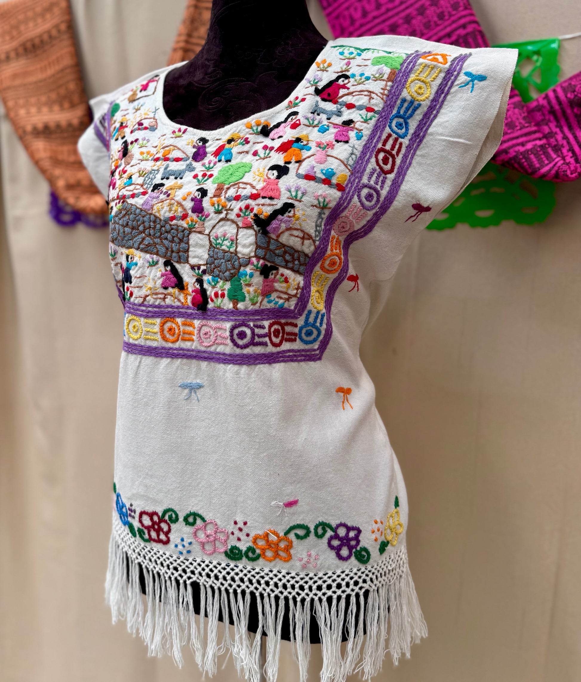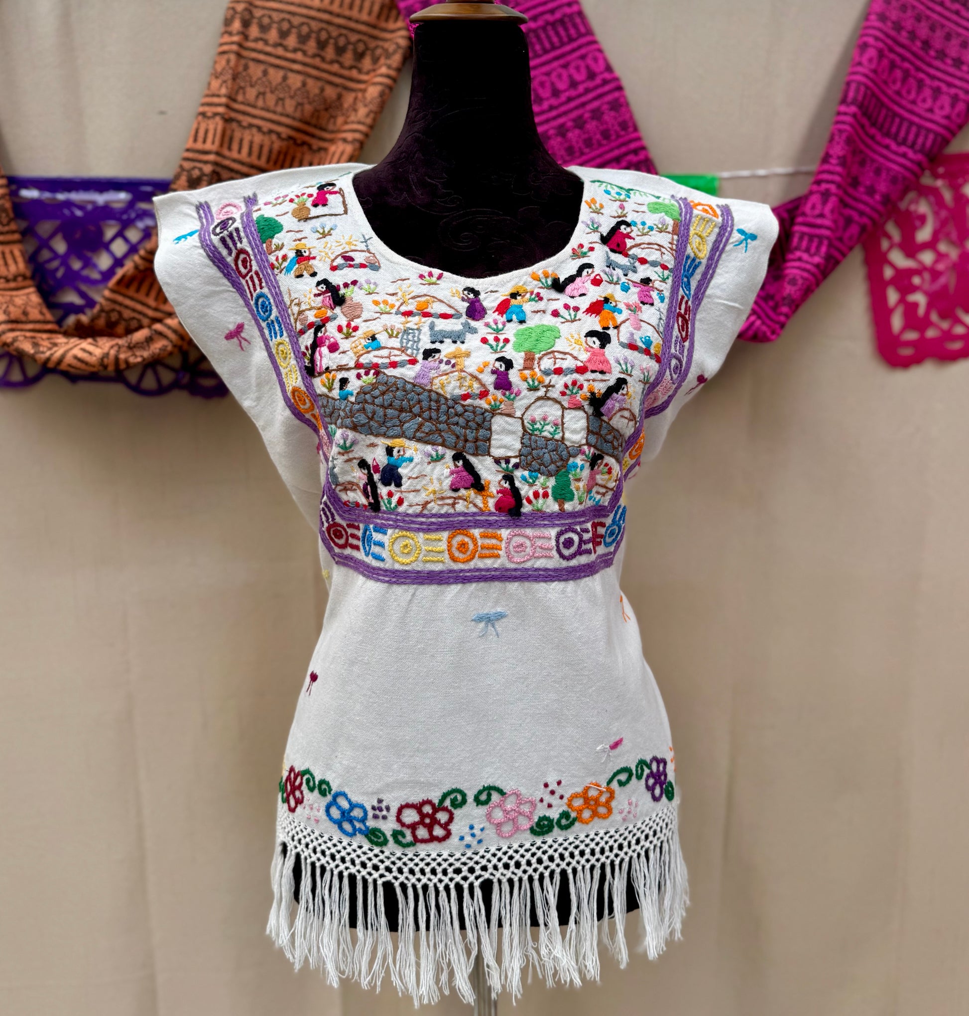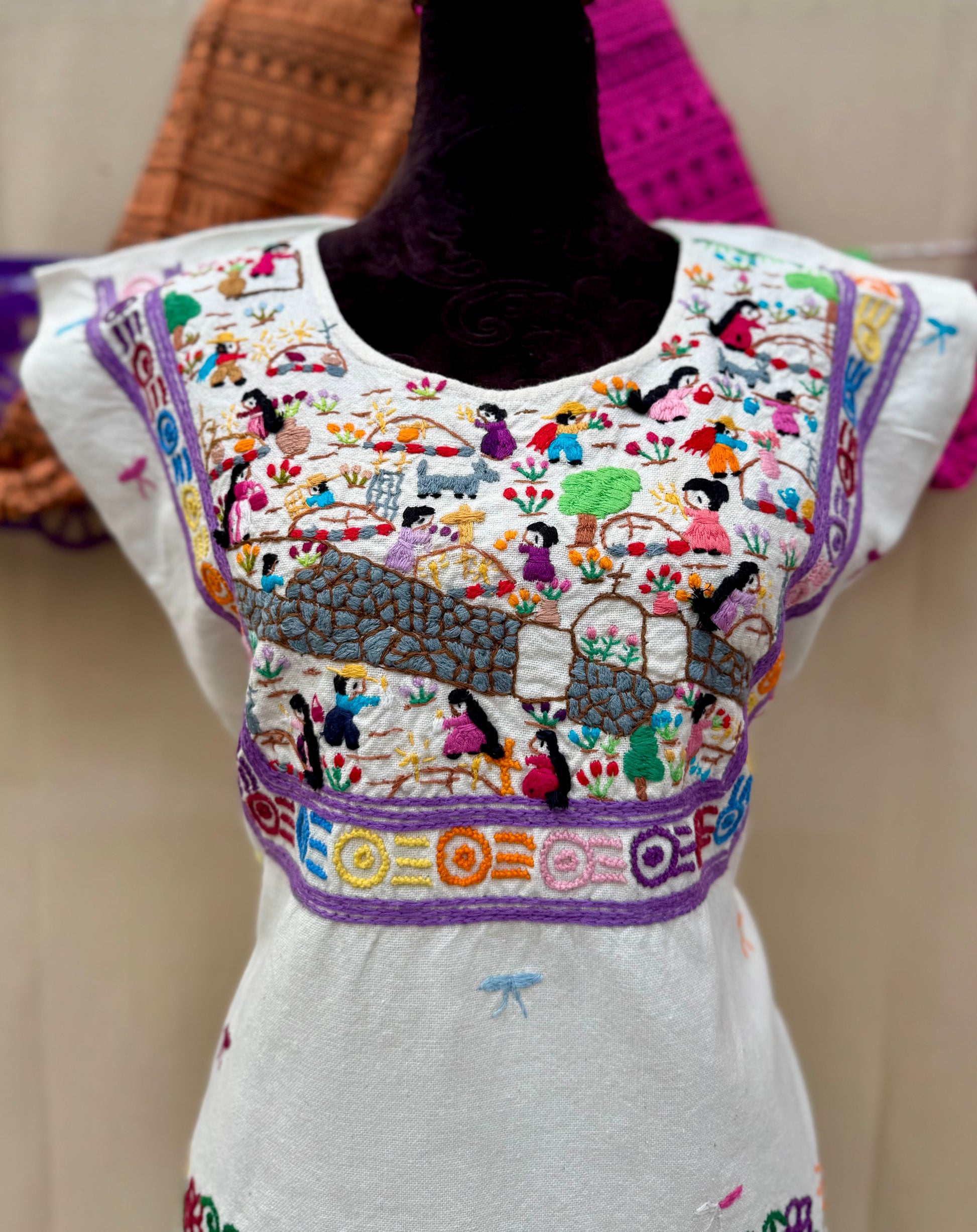 Tejido telar rústico, confeccionado y bordado de historias totalmente a mano.