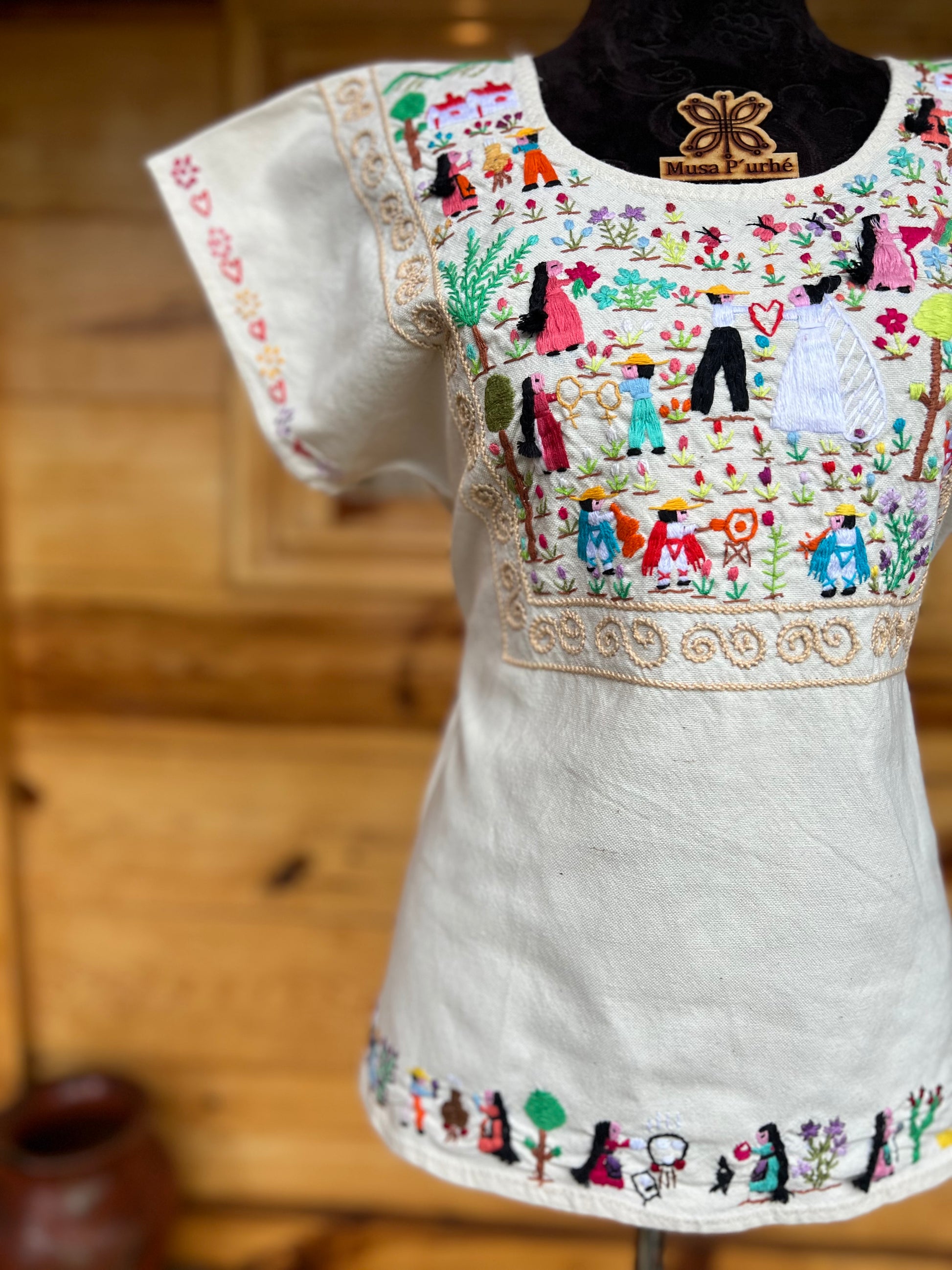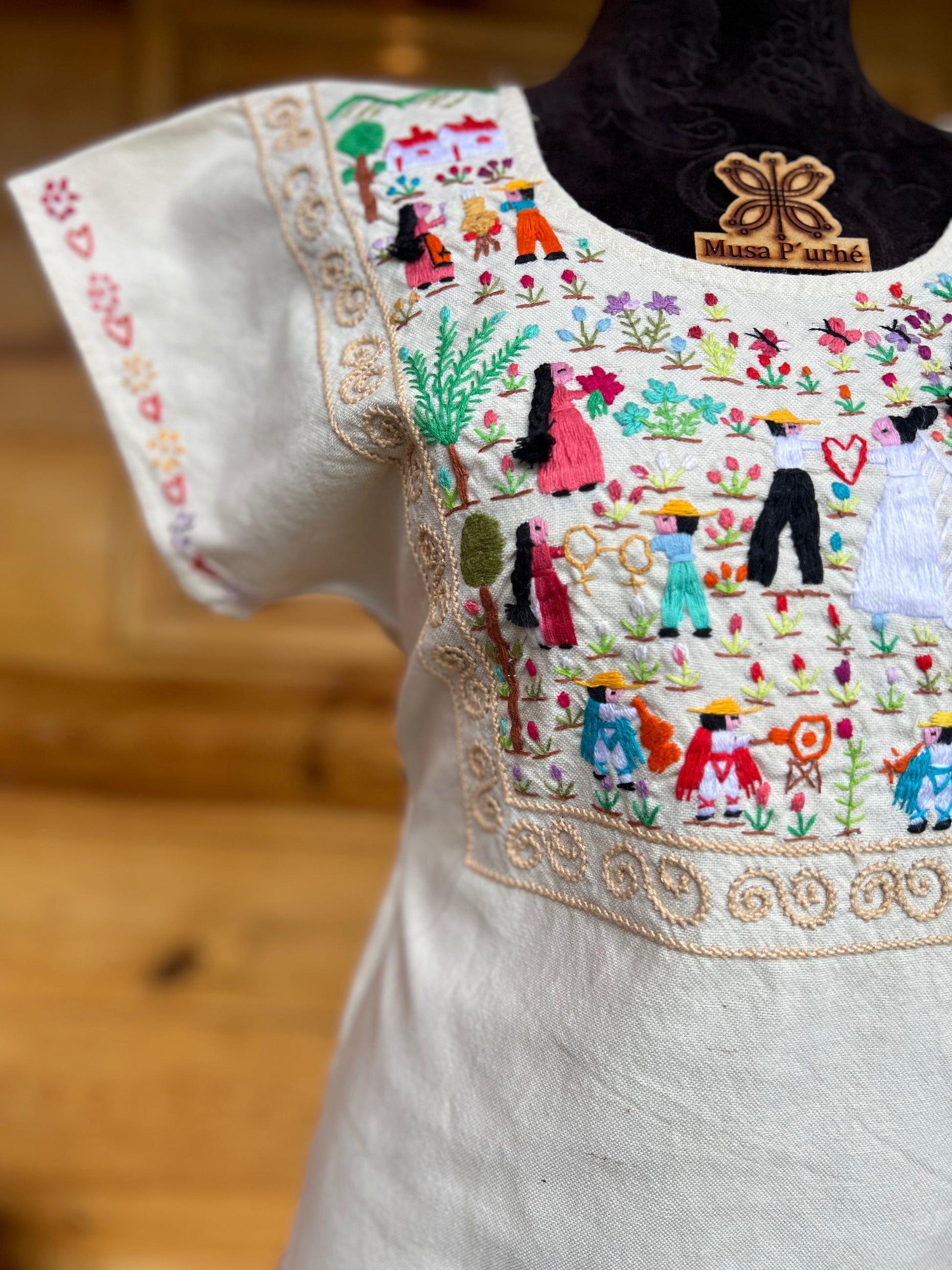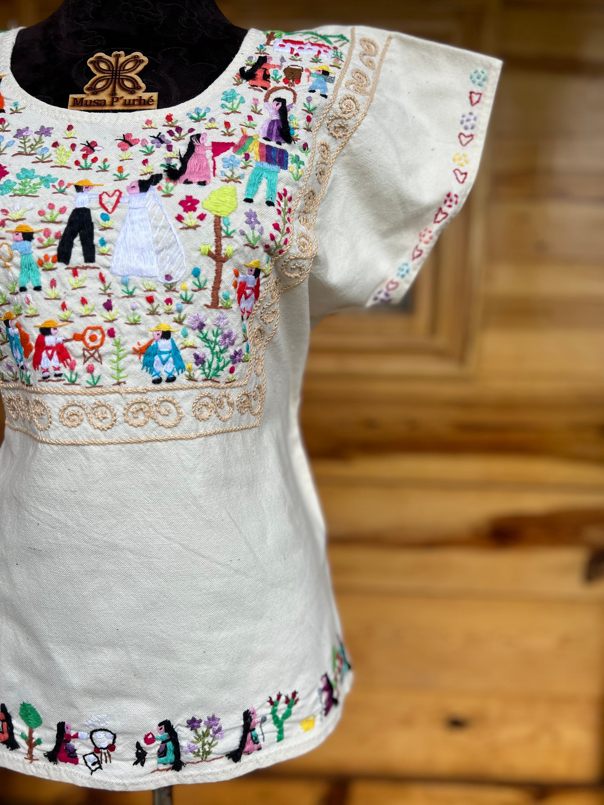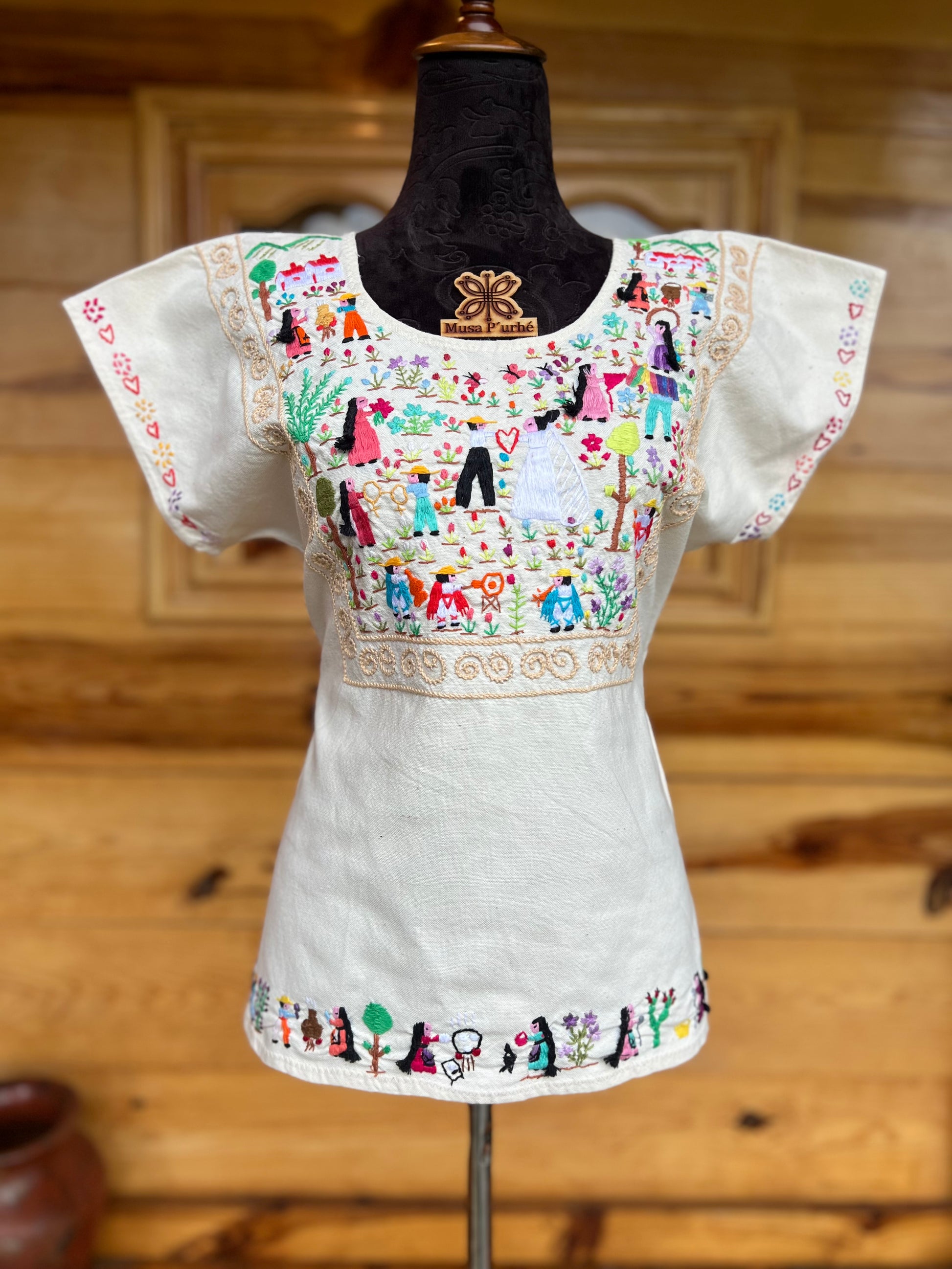 Tejido telar rústico, confeccionado y bordado de historias totalmente a mano.