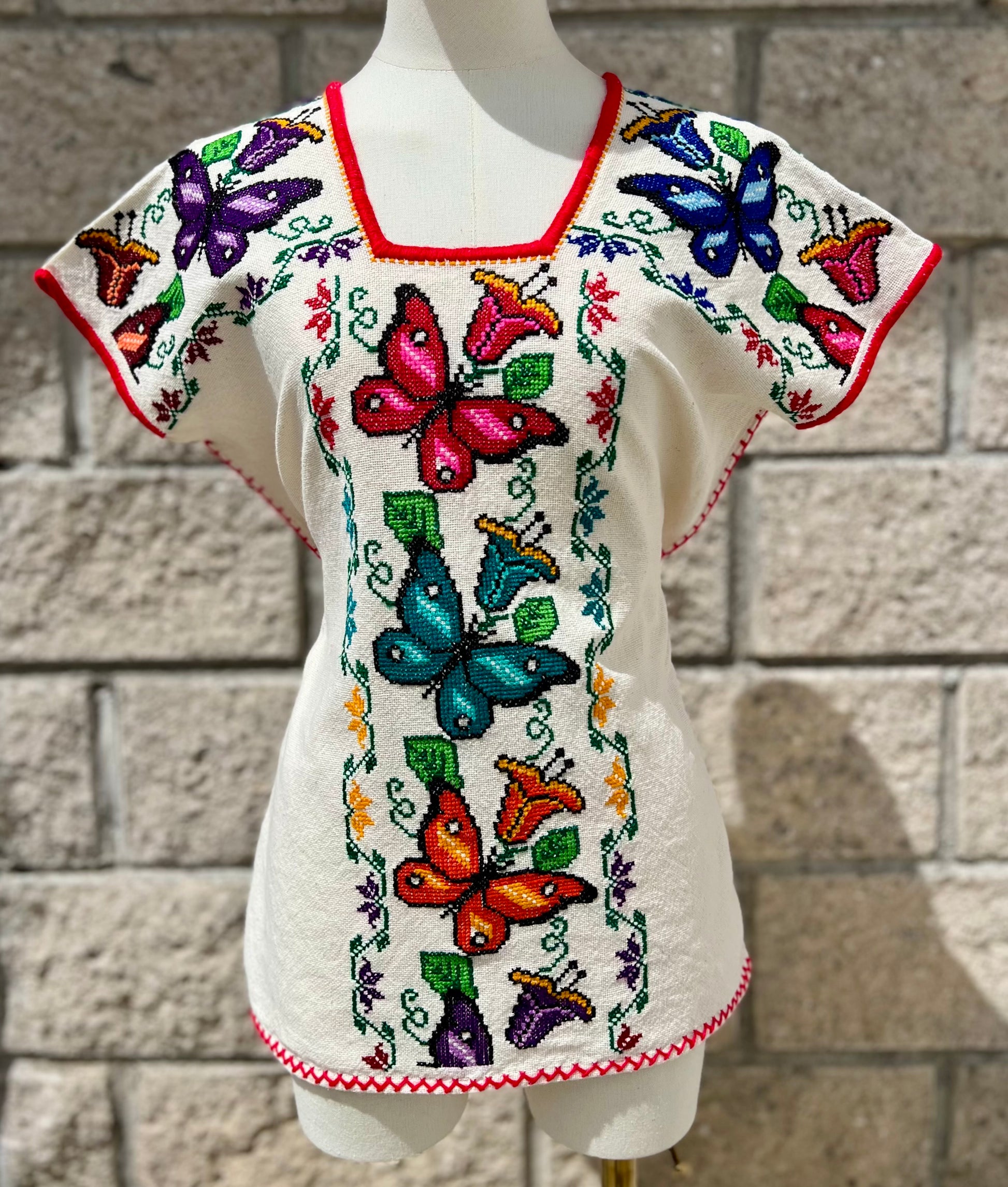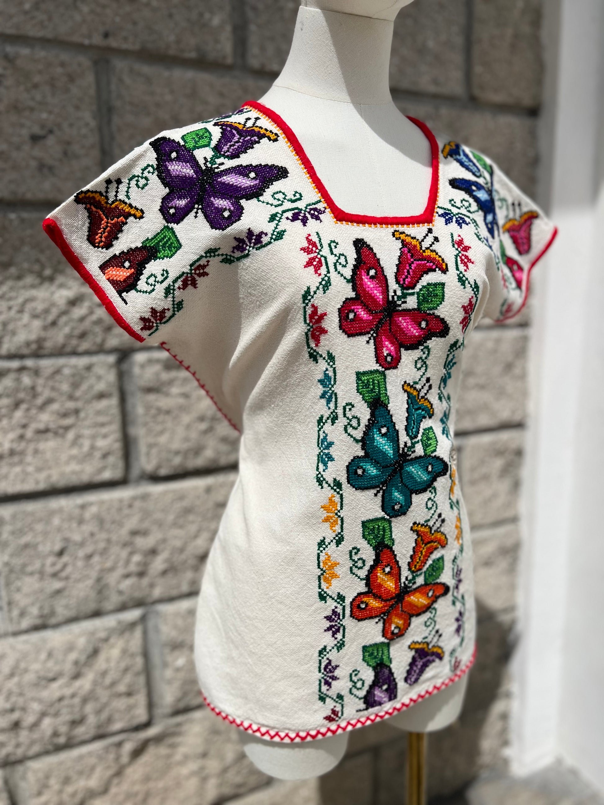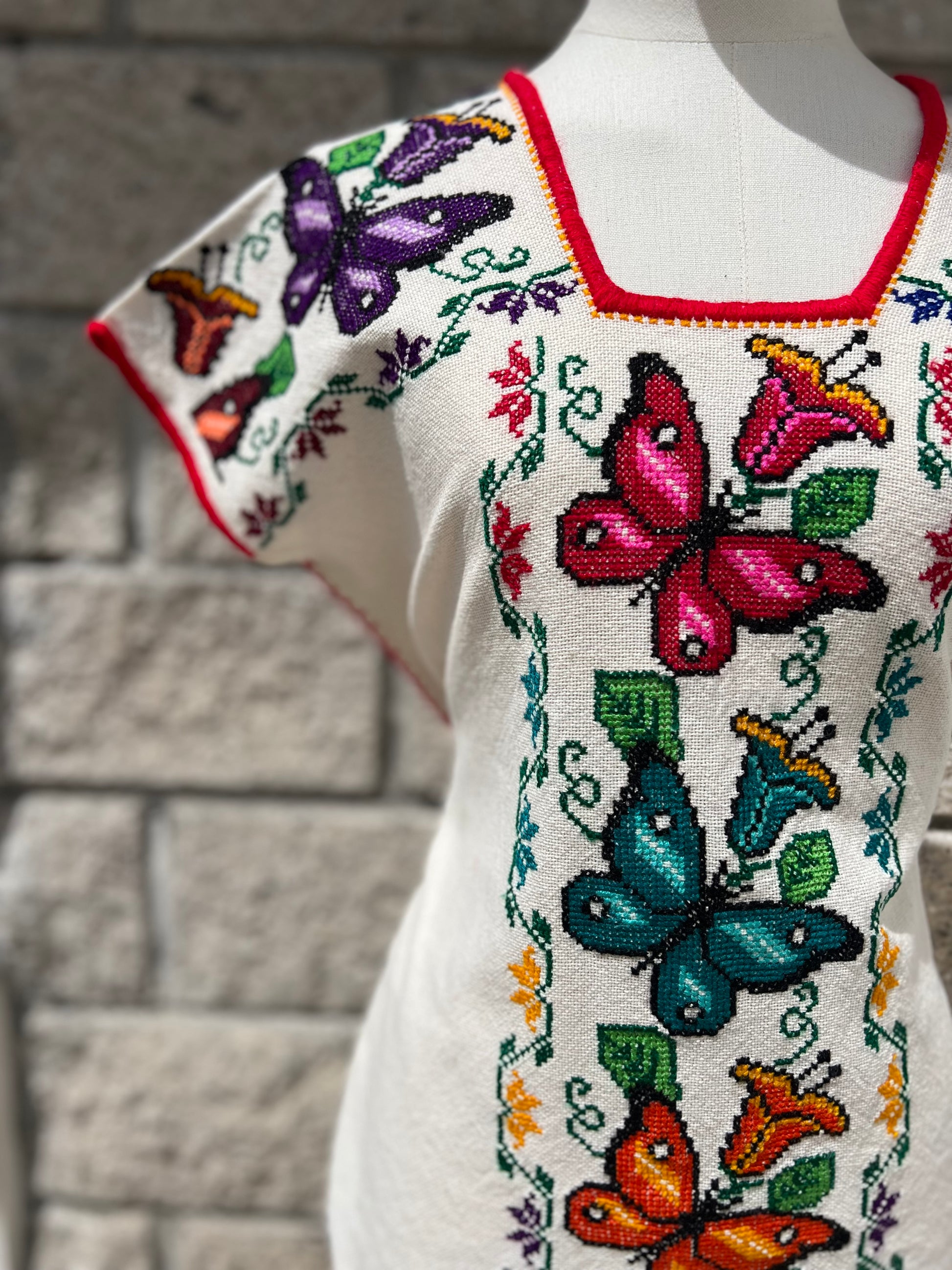 Tejido en telar rústico, confeccionado y bordado en punto de cruz totalmente a mano