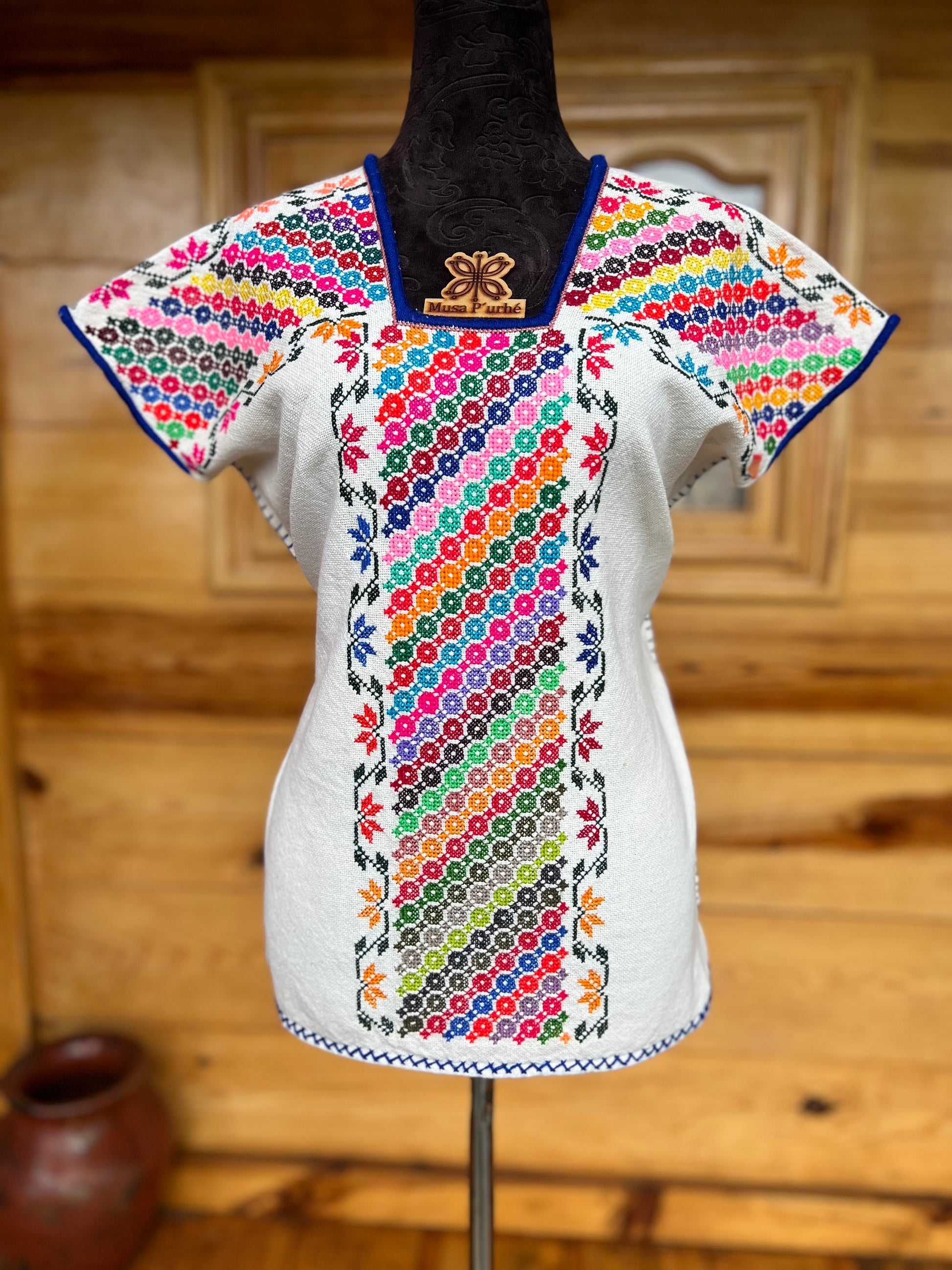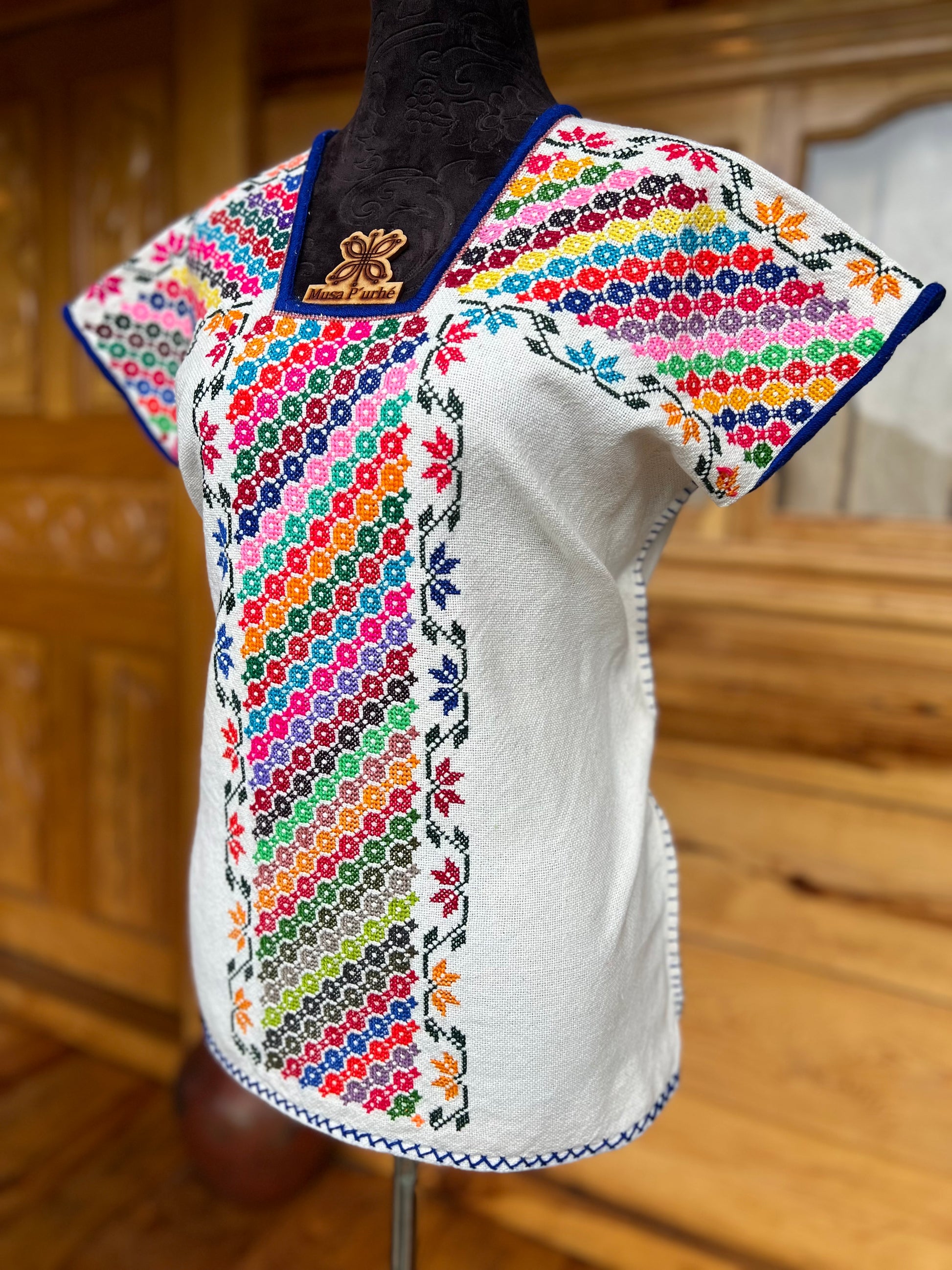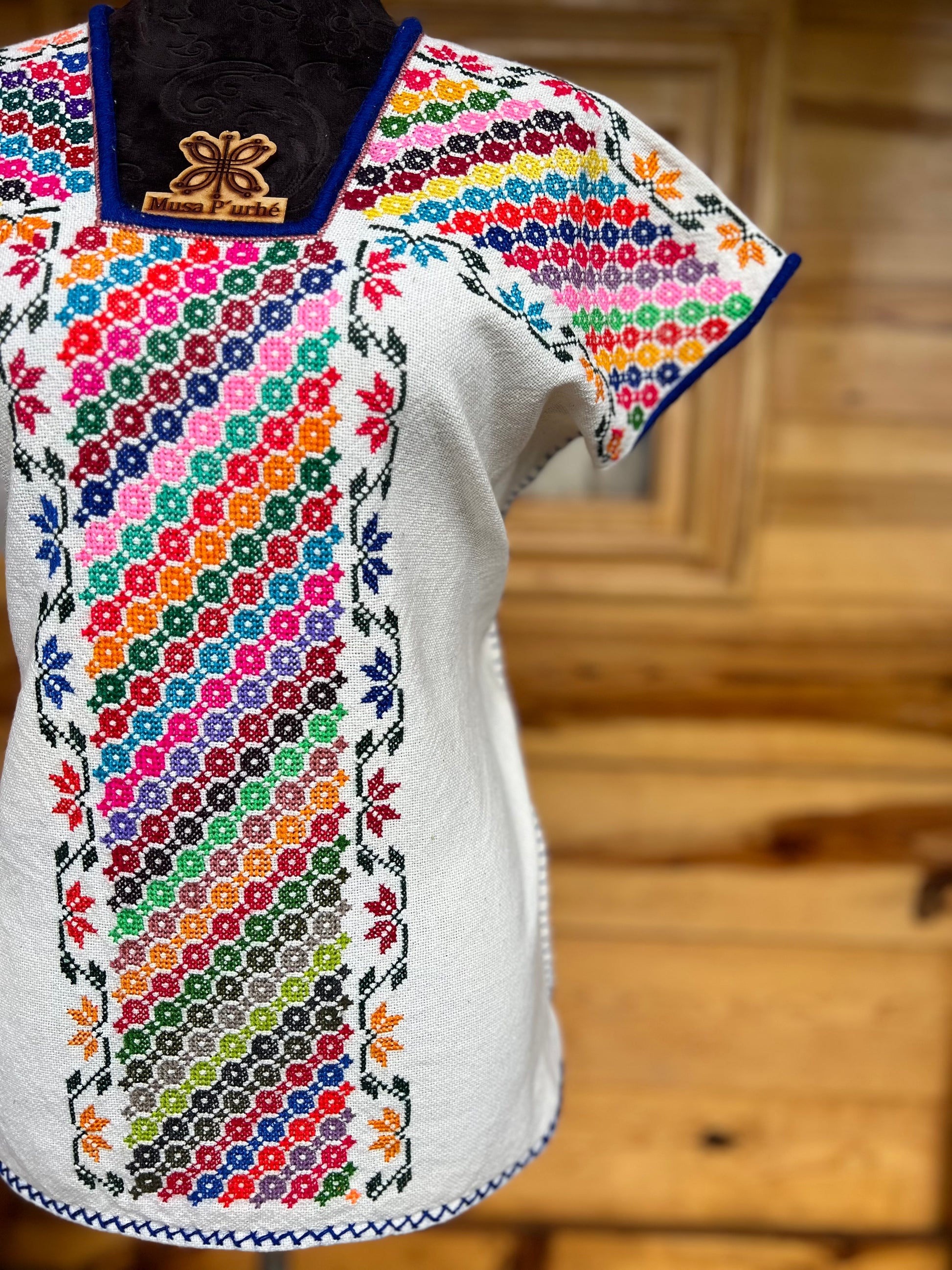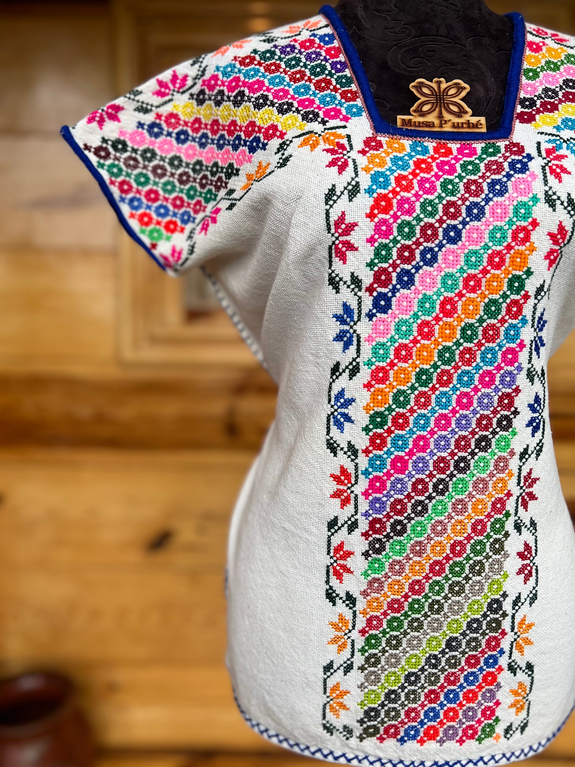 Tejido en telar rústico, confeccionado y bordado en punto de cruz totalmente a mano