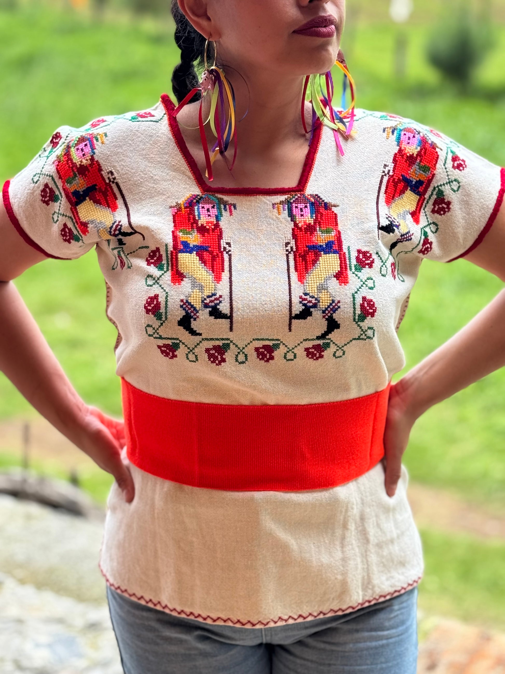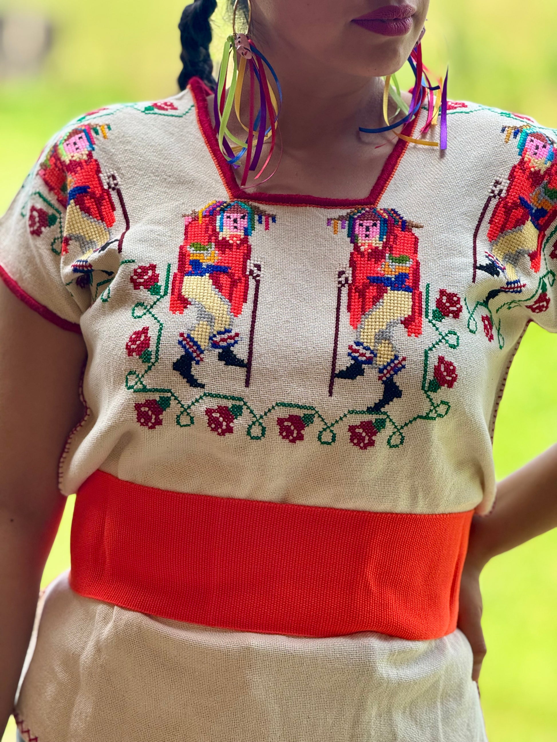 Tejido en telar rústico, confeccionado y bordado en punto de cruz totalmente a mano