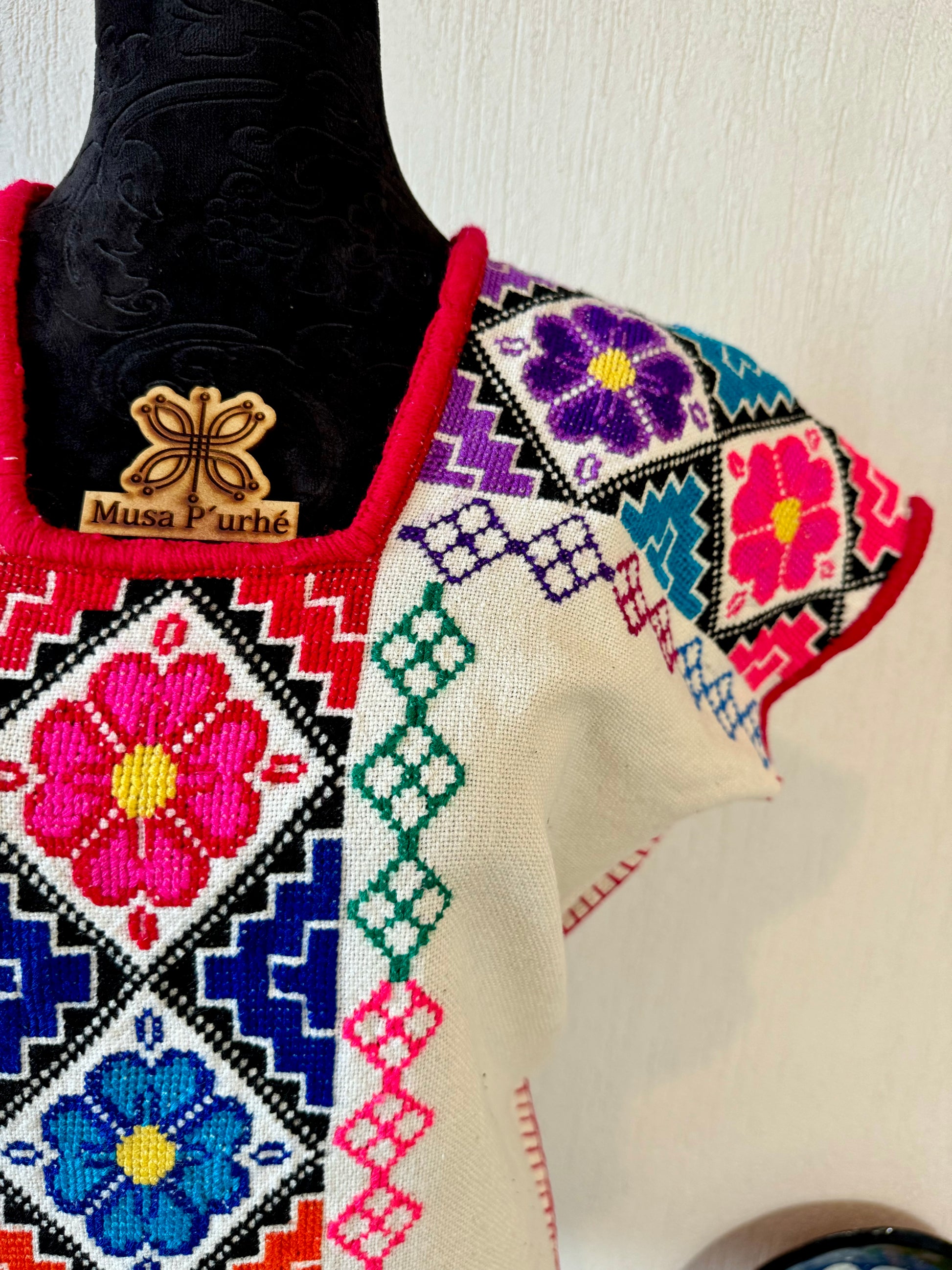 Tejido en telar rústico, confeccionado y bordado en punto de cruz totalmente a mano