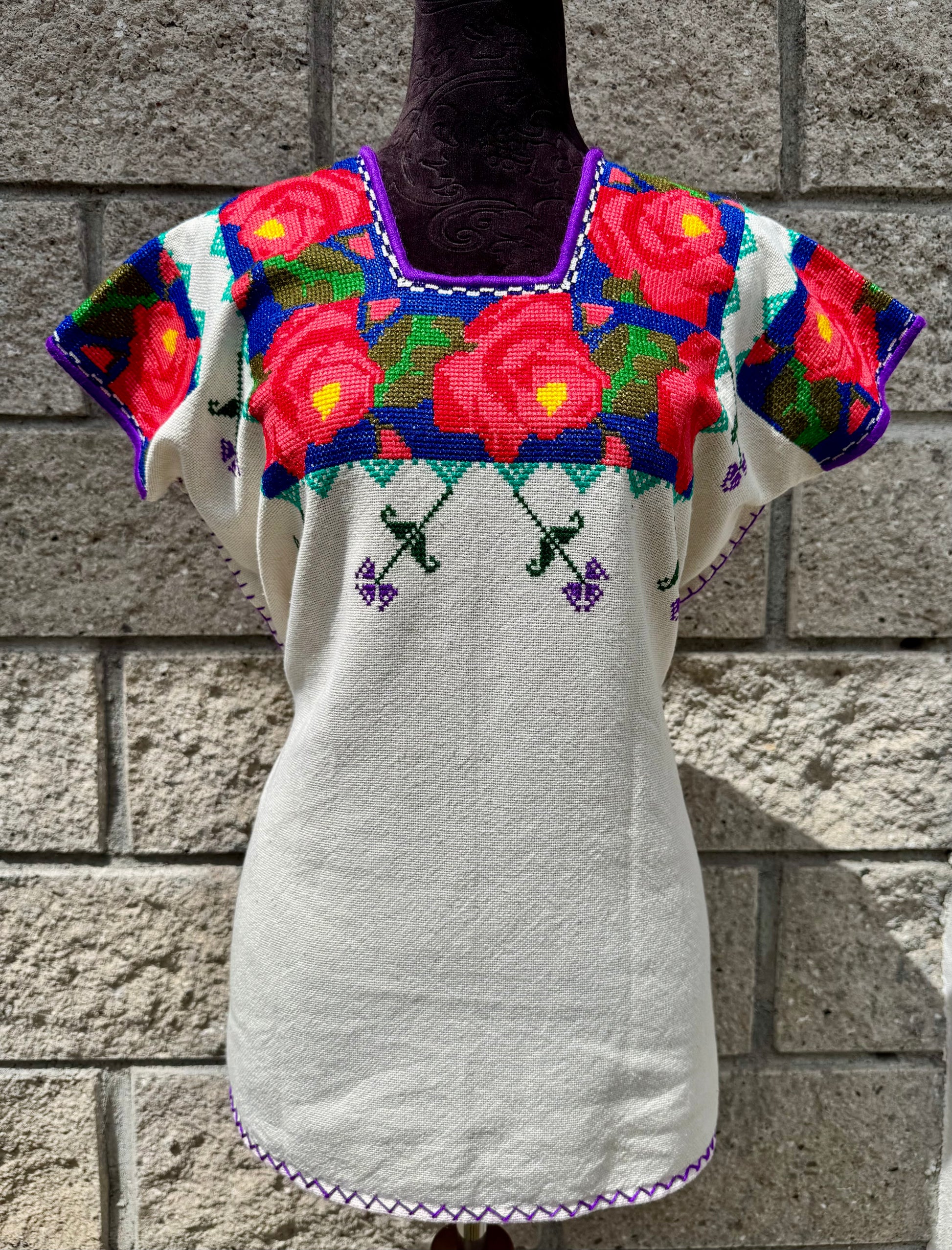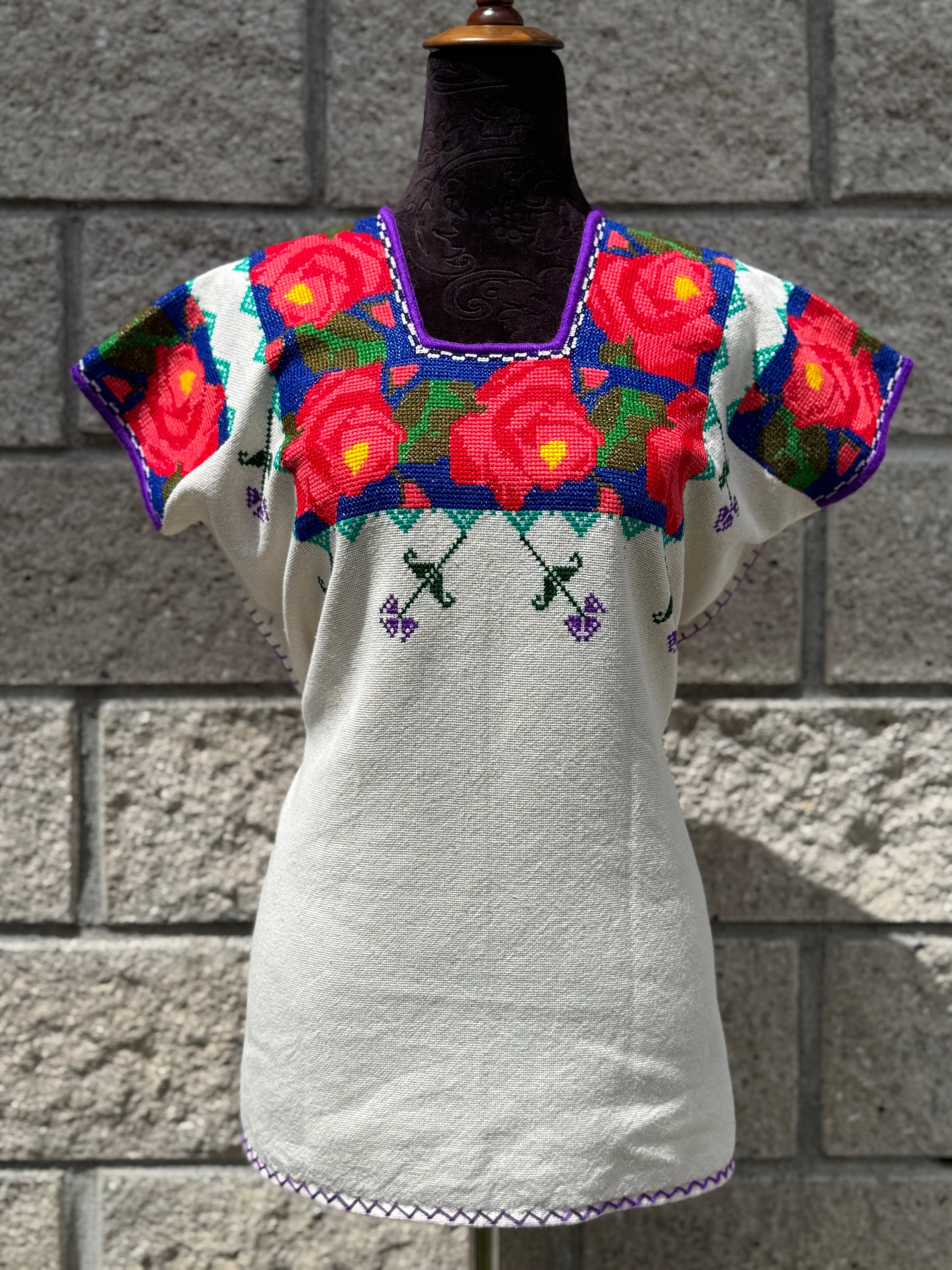 Tejido en telar rústico, confeccionado y bordado en punto de cruz totalmente a mano
