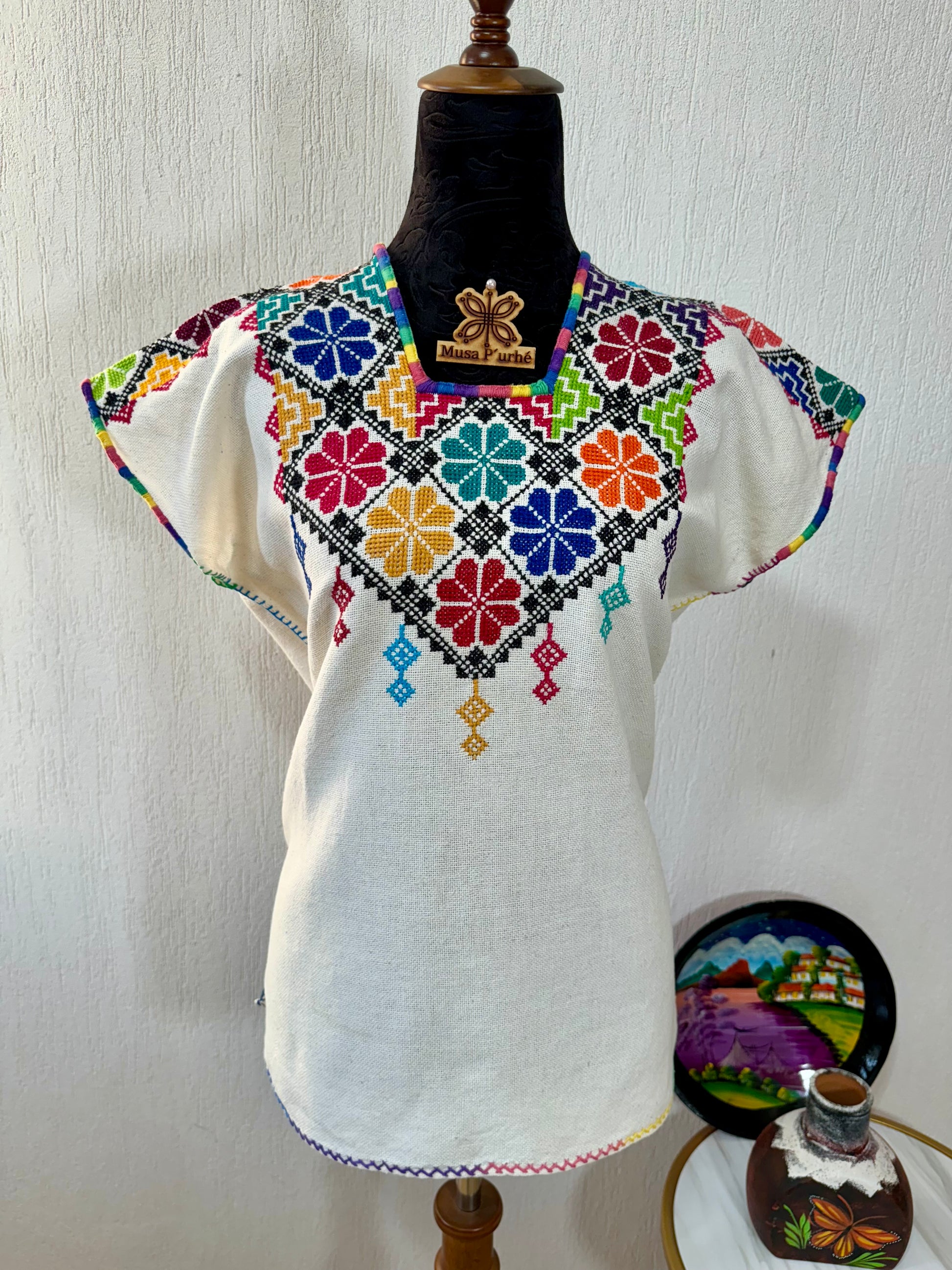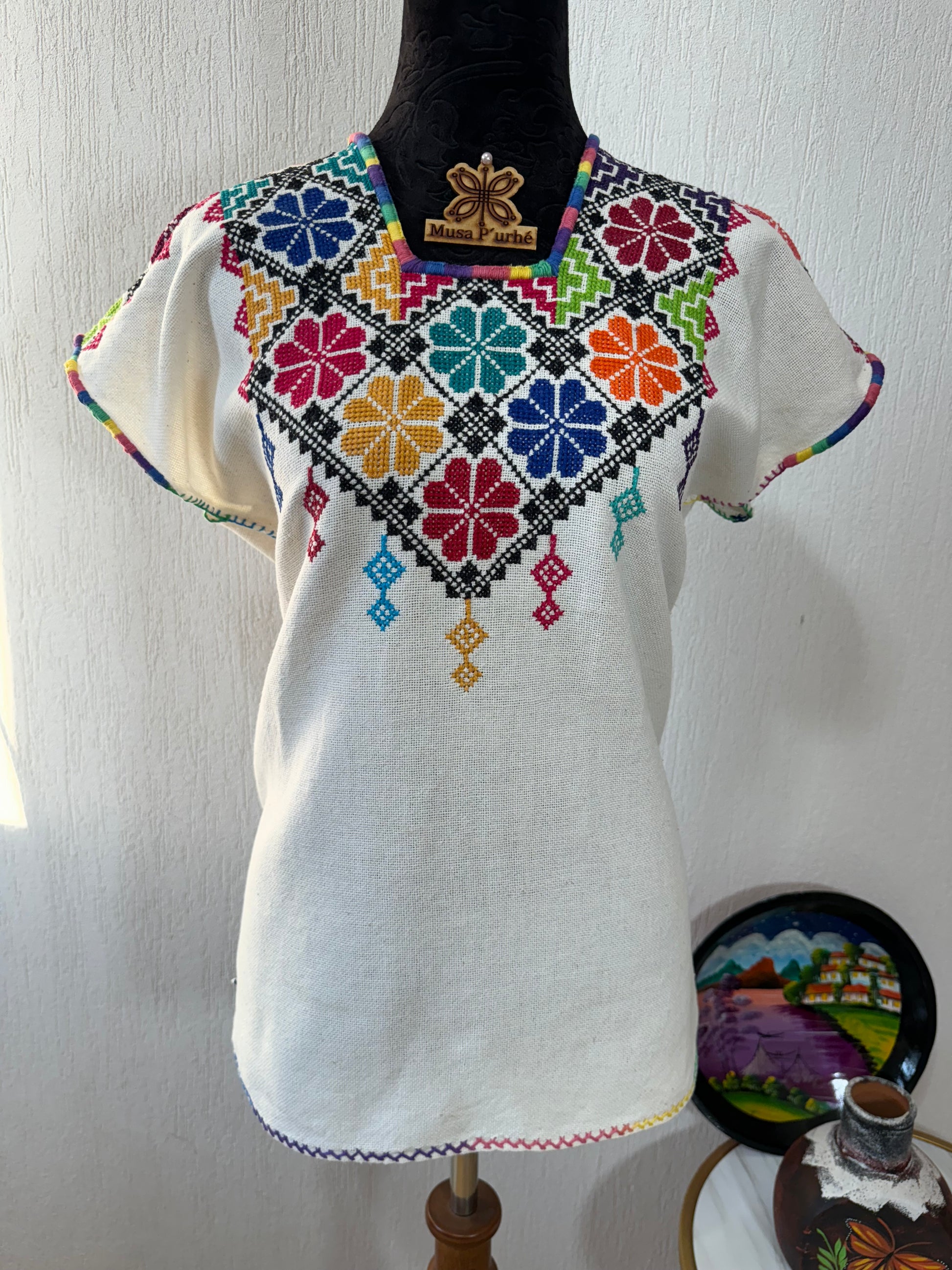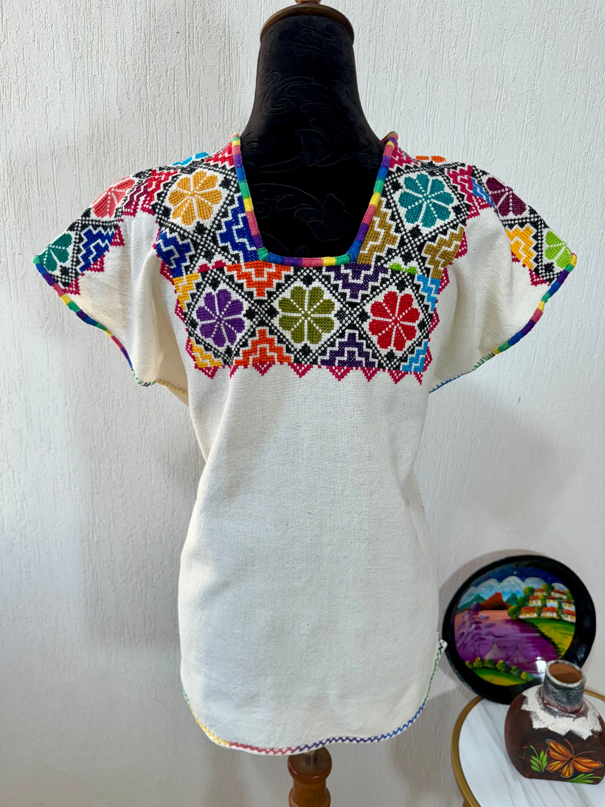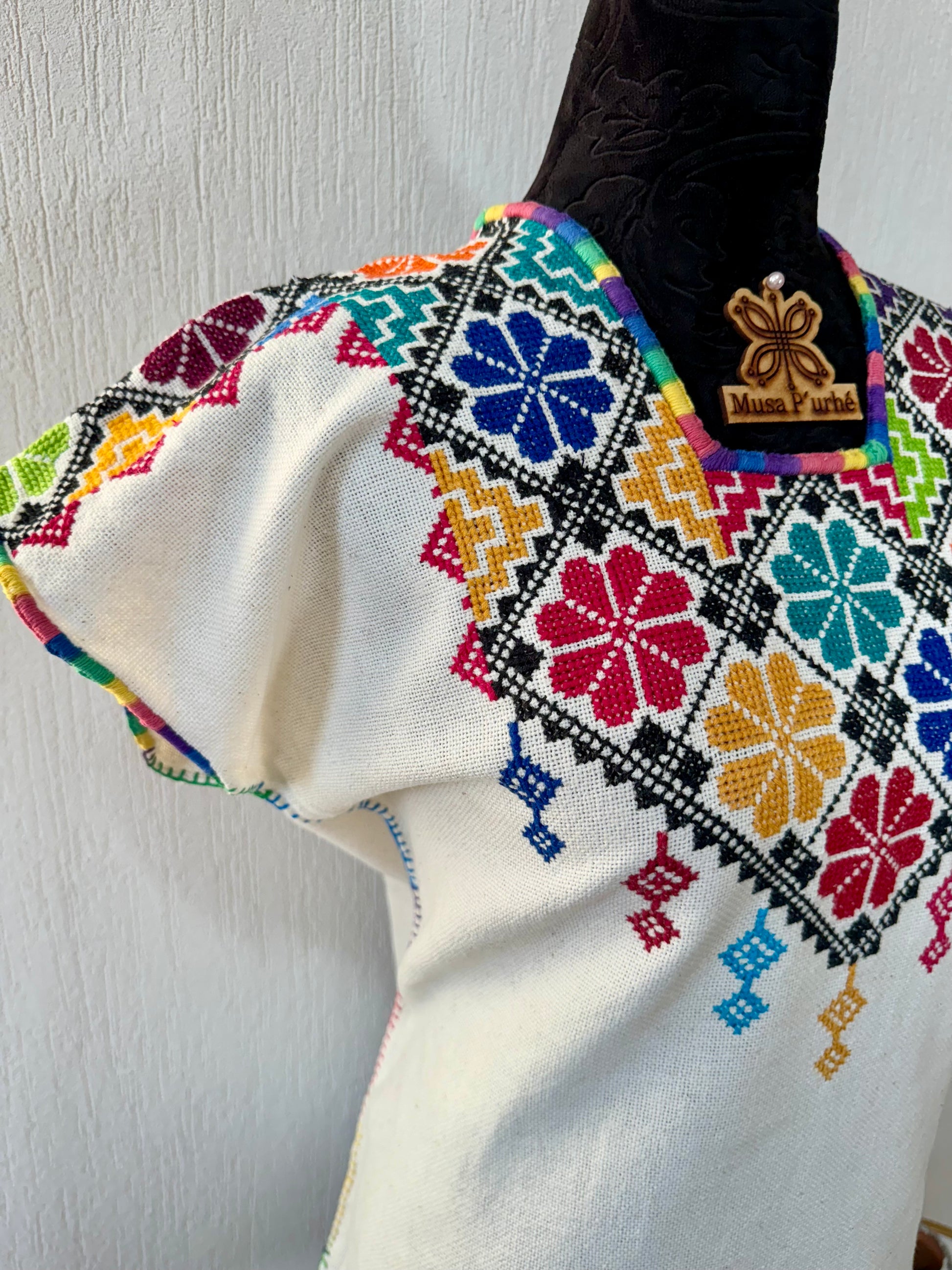 Tejido en telar rústico, confeccionado y bordado en punto de cruz totalmente a mano por ambos lados