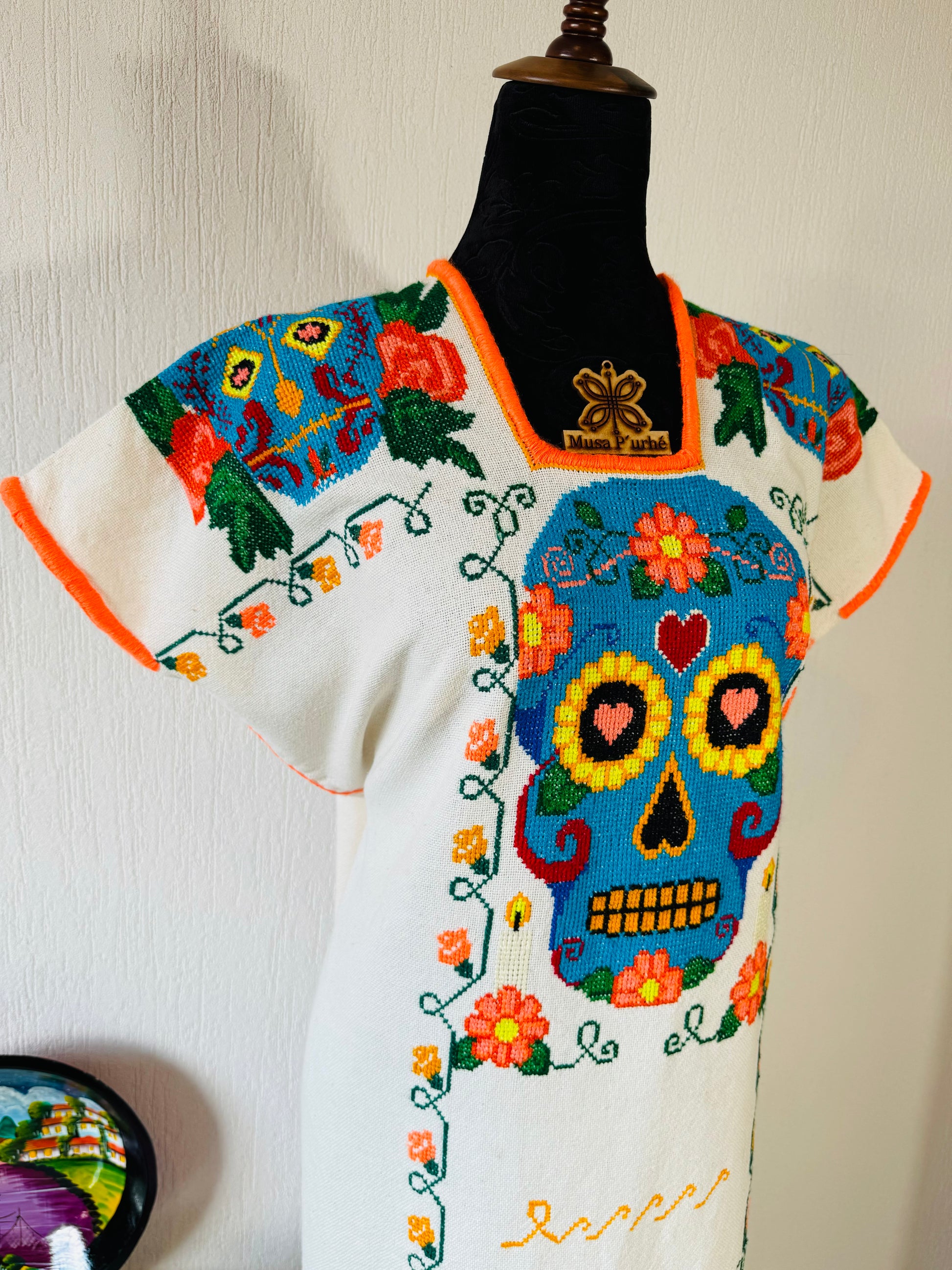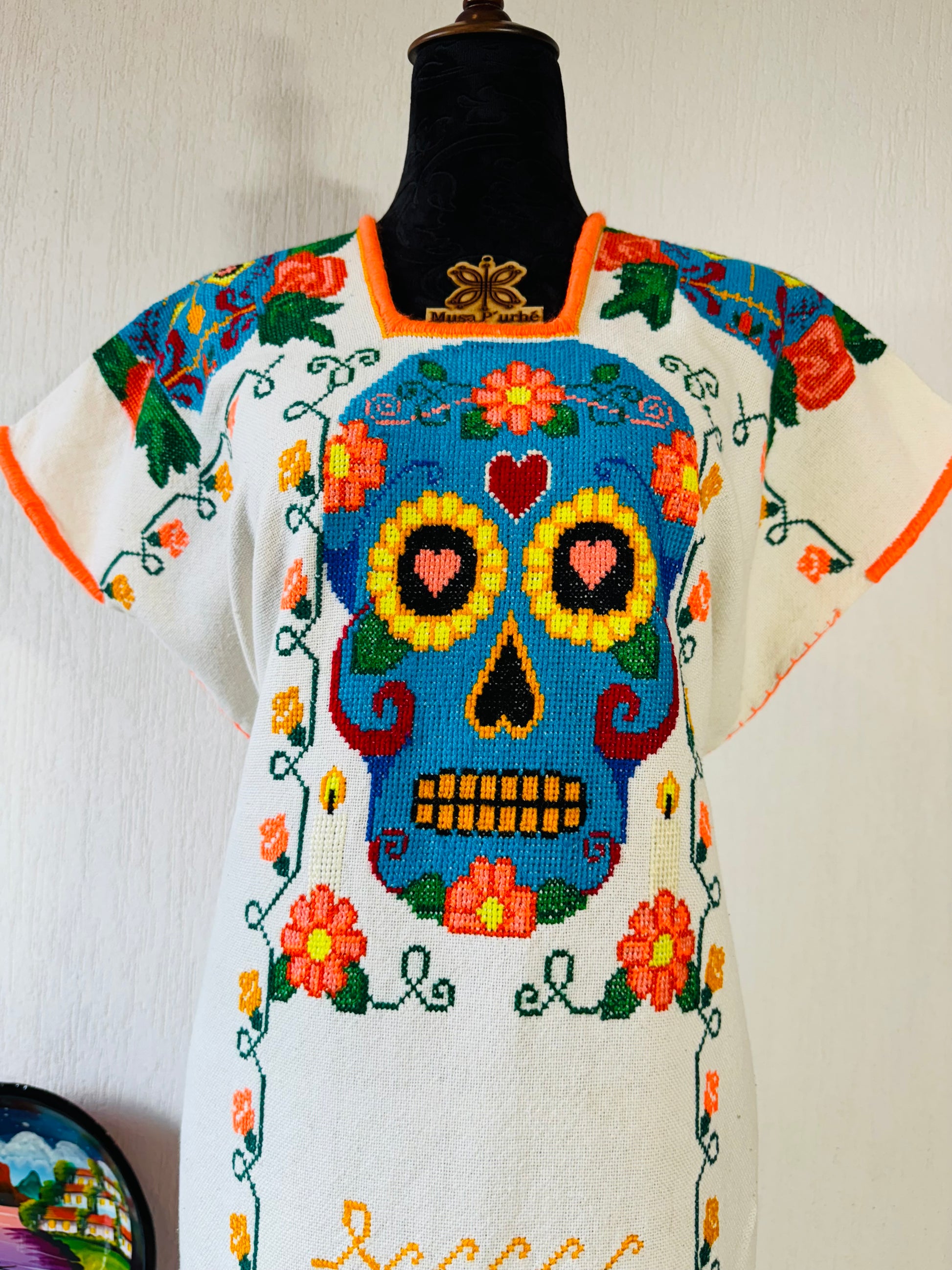 Tejido en telar rústico, confeccionado y bordado en punto de cruz totalmente a mano