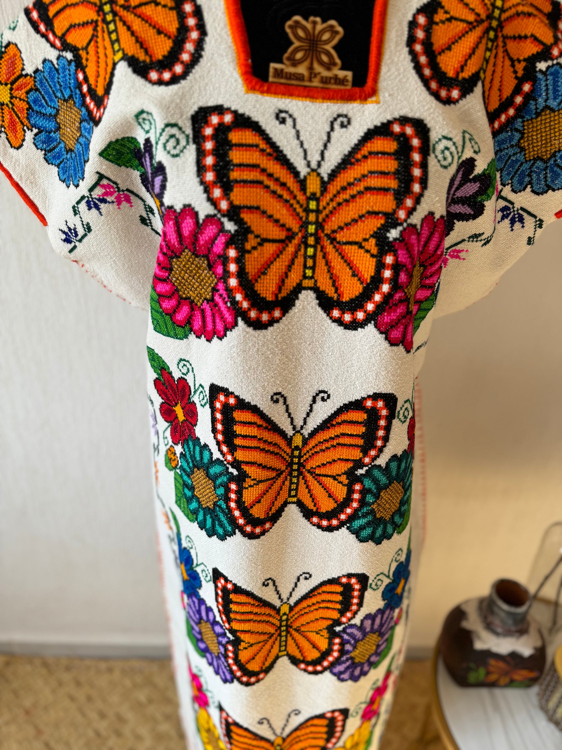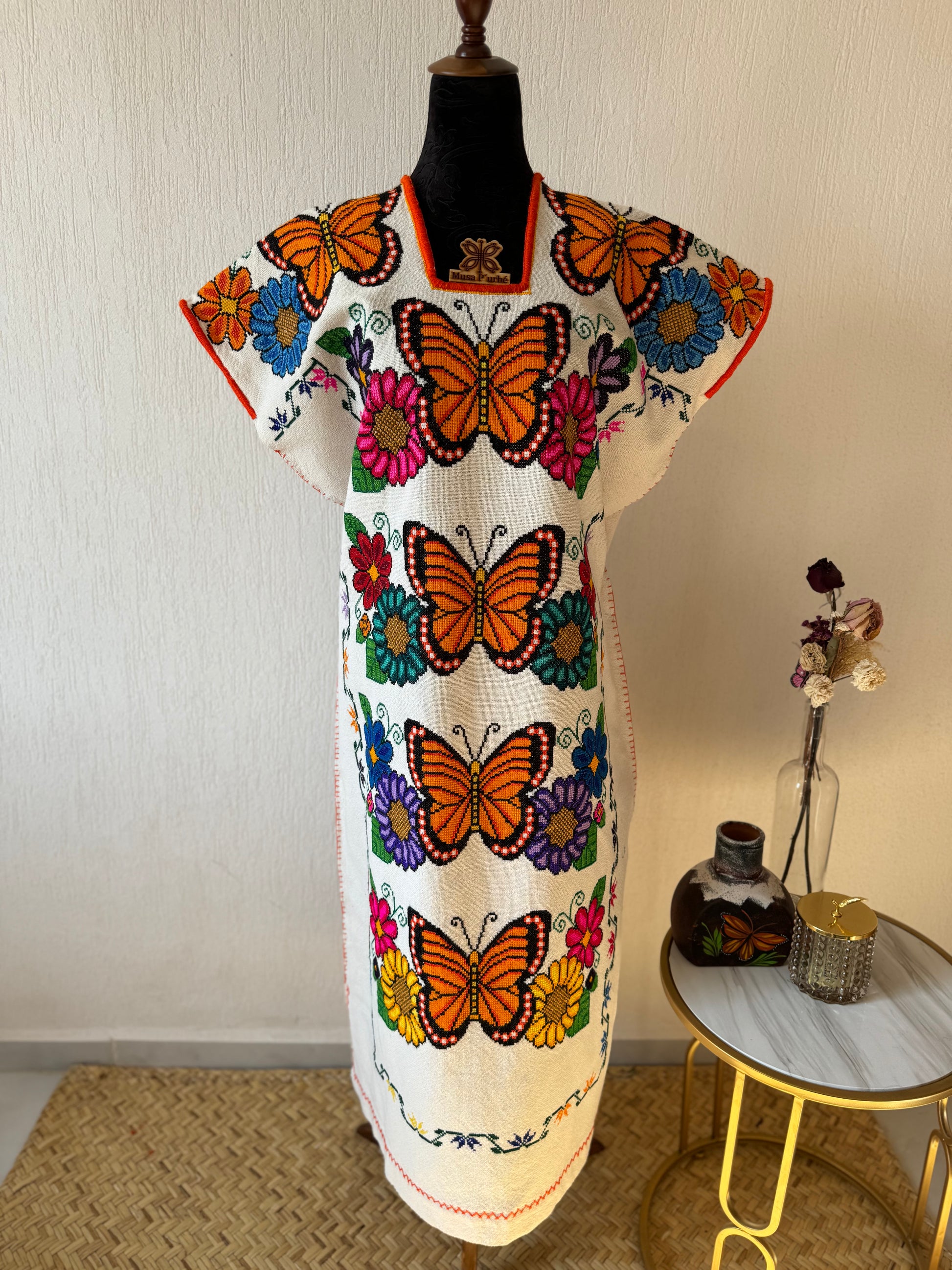 Tejido en telar rústico, confeccionado y bordado en punto de cruz totalmente a mano