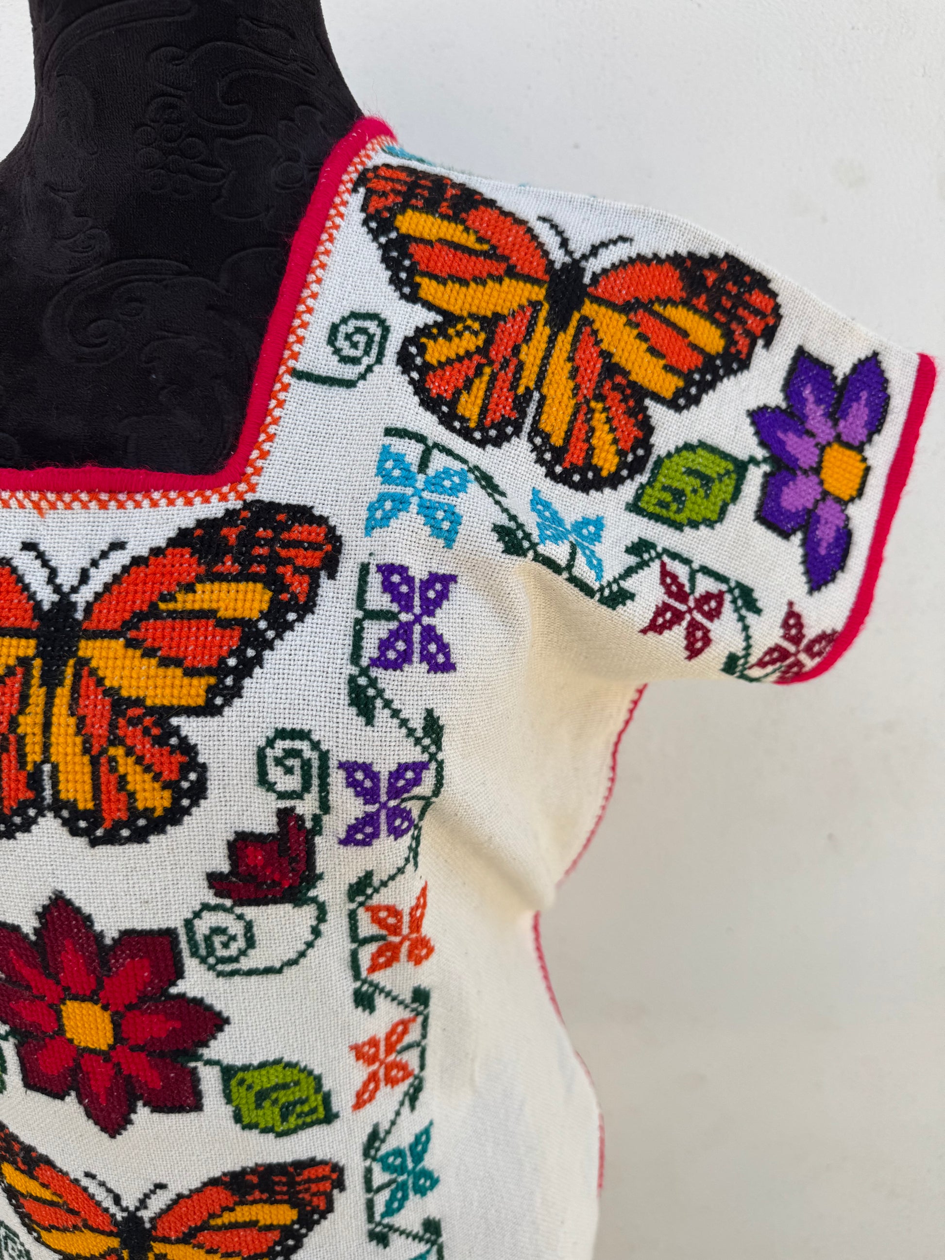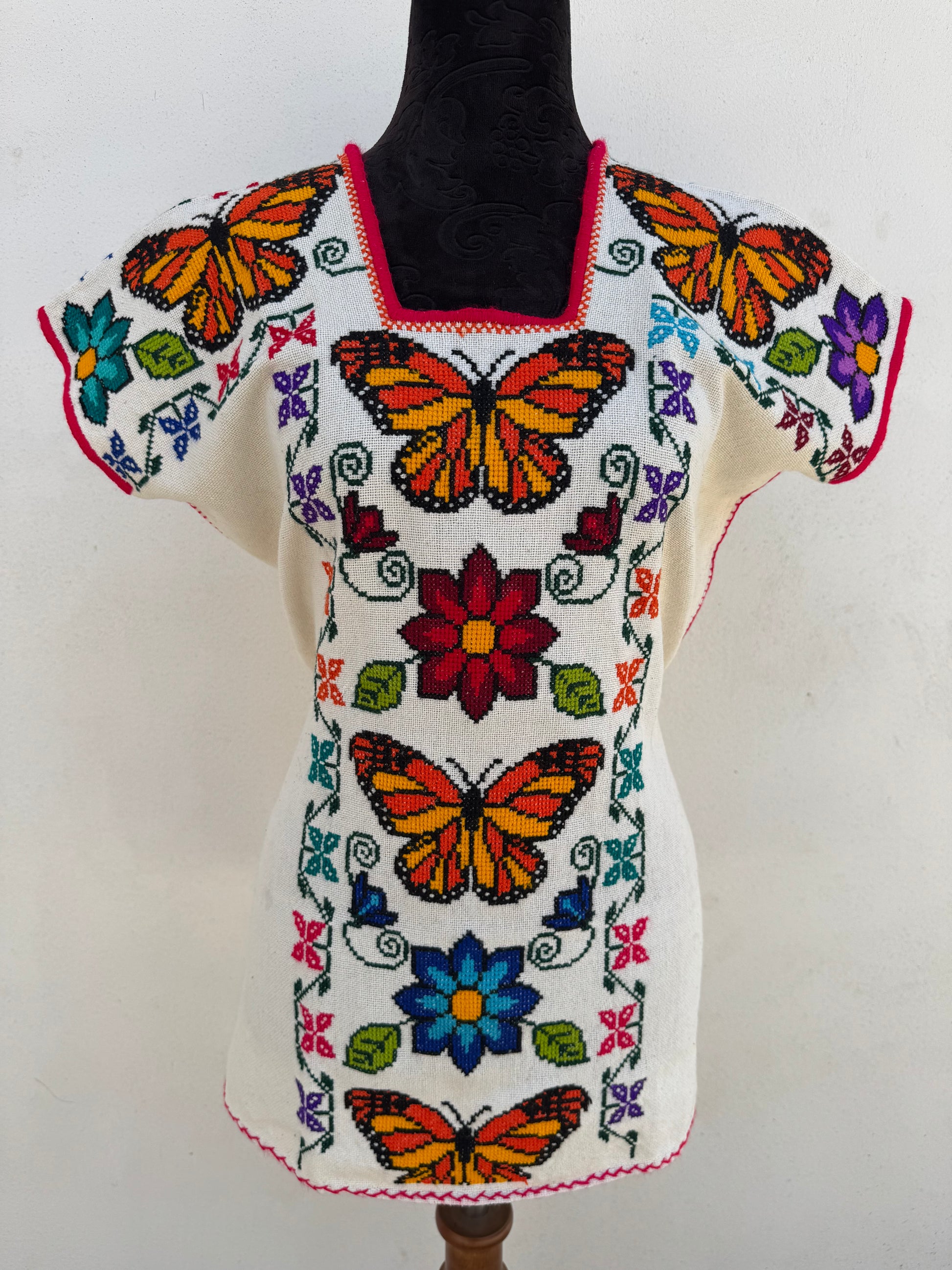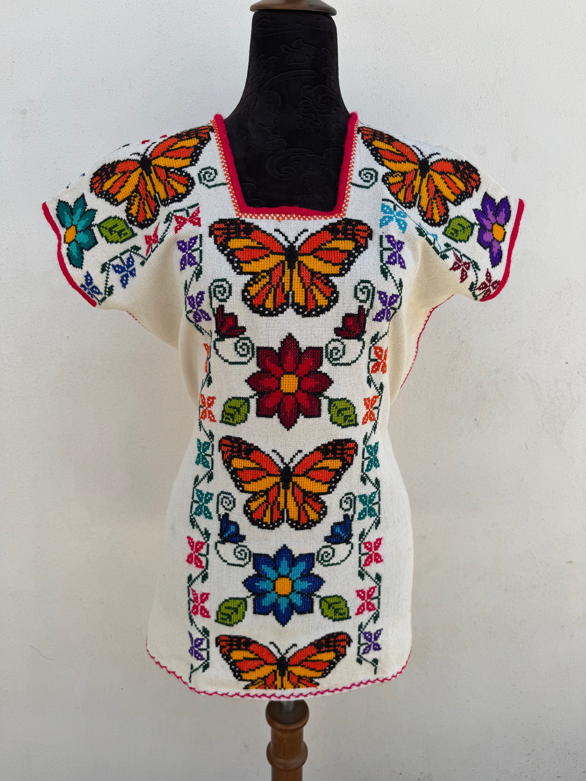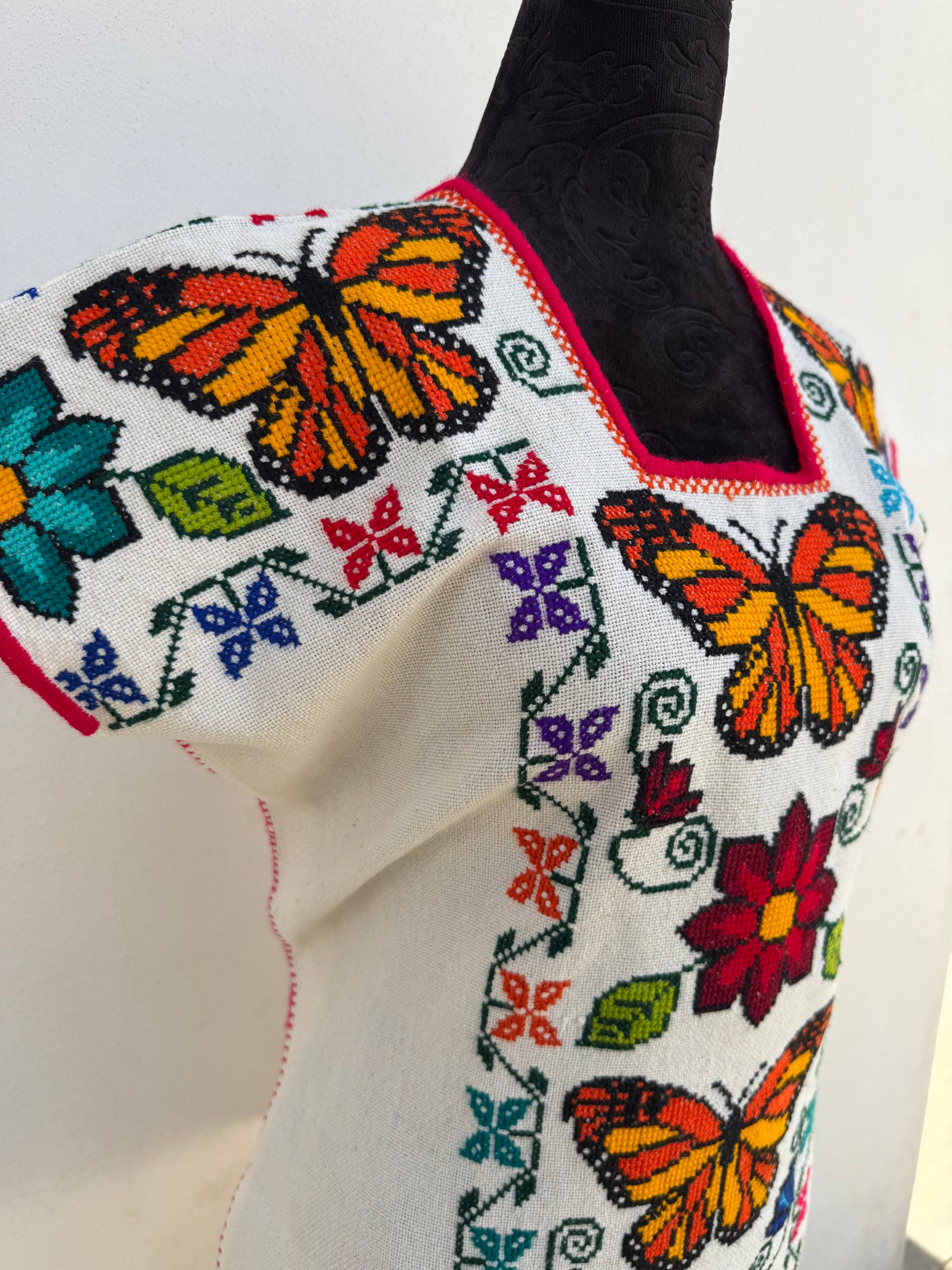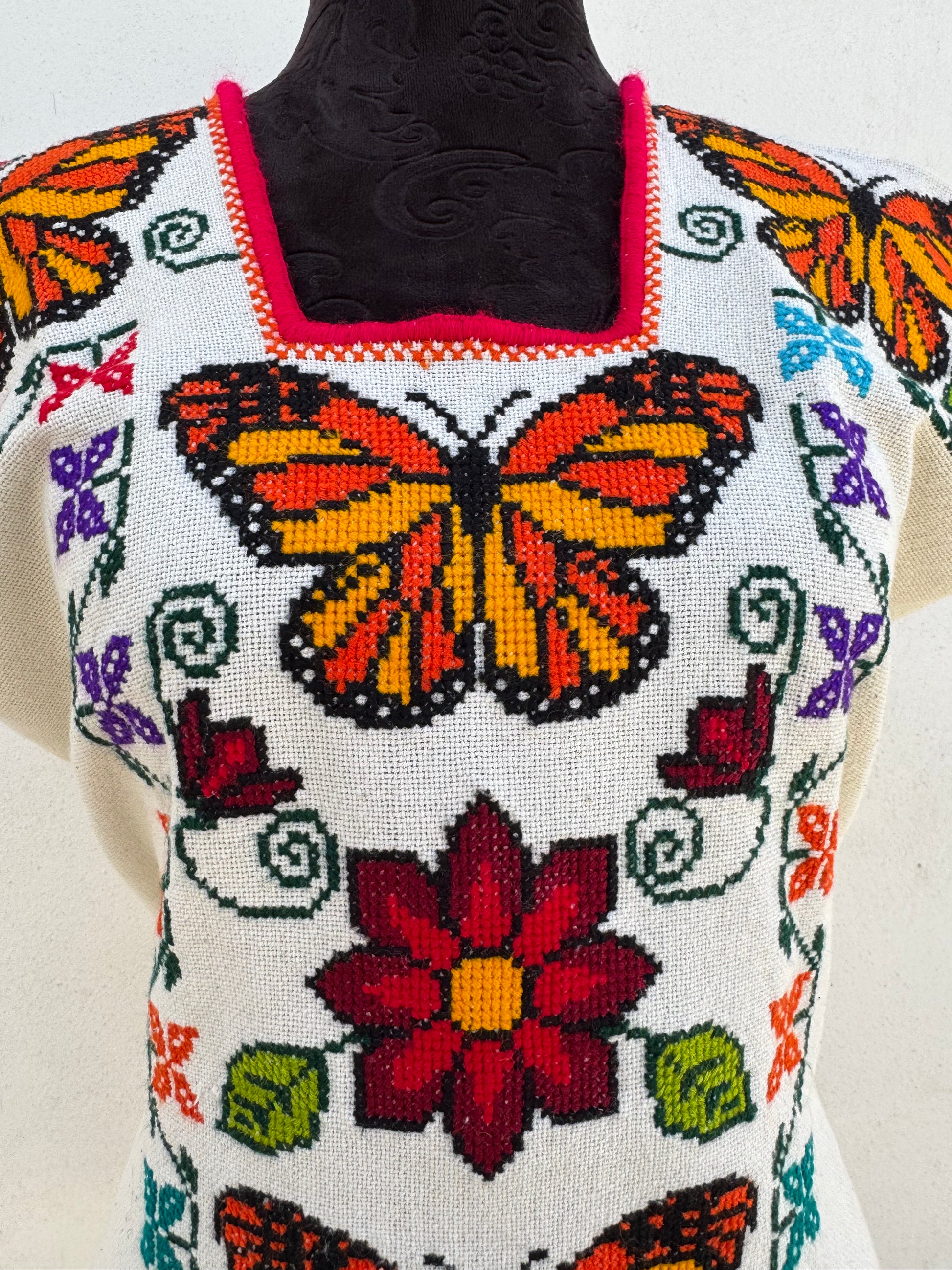 Tejido en telar rústico, confeccionado y bordado en punto de cruz totalmente a mano