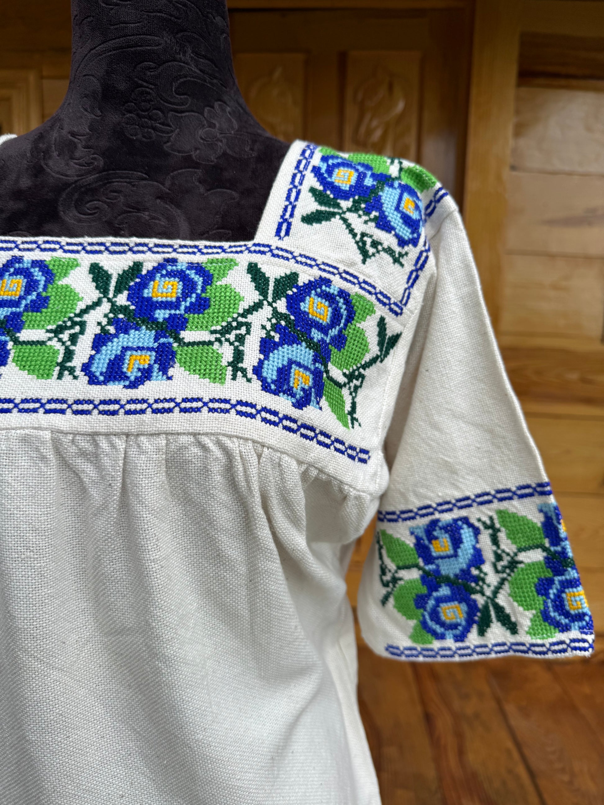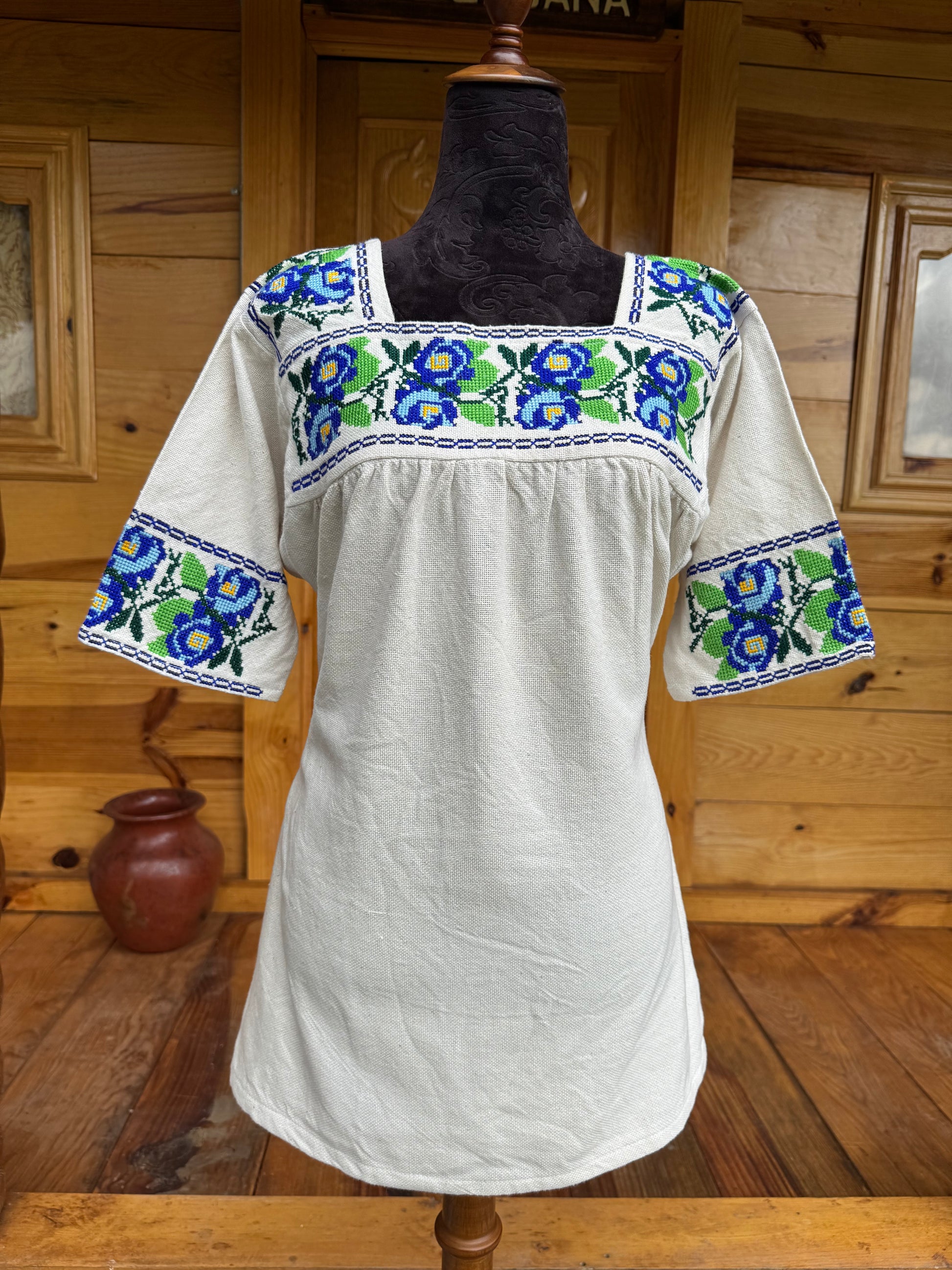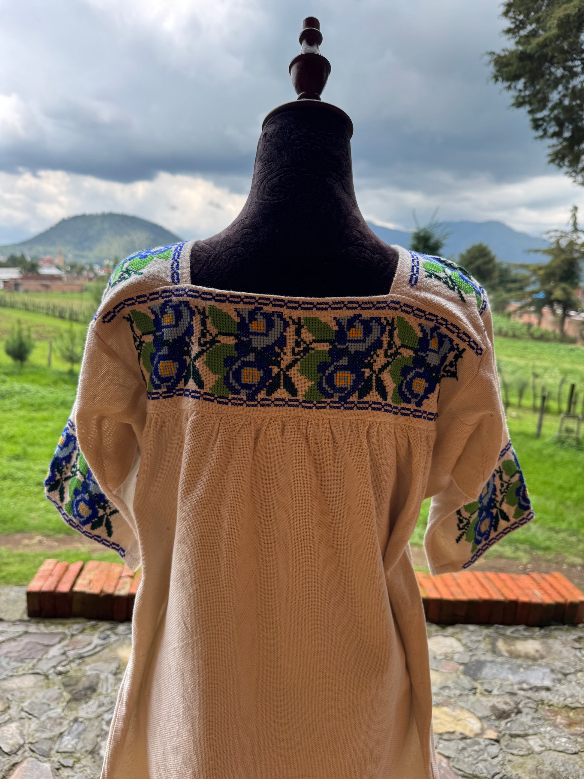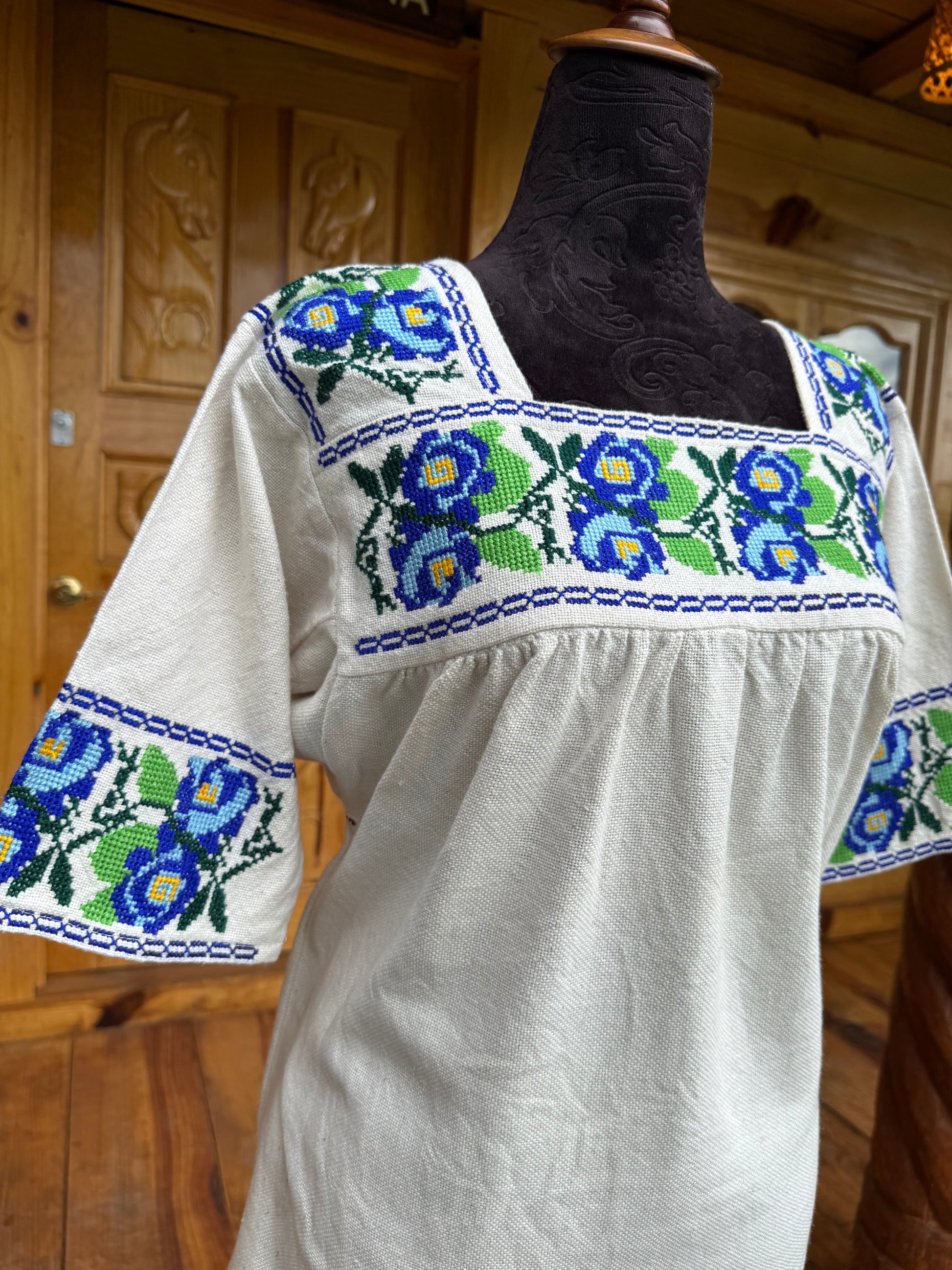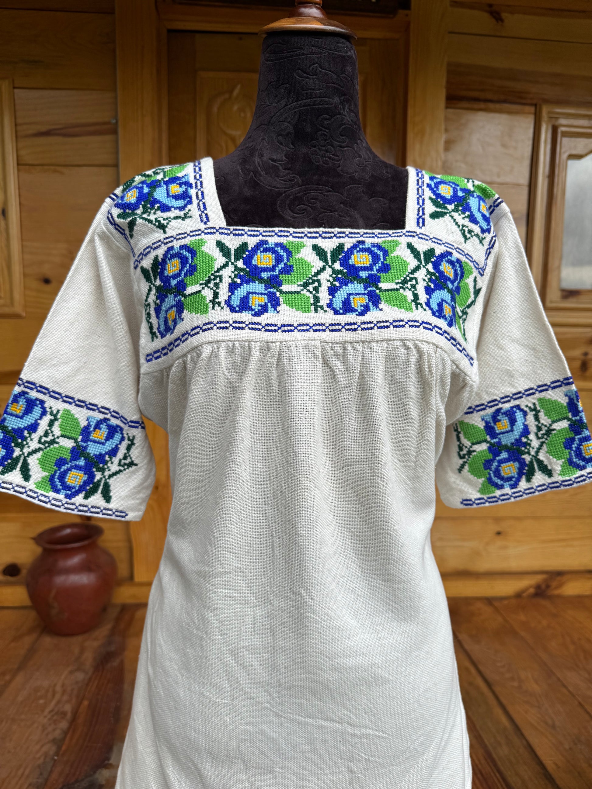 Tejido en telar rústico, confeccionado y bordado en punto de cruz totalmente a mano por ambos lados y mangas