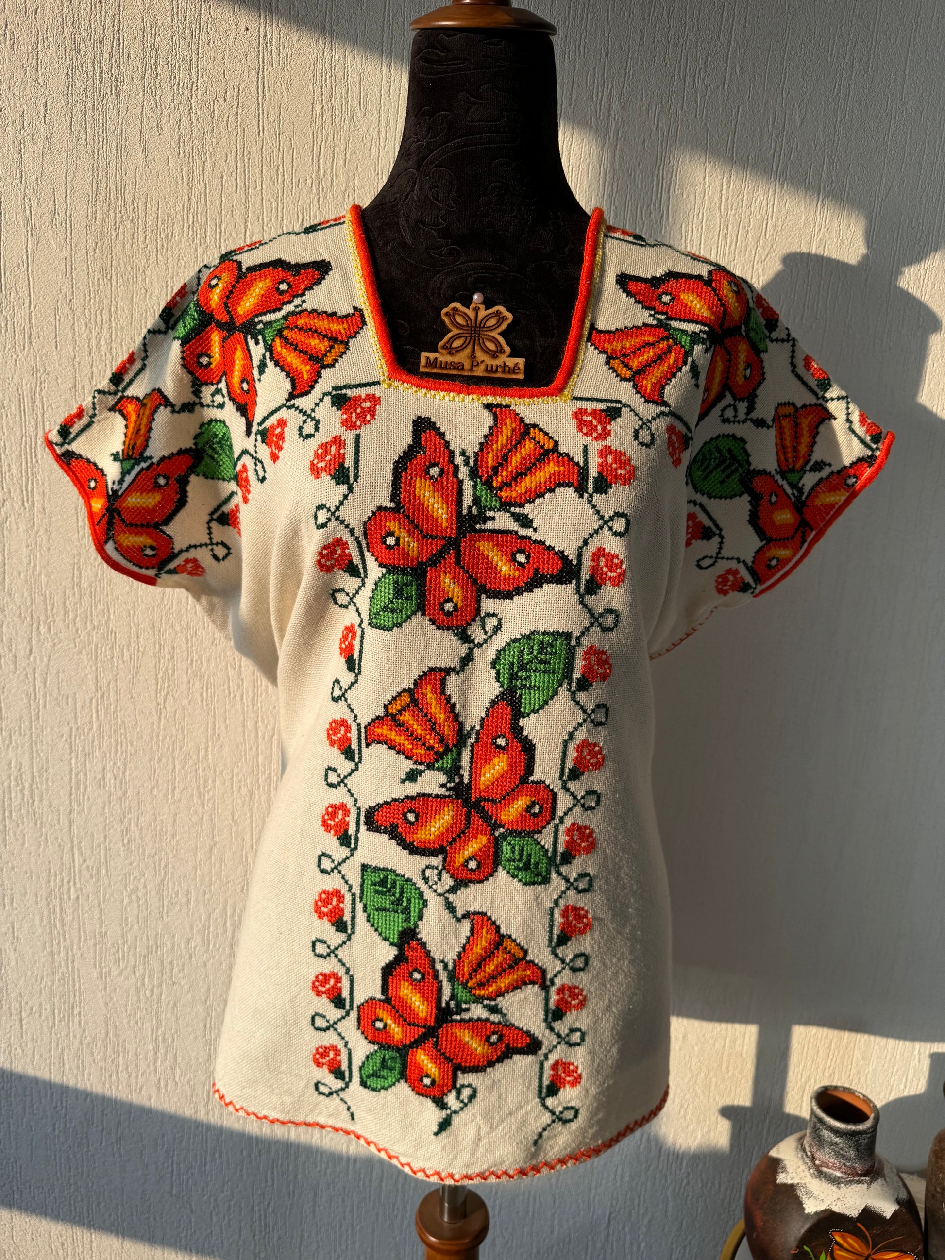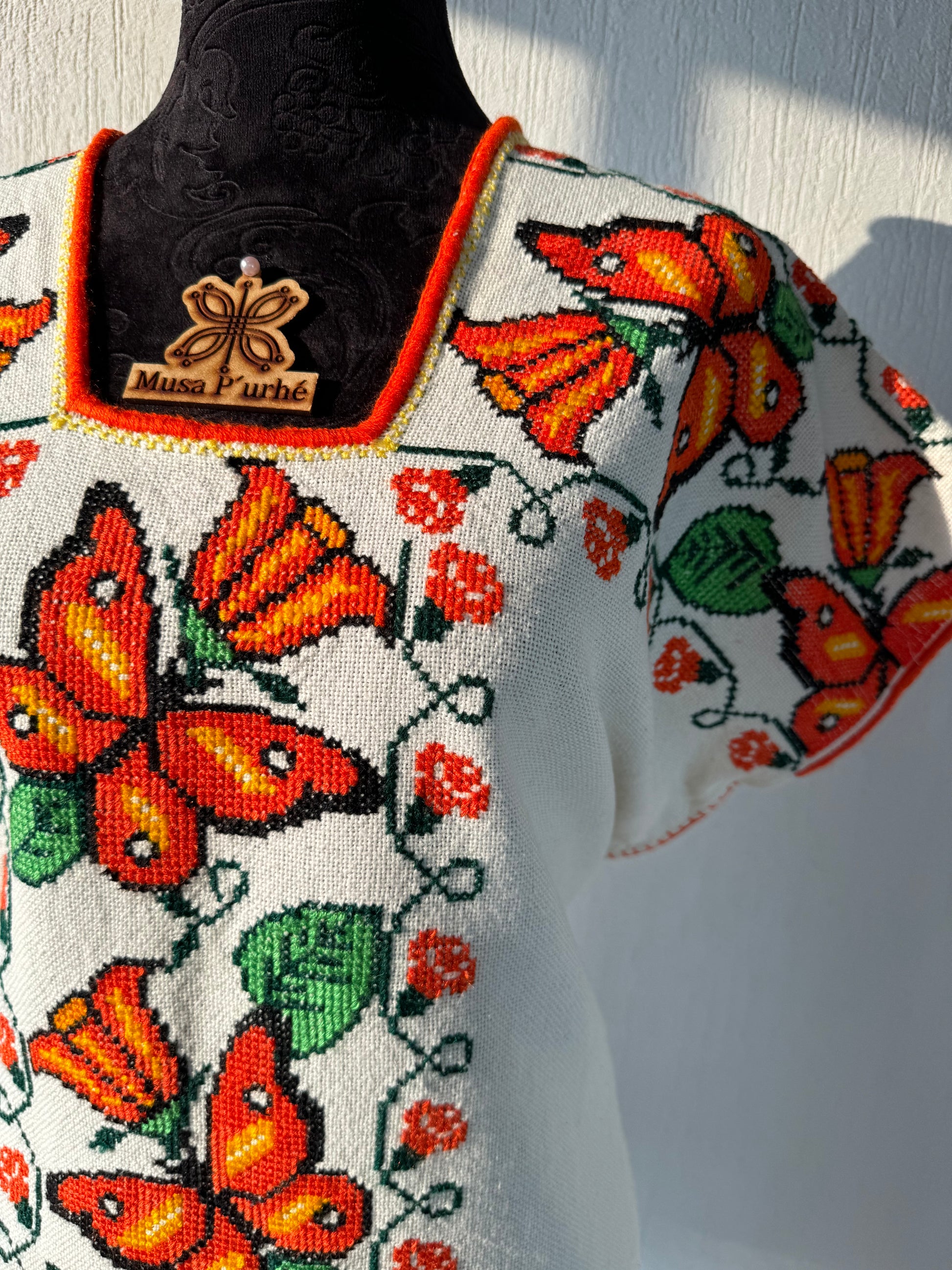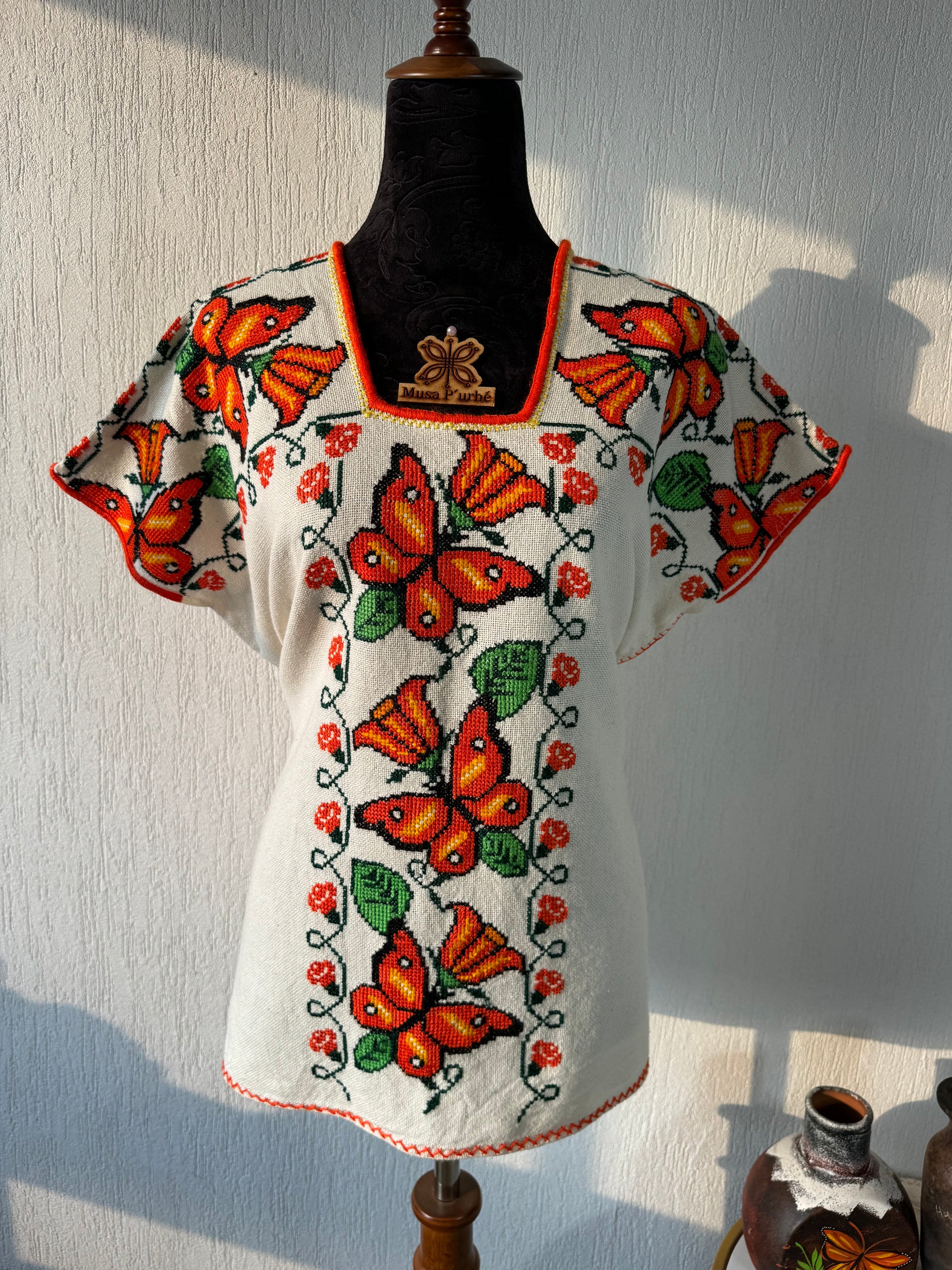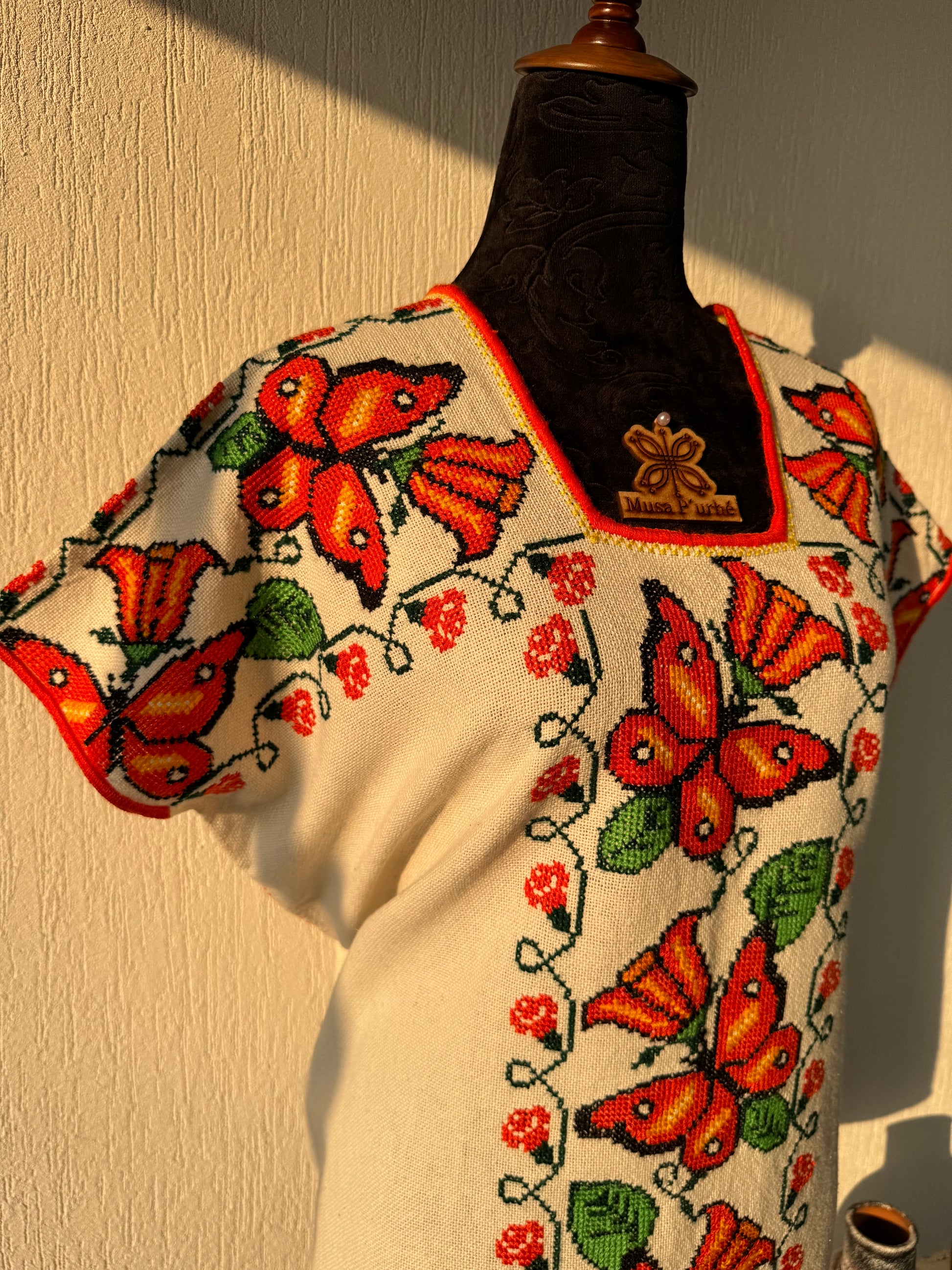 Tejido en telar rústico, confeccionado y bordado en punto de cruz totalmente a mano