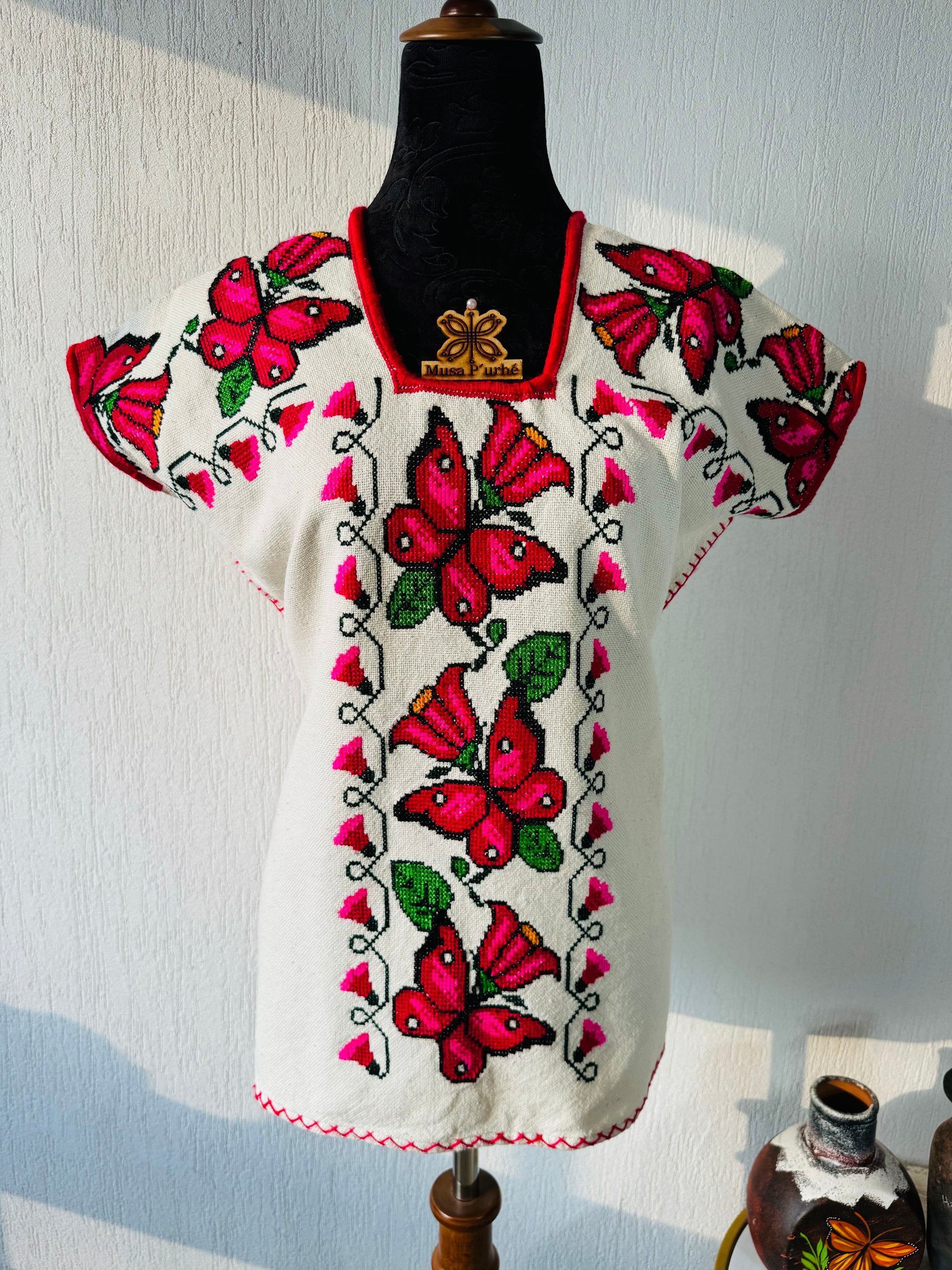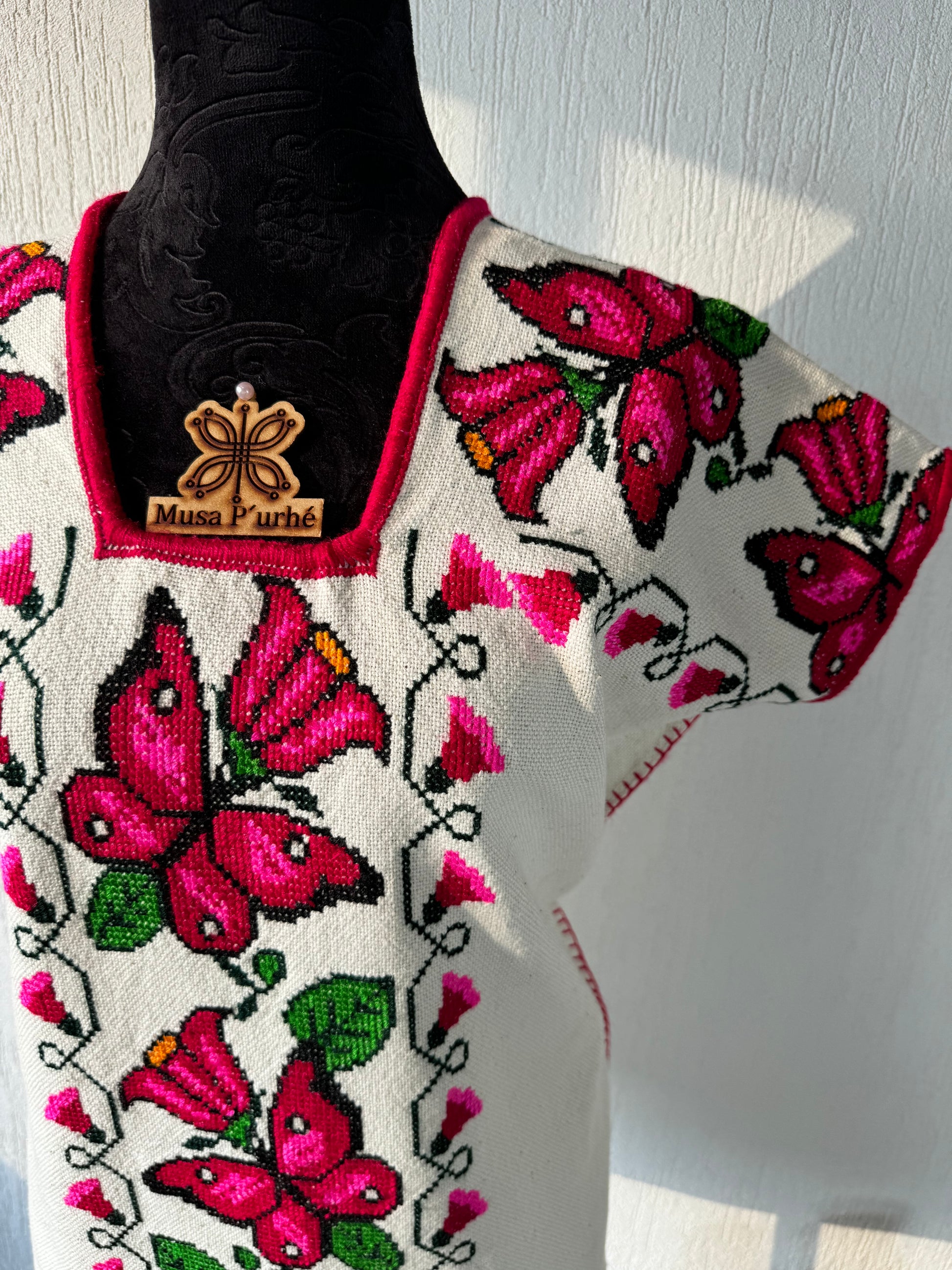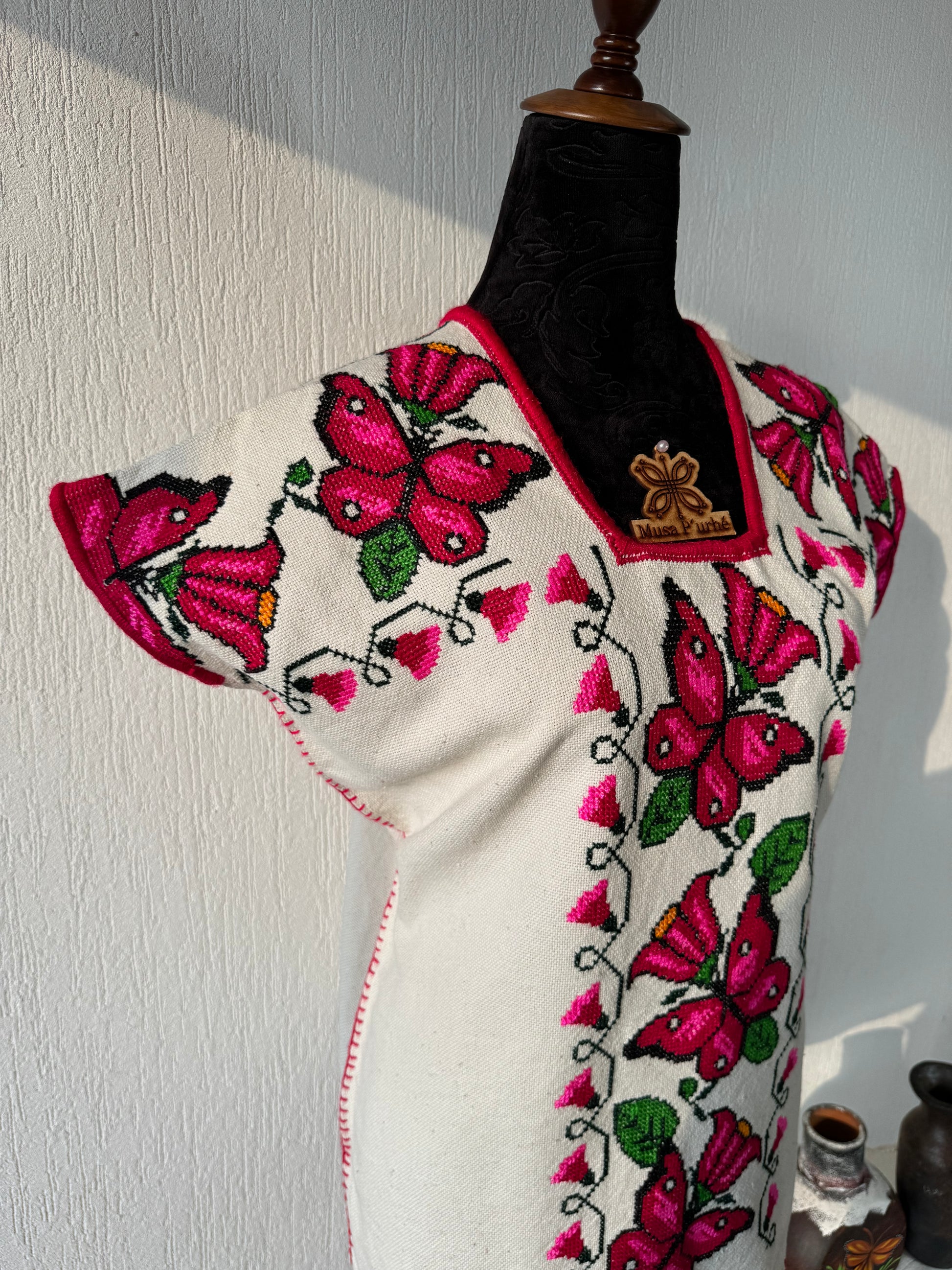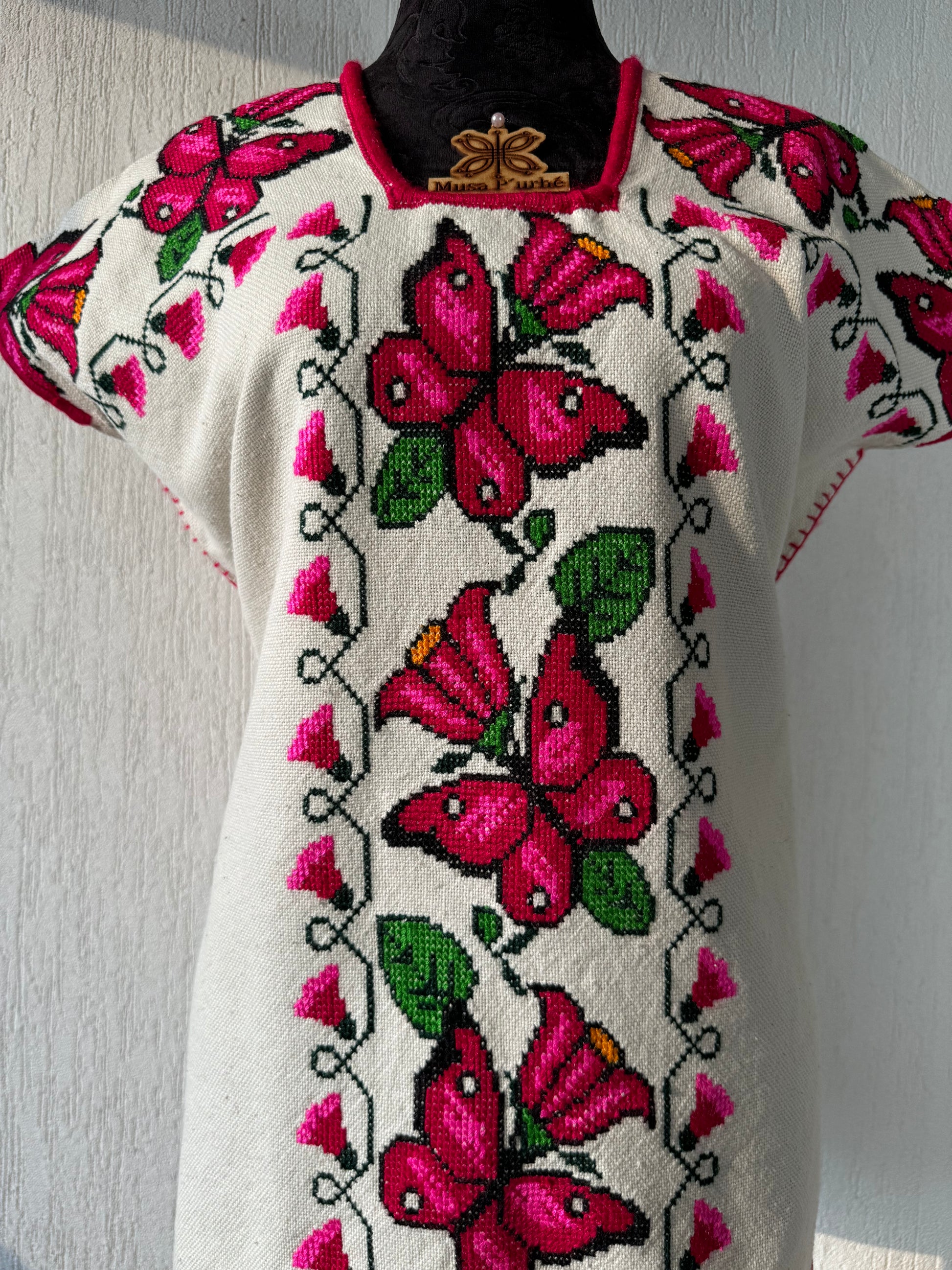 Tejido en telar rústico, confeccionado y bordado en punto de cruz totalmente a mano