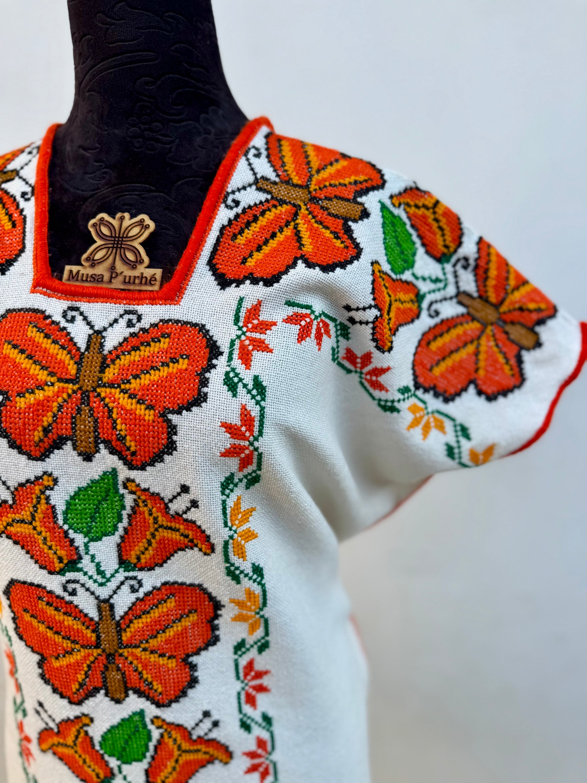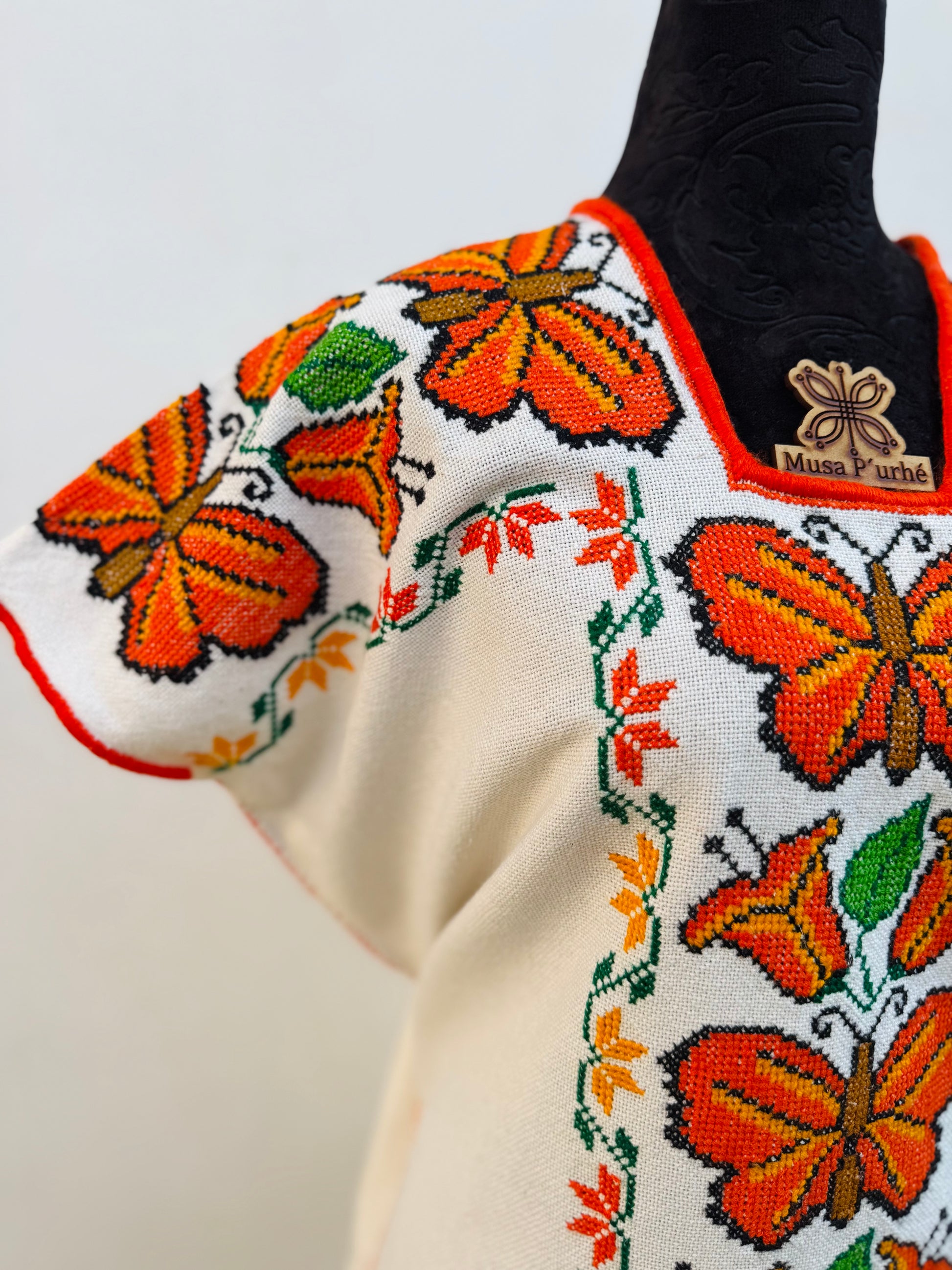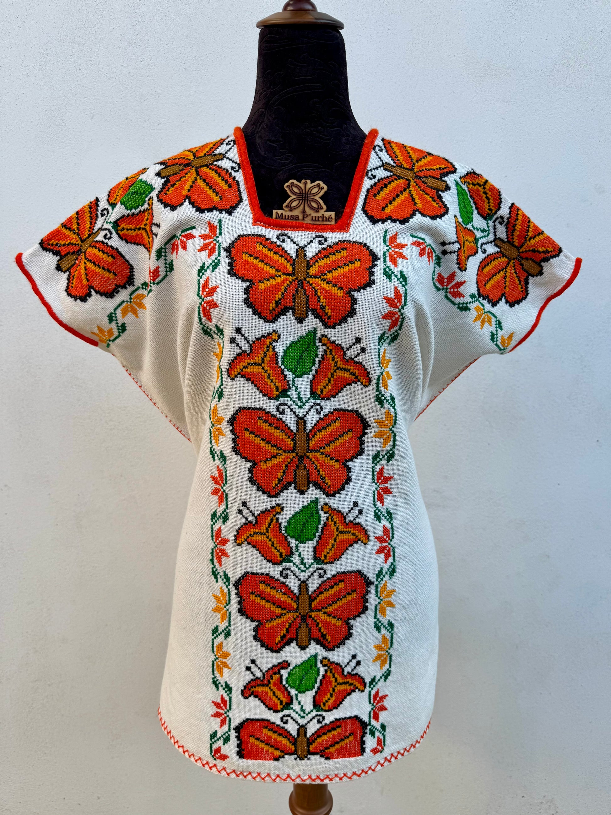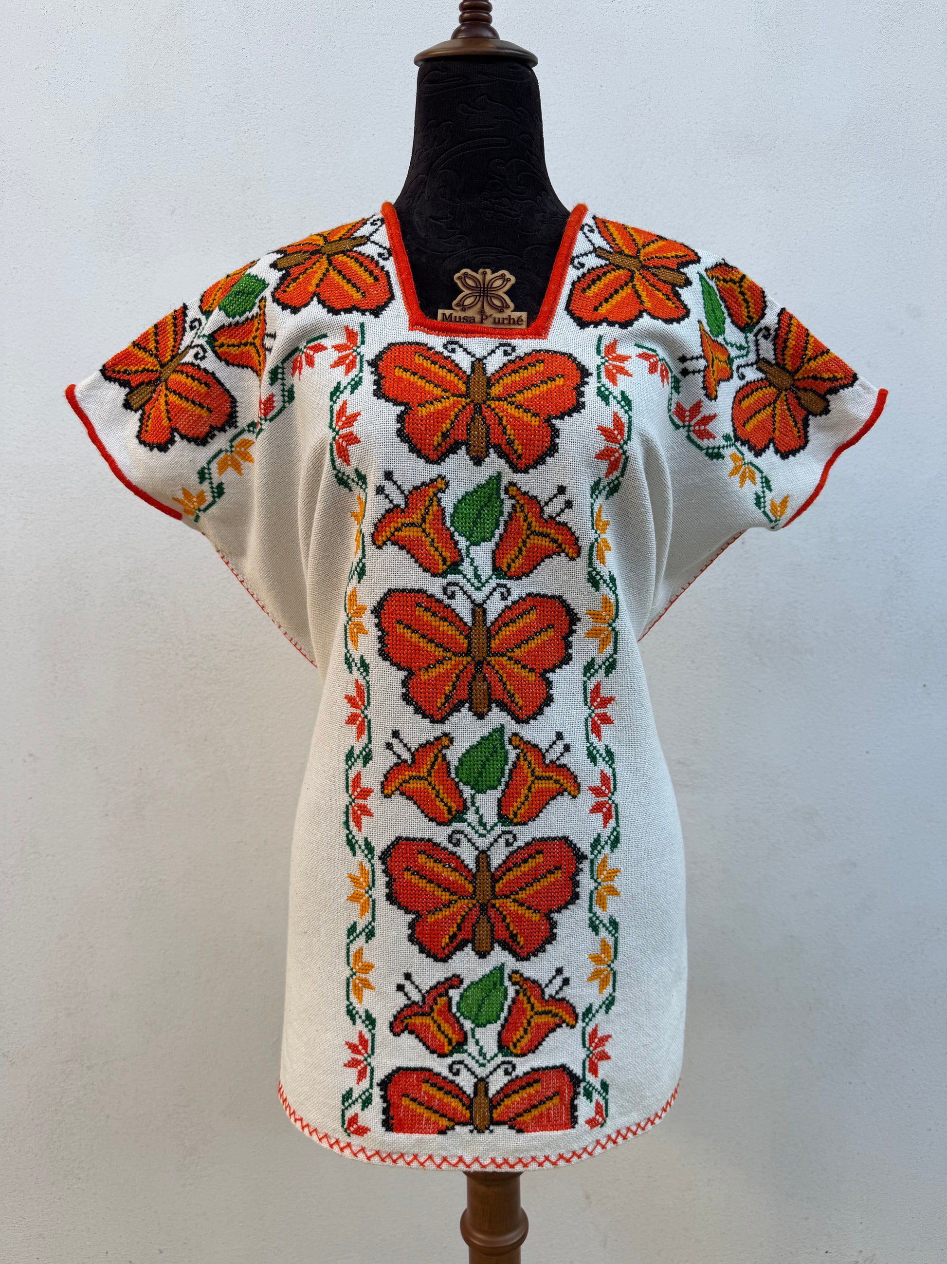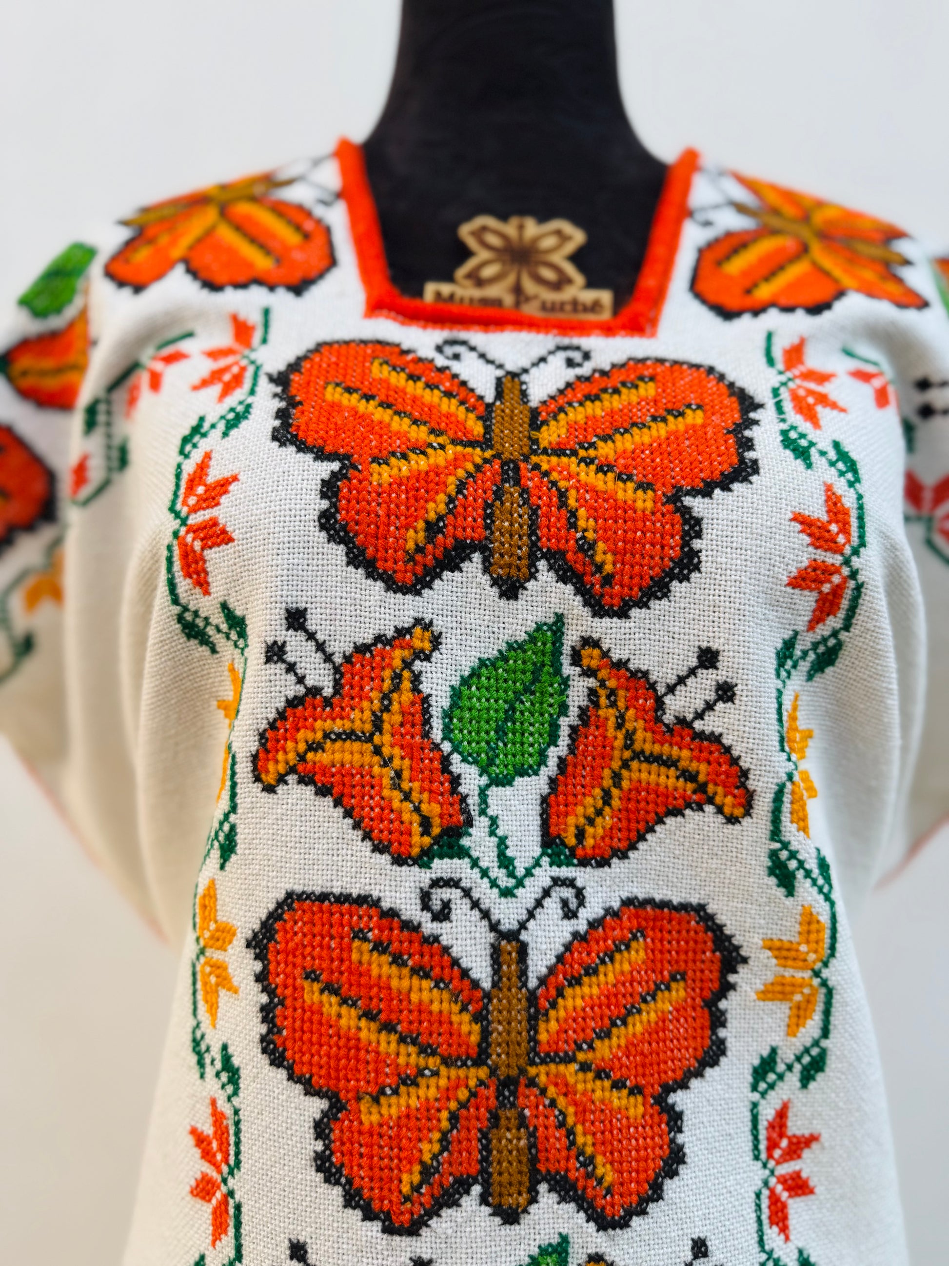 Tejido en telar rústico, confeccionado y bordado en punto de cruz totalmente a mano