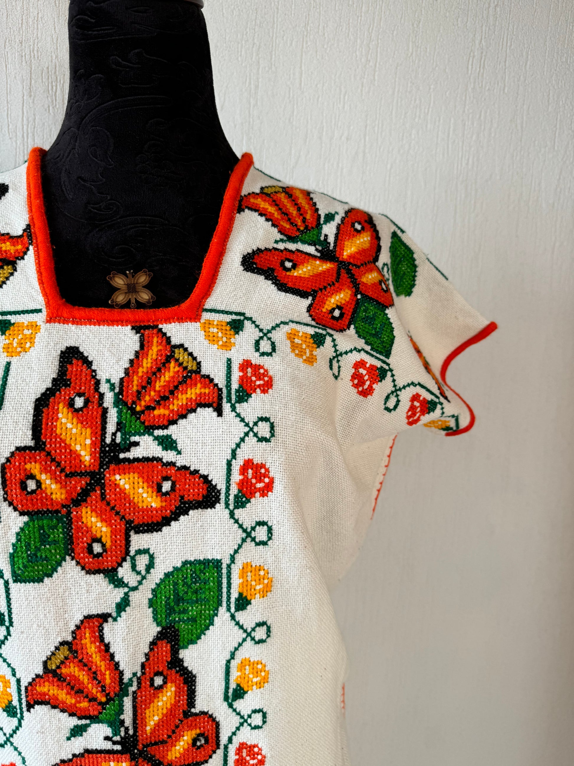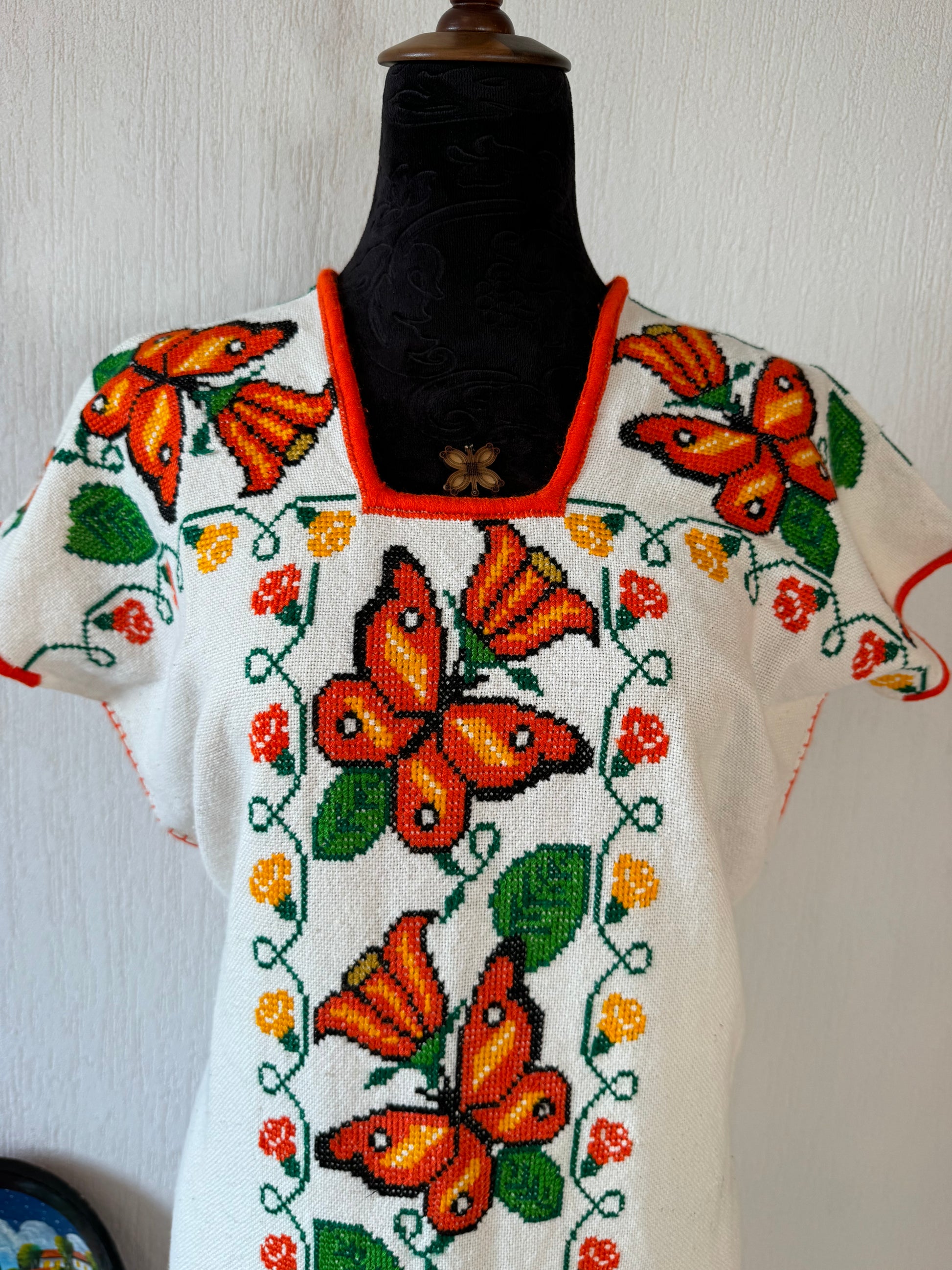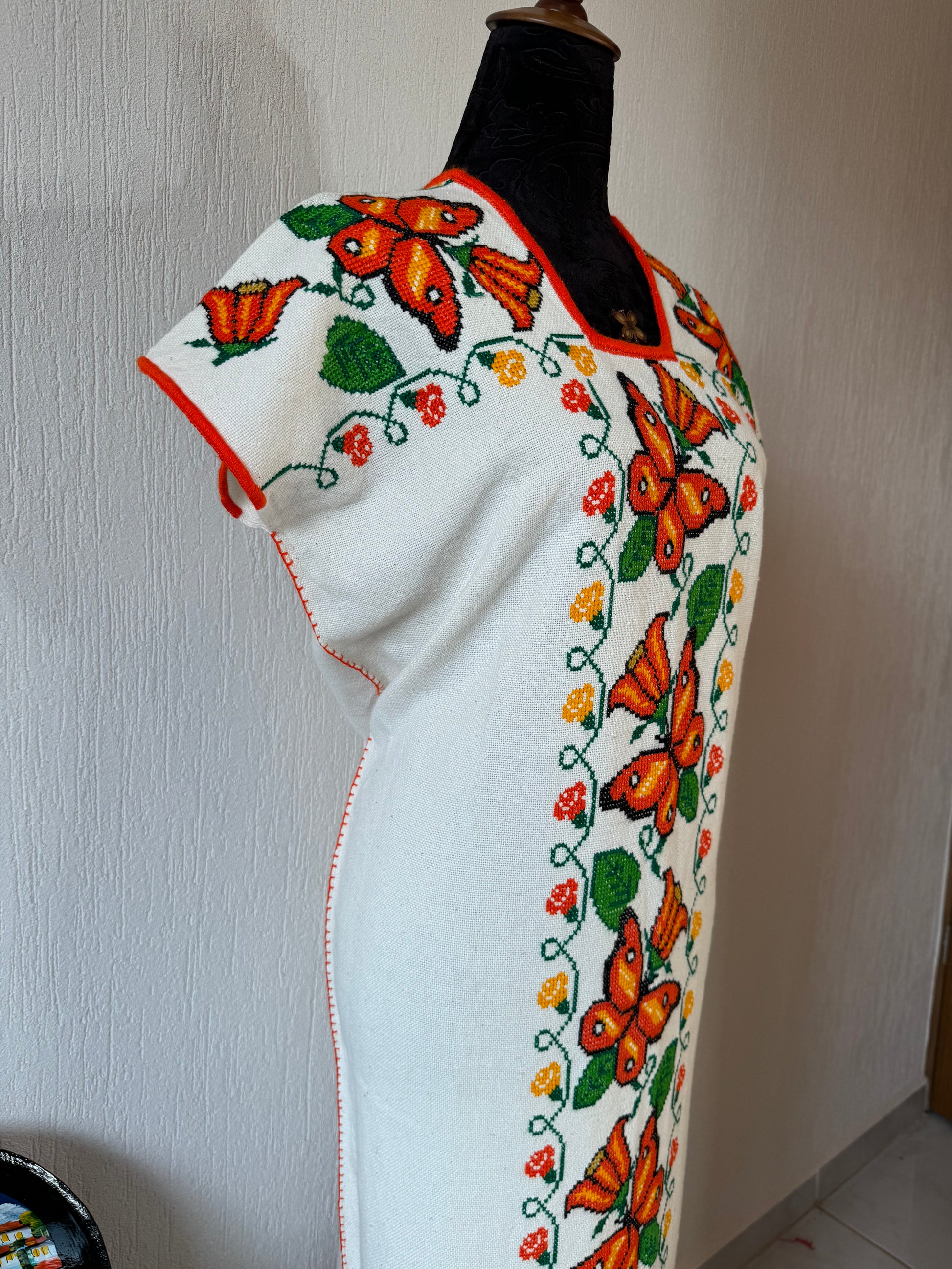 Tejido en telar rústico, confeccionado y bordado en punto de cruz totalmente a mano