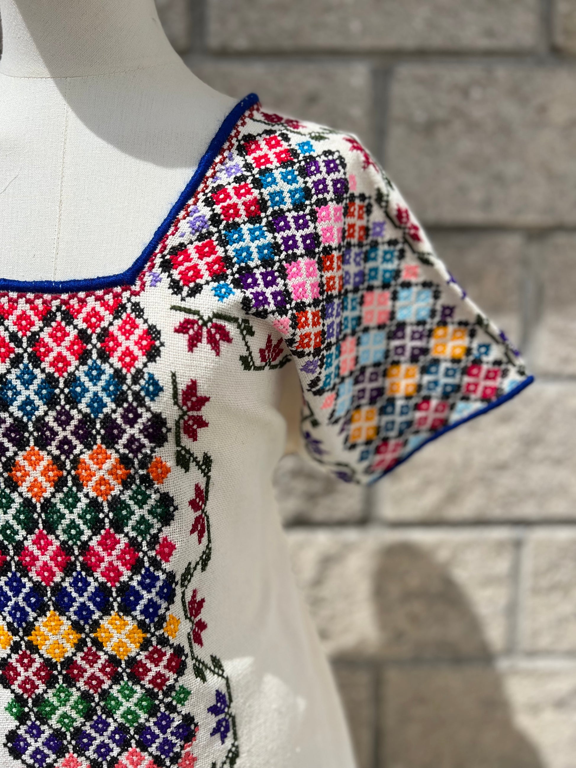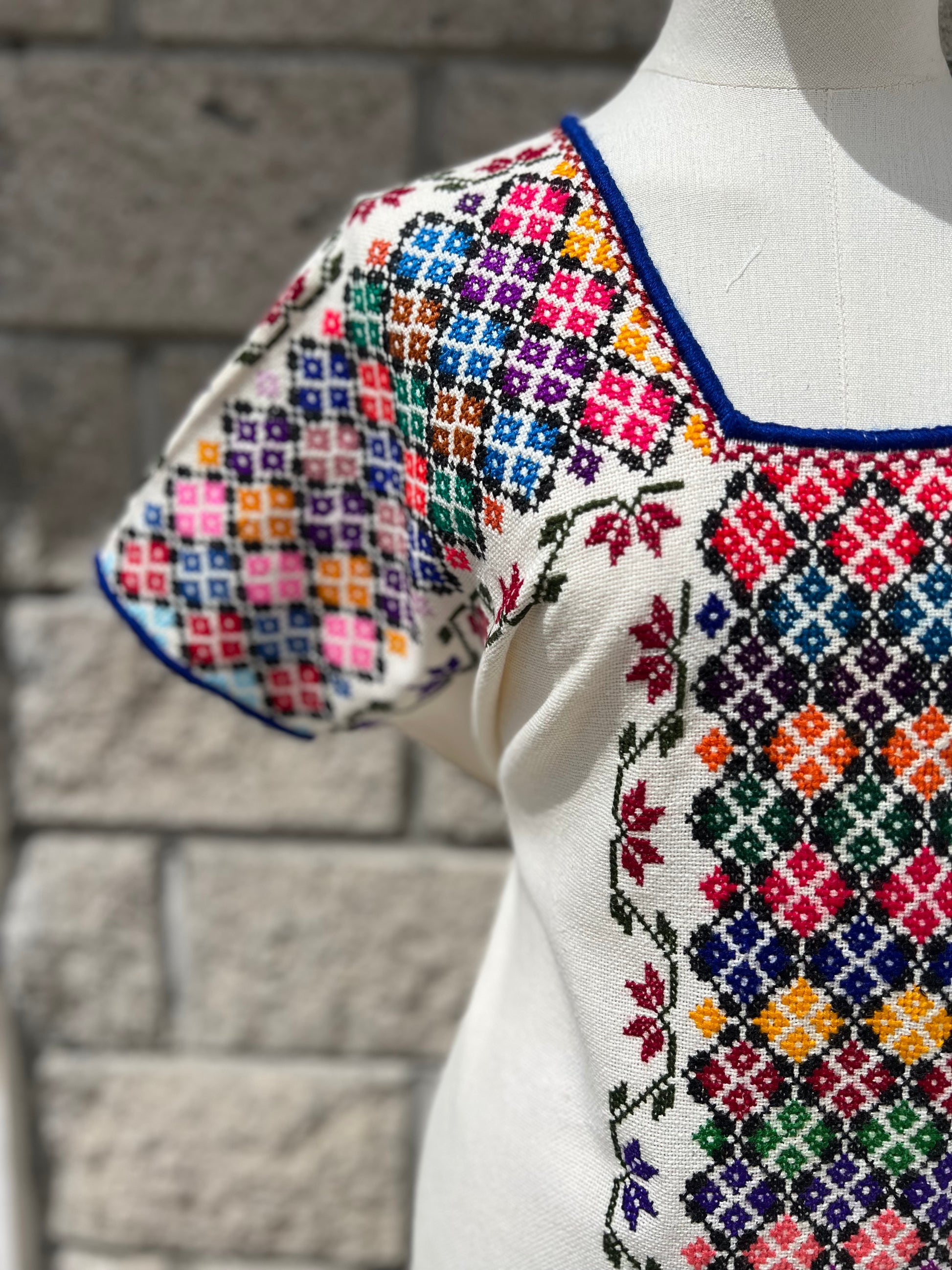 Tejido en telar rústico, confeccionado y bordado en punto de cruz totalmente a mano.