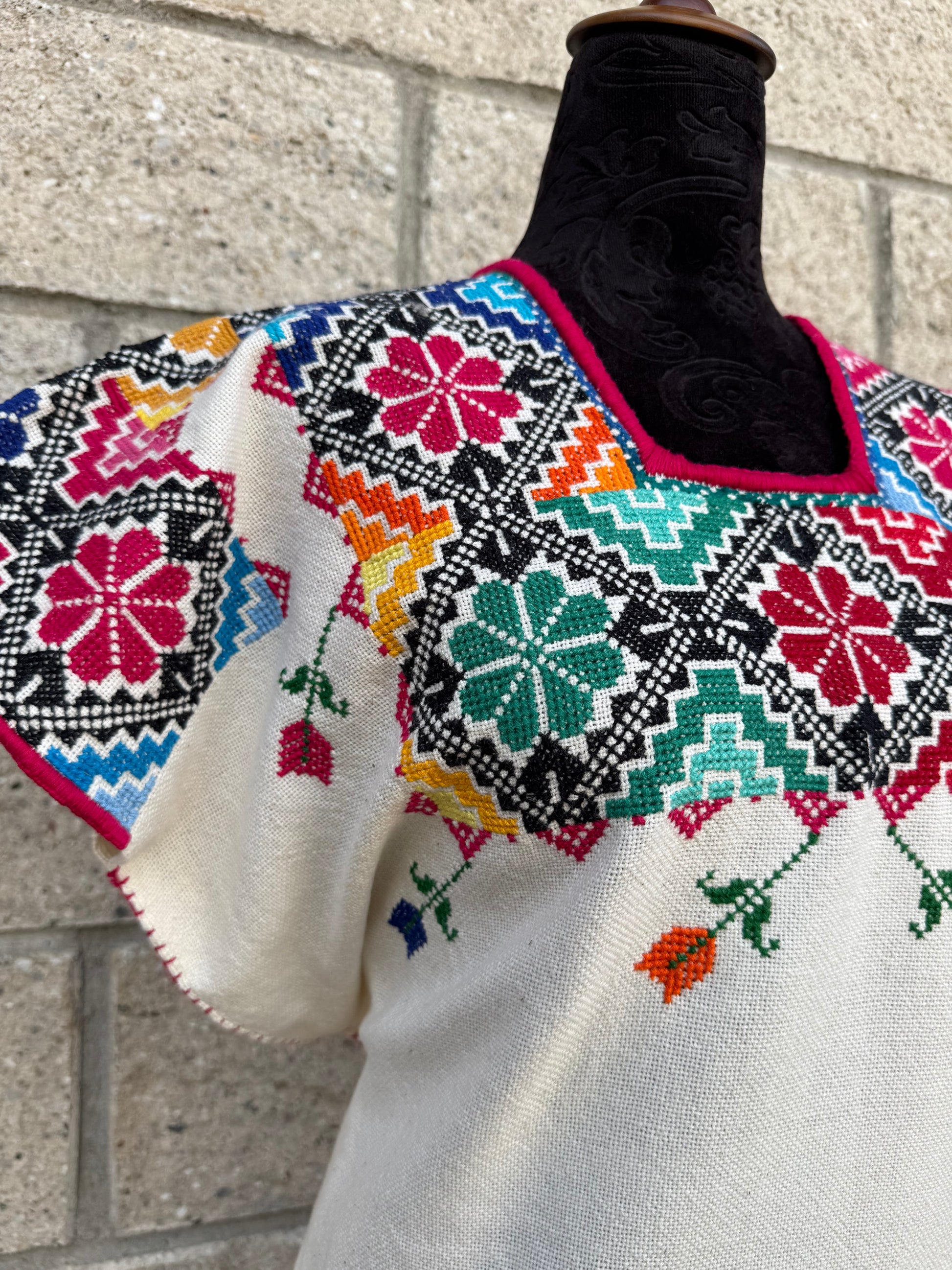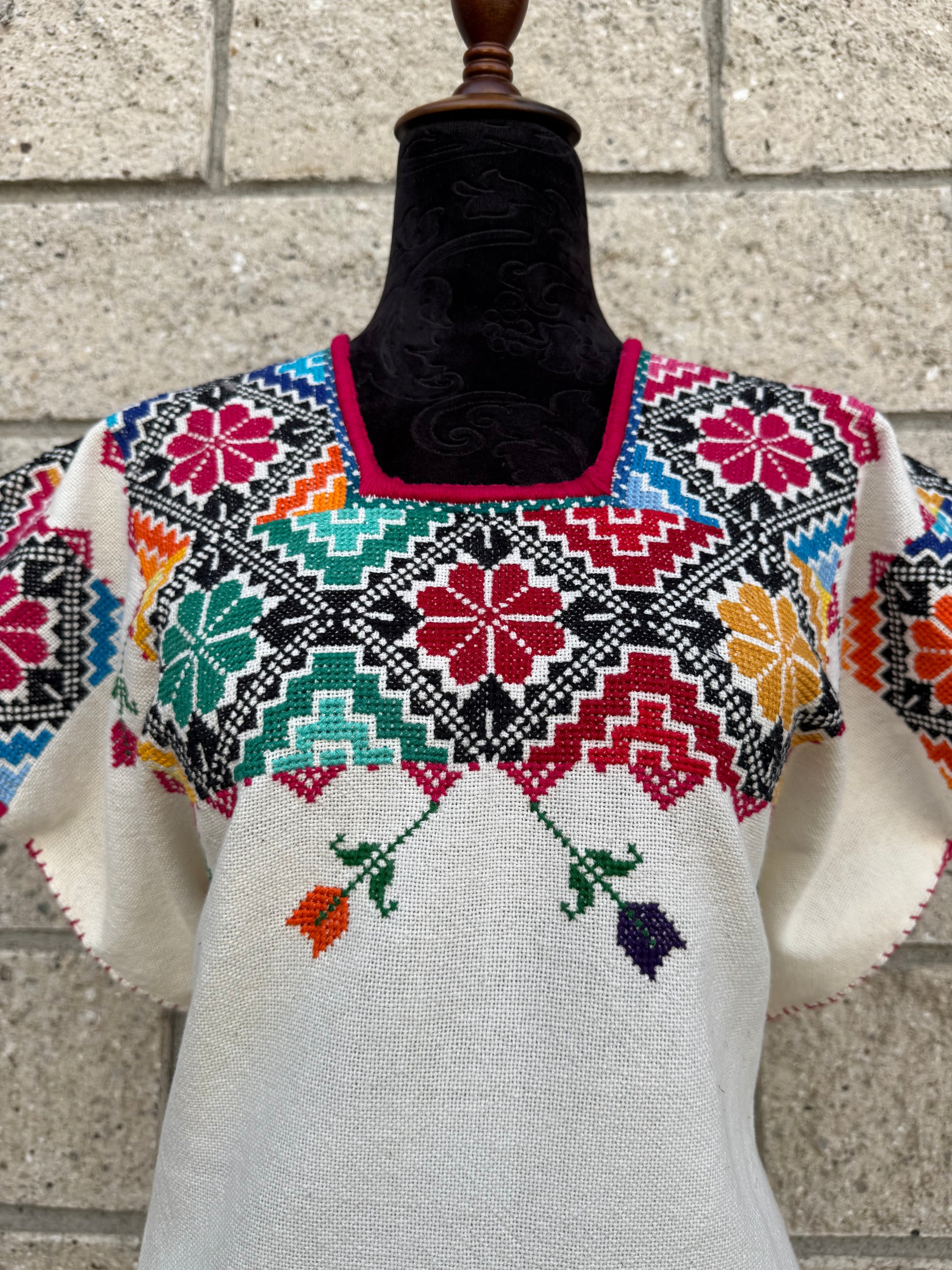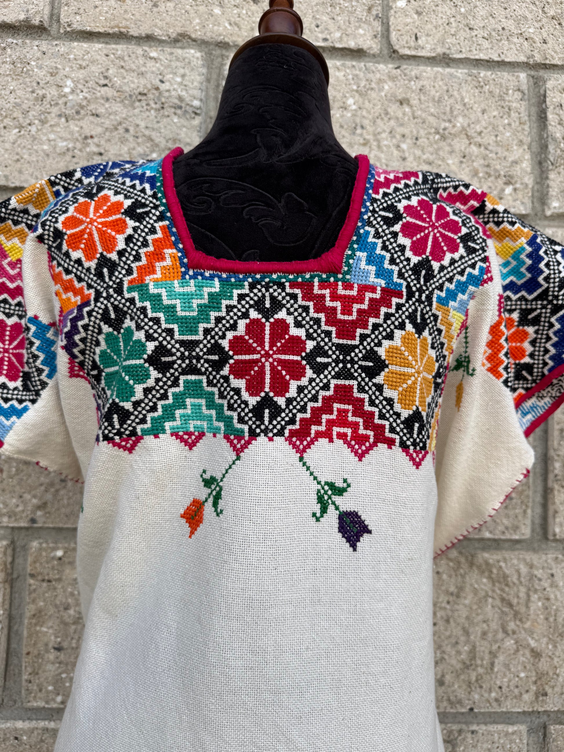 Tejido en telar rústico, confeccionado y bordado en punto de cruz totalmente a mano por ambos lados.