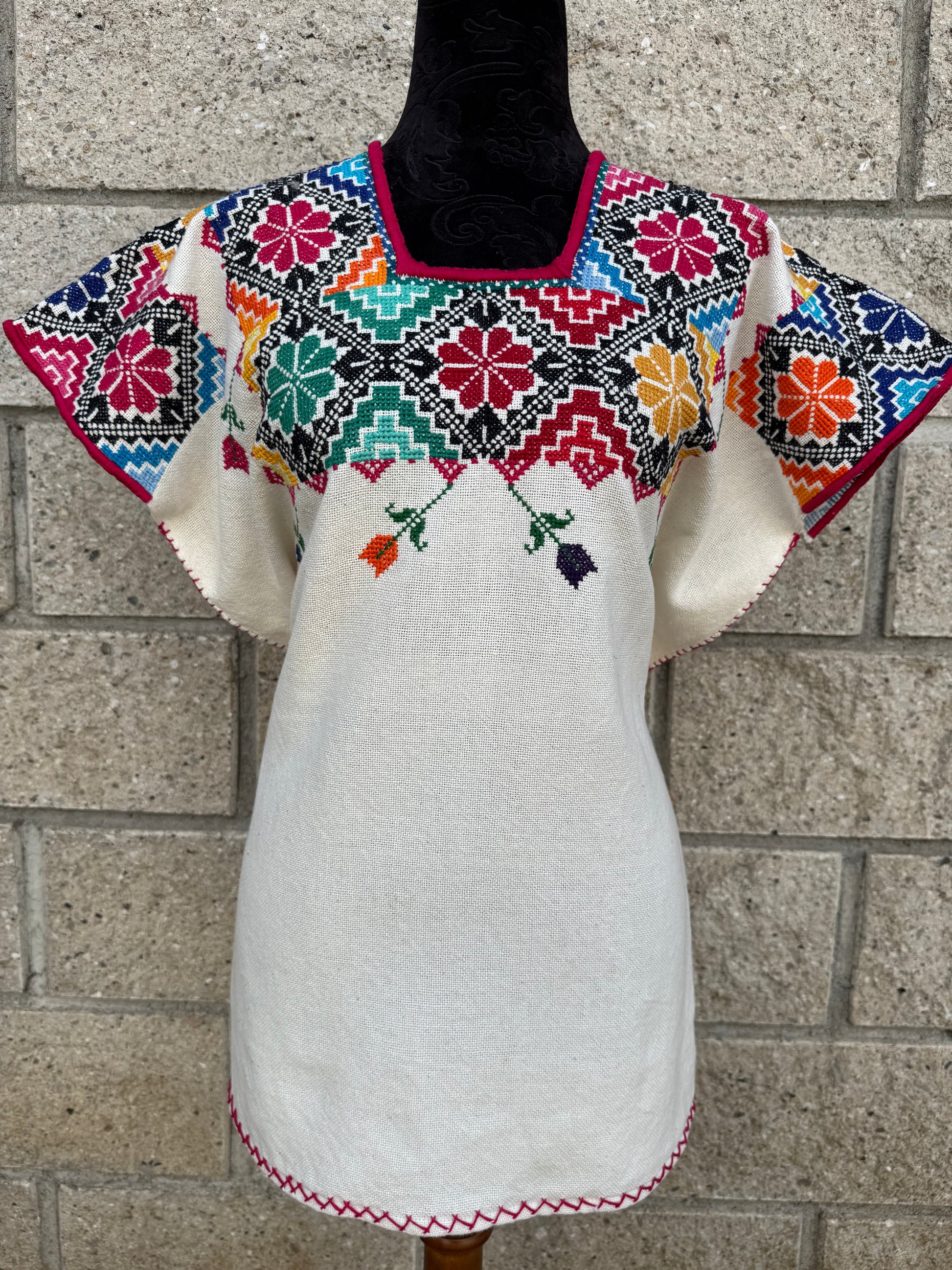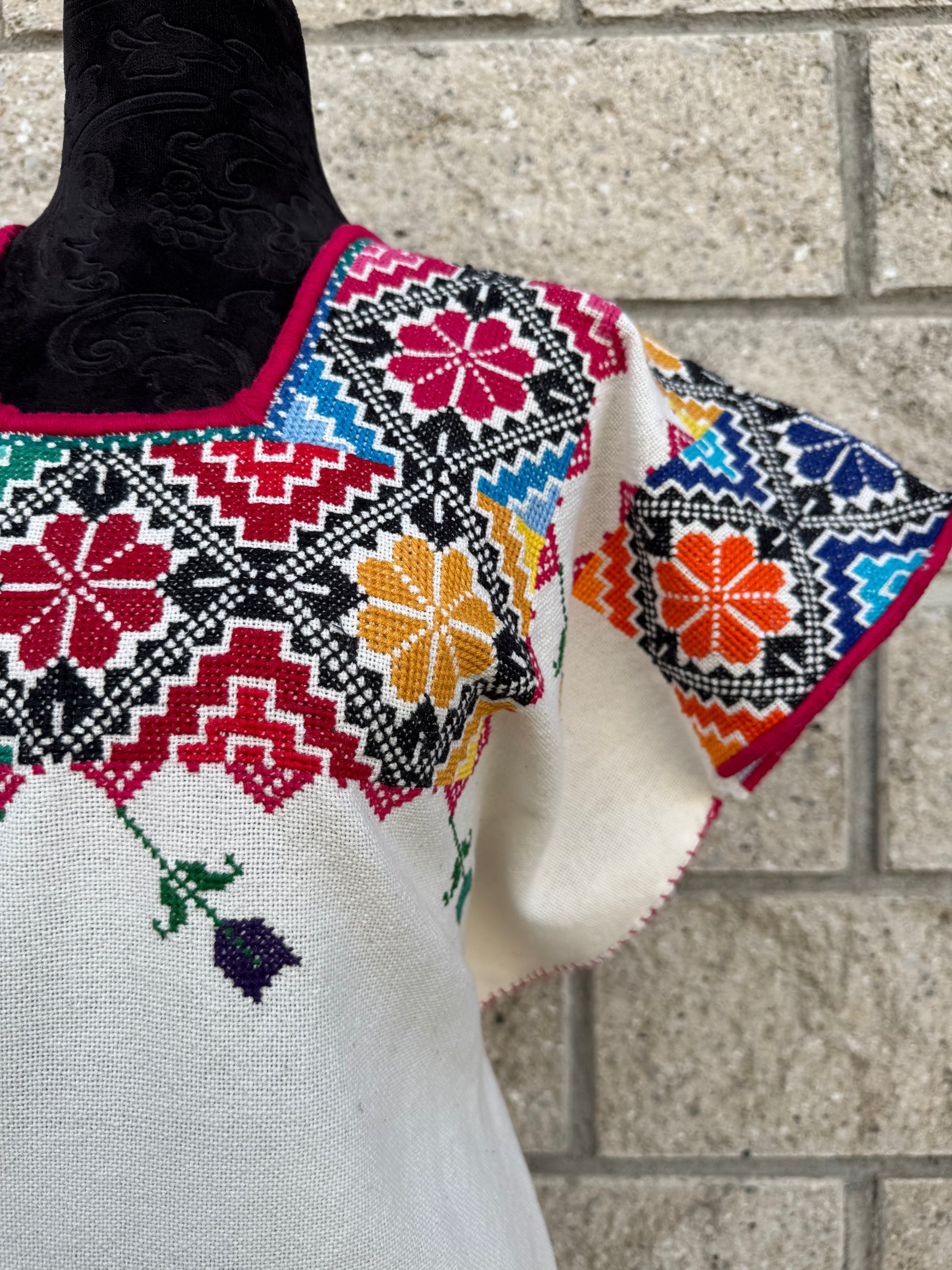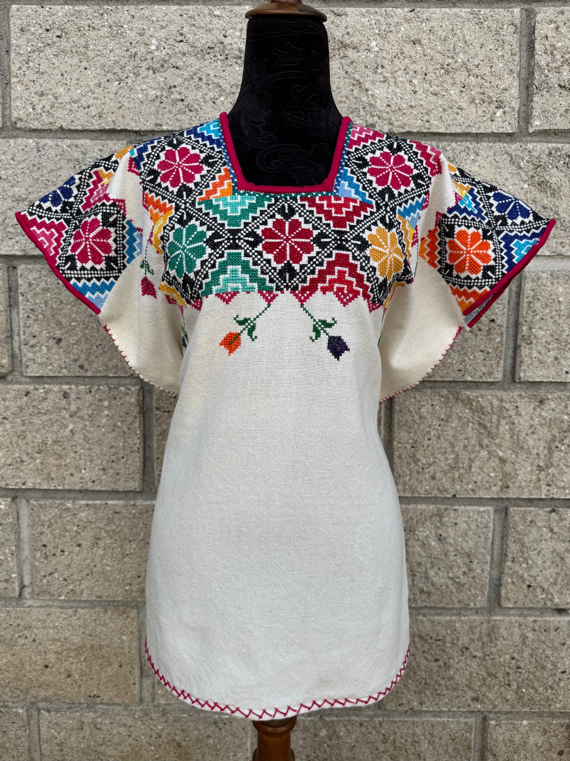 Tejido en telar rústico, confeccionado y bordado en punto de cruz totalmente a mano por ambos lados.