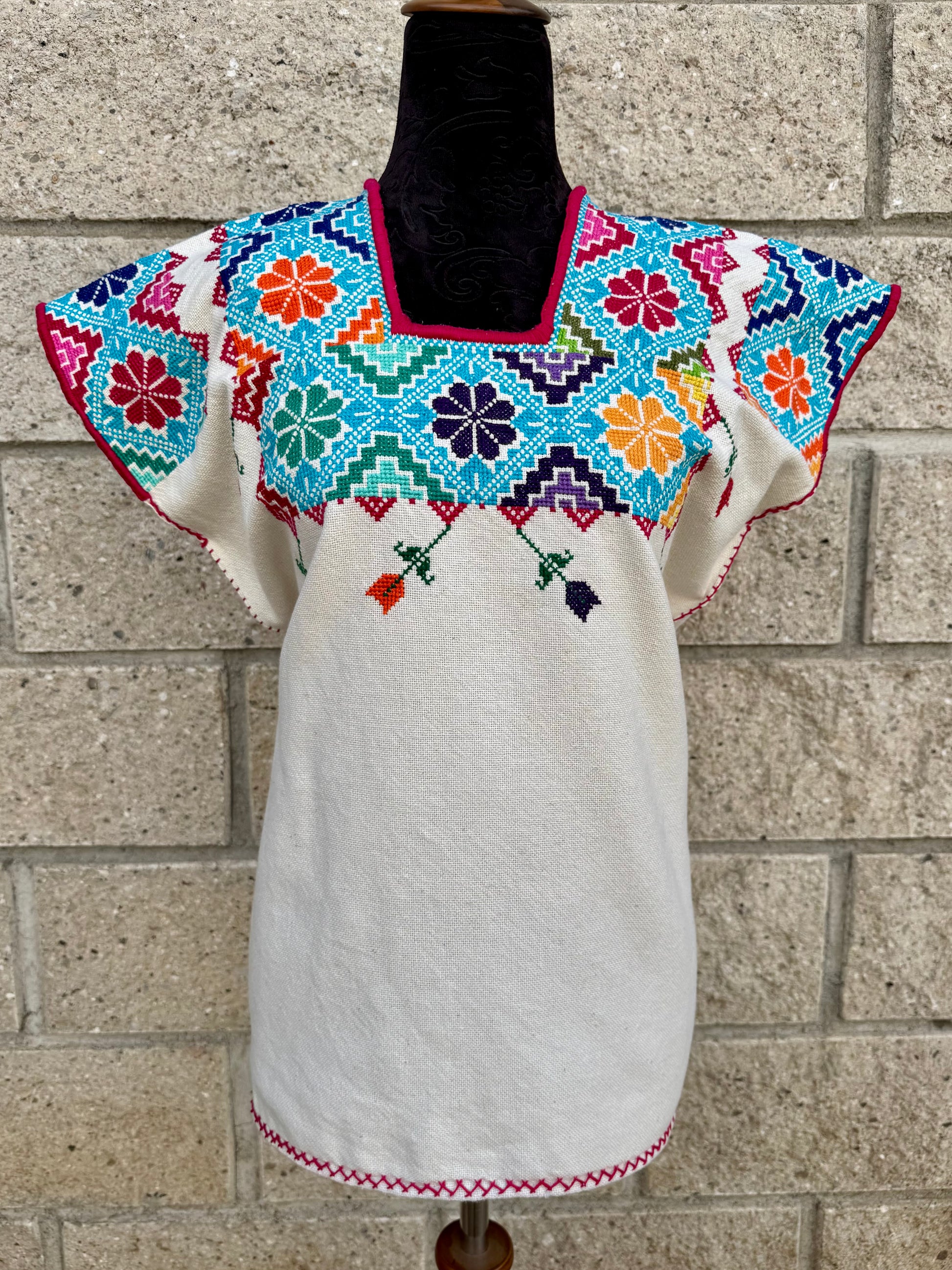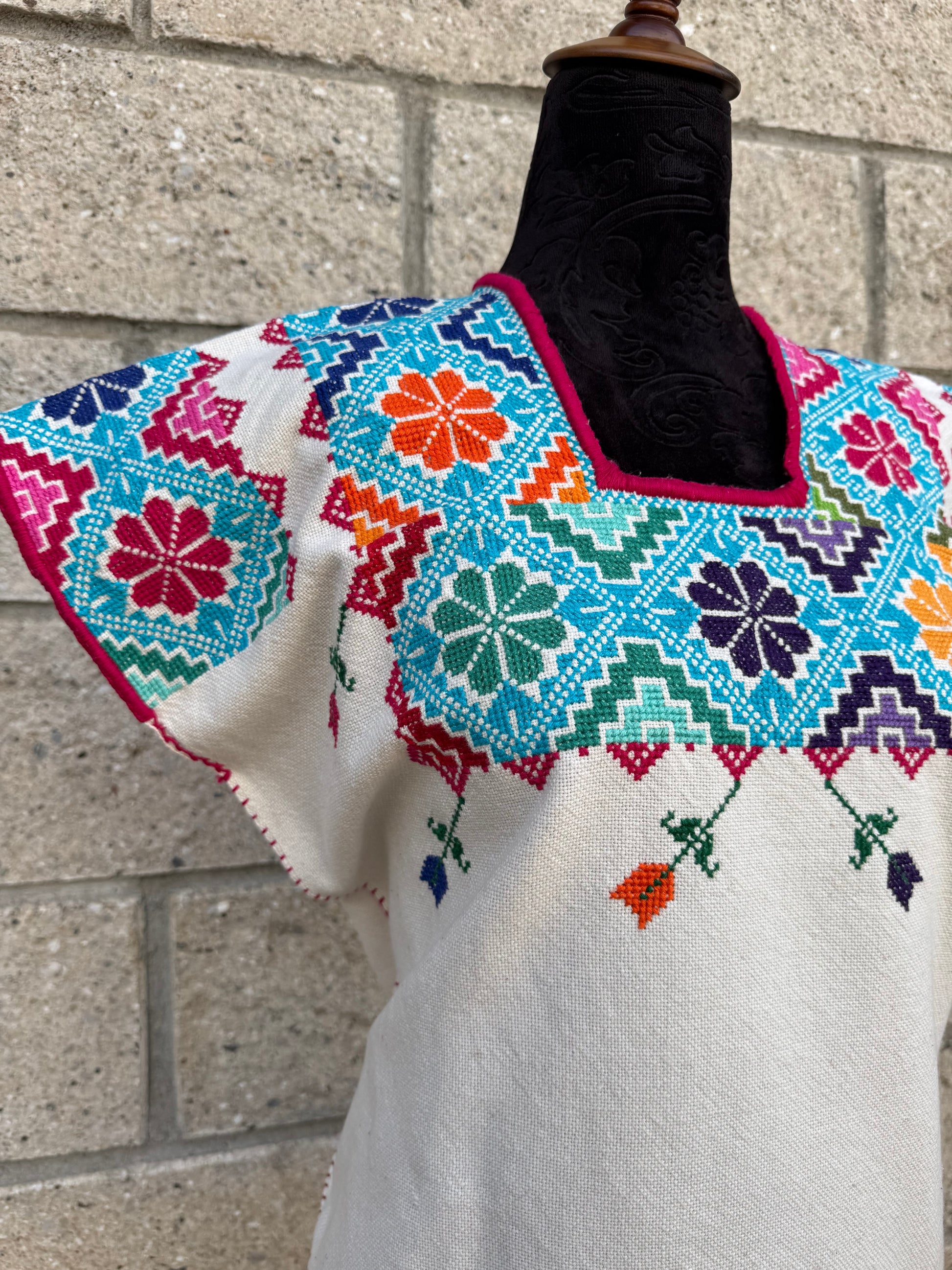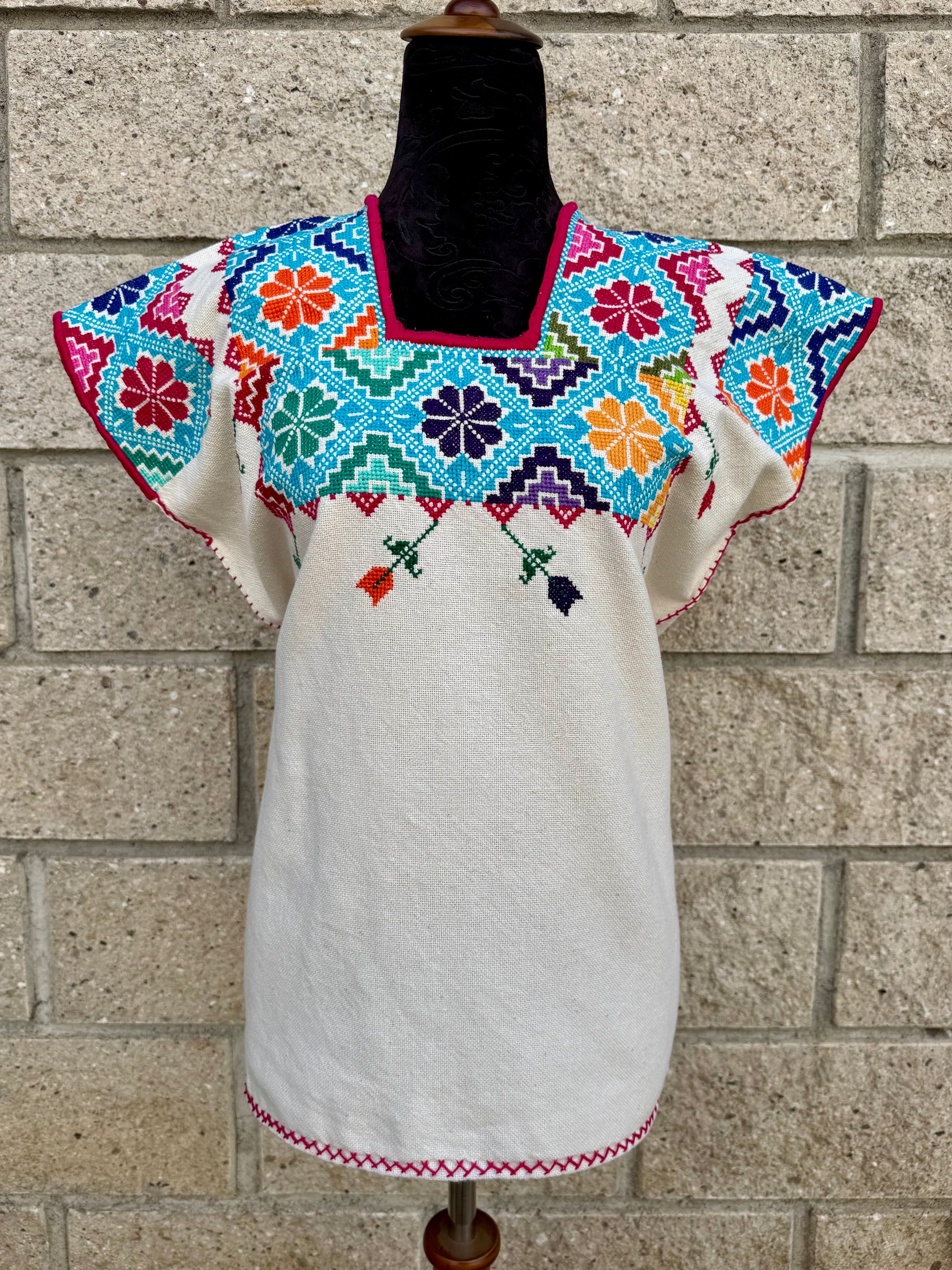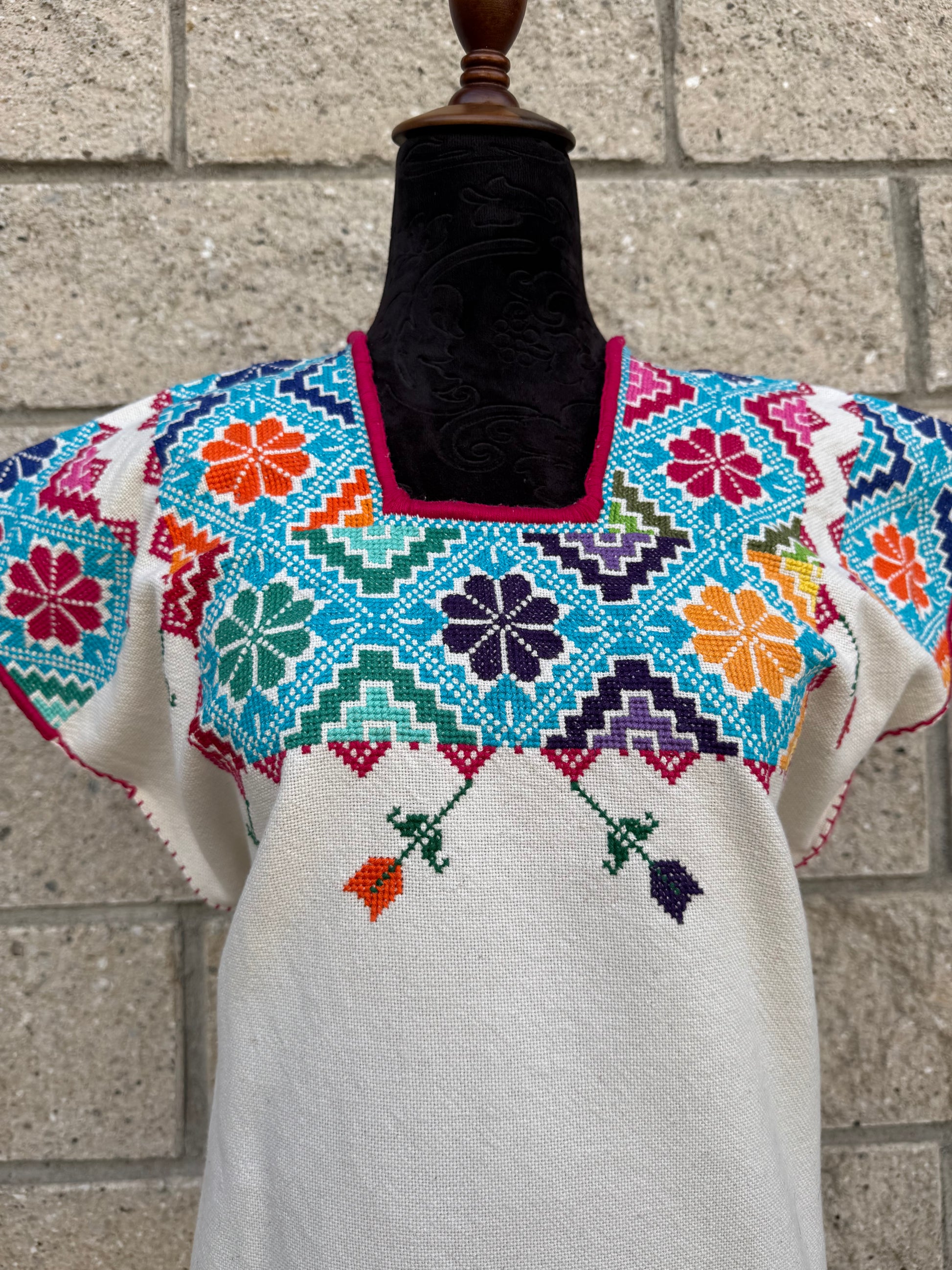 Tejido en telar rústico, confeccionado y bordado en punto de cruz totalmente a mano
