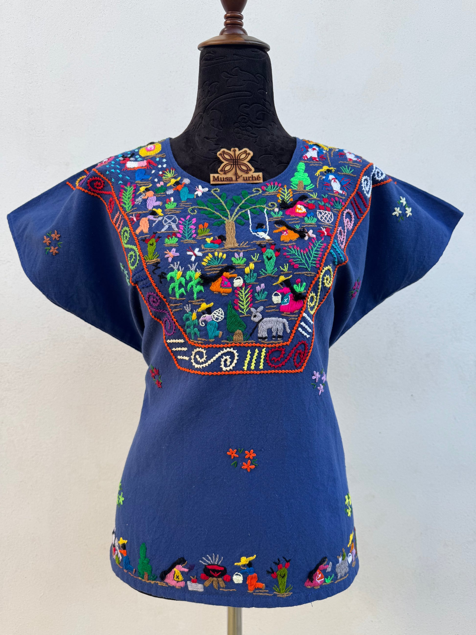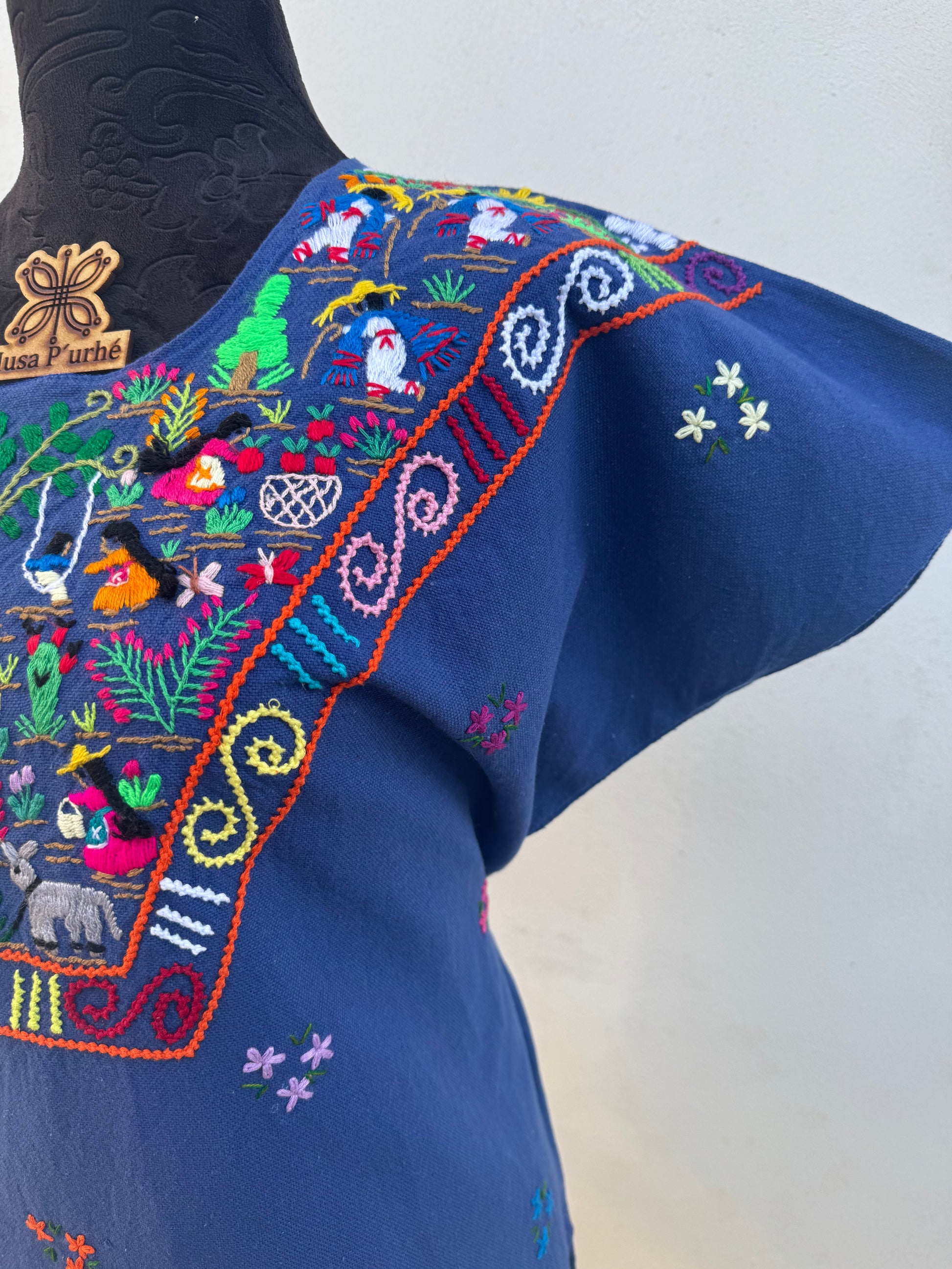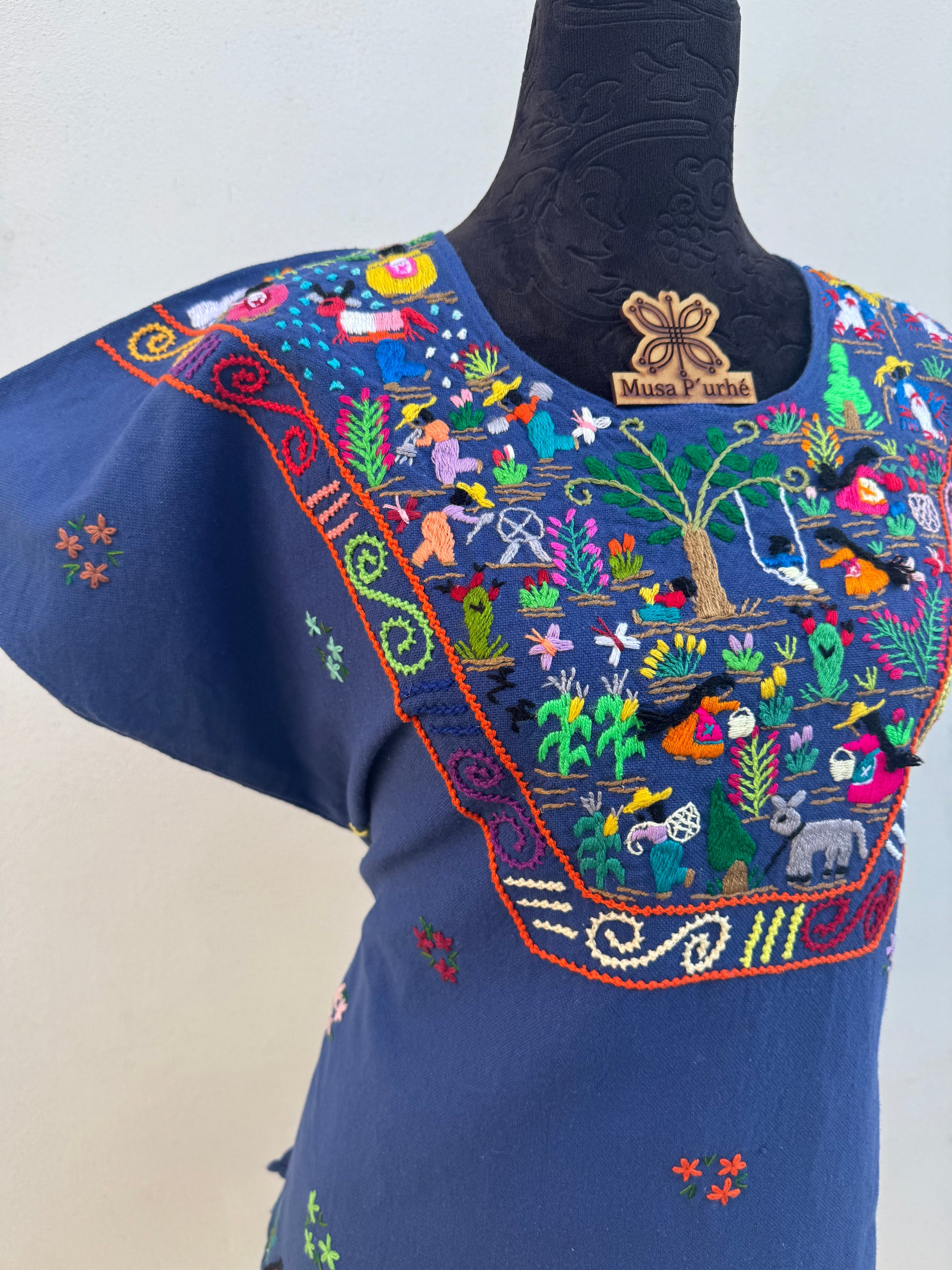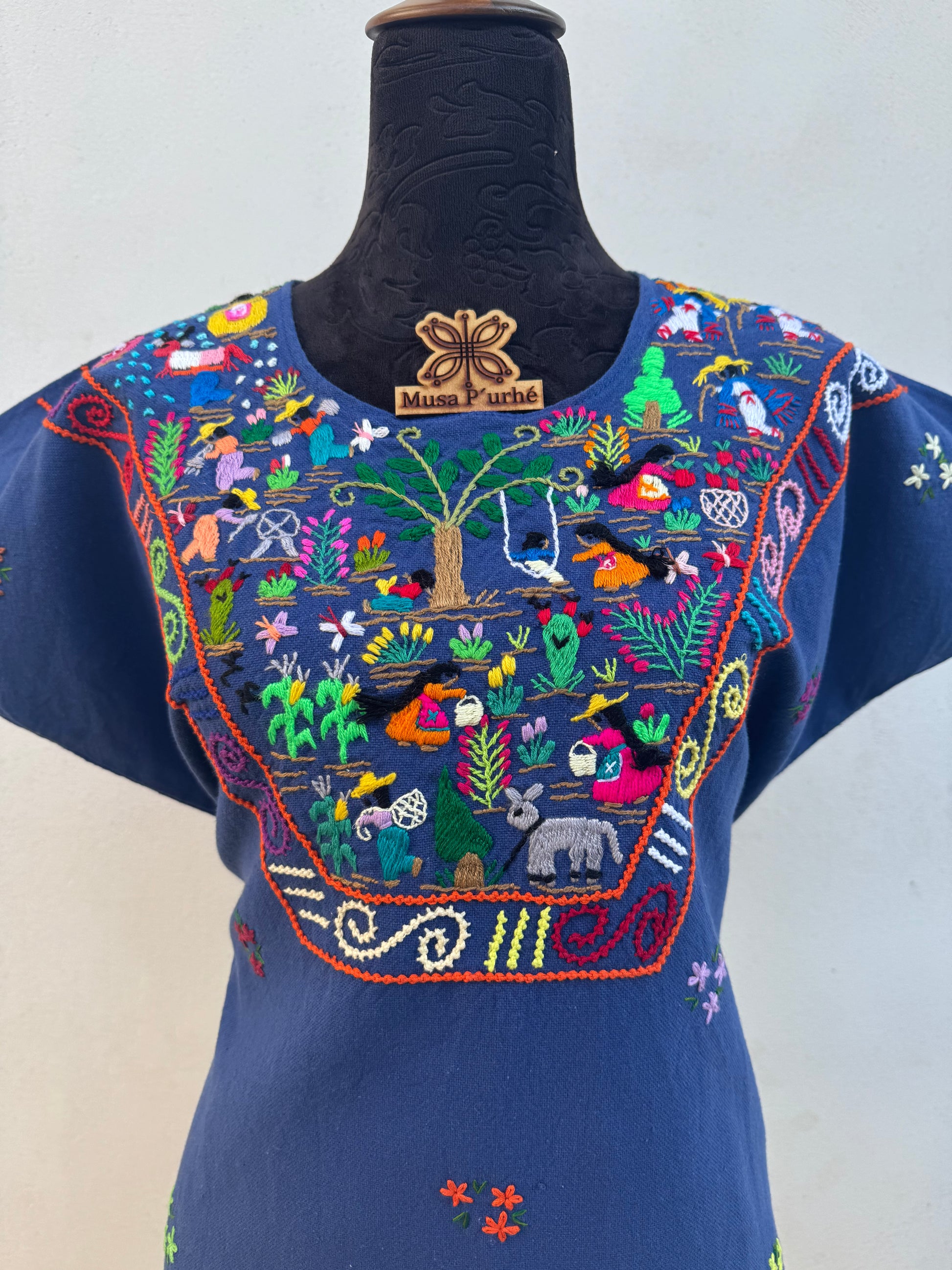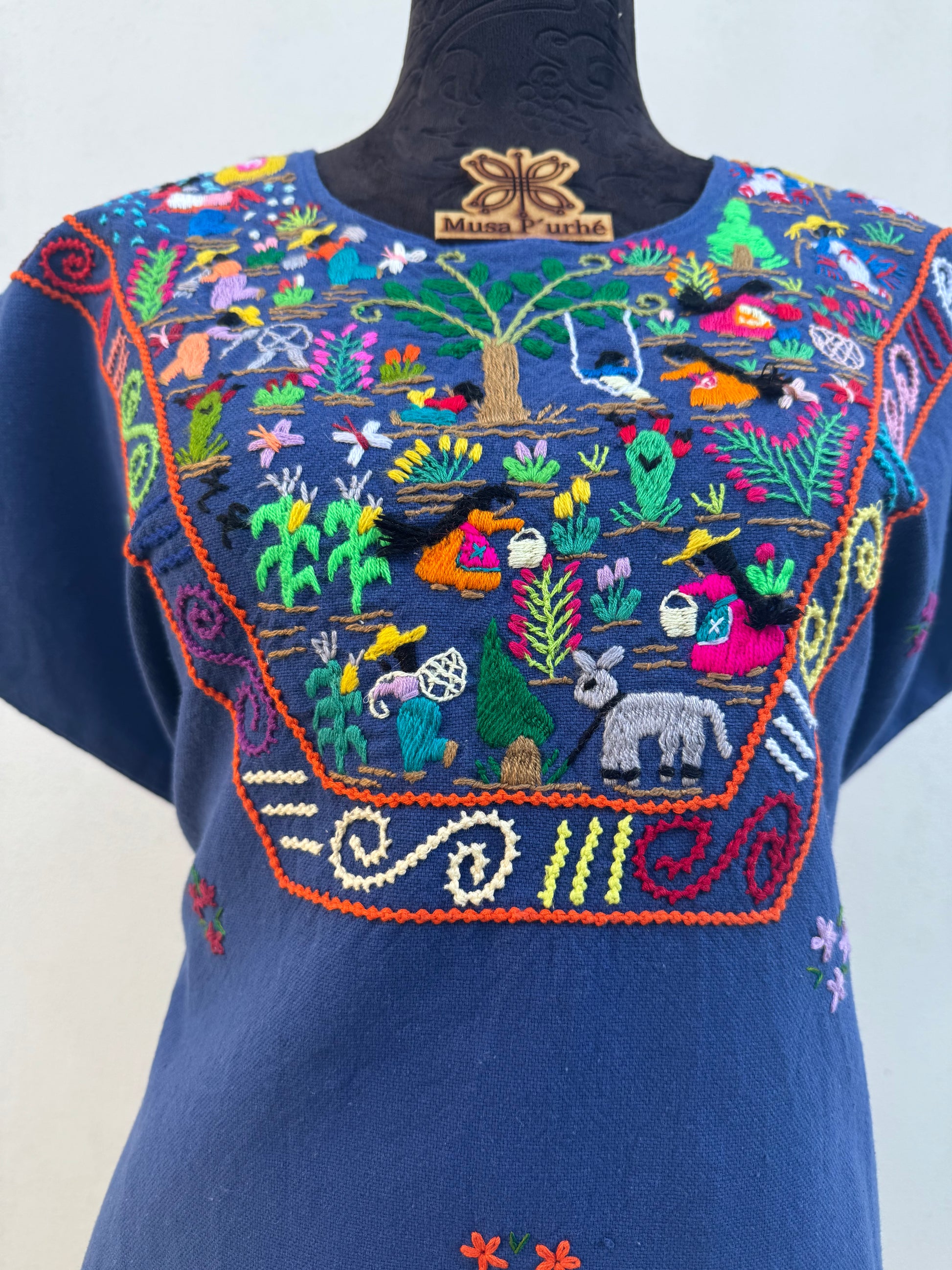 Tejido telar rústico, confeccionado y bordado de historias totalmente a mano