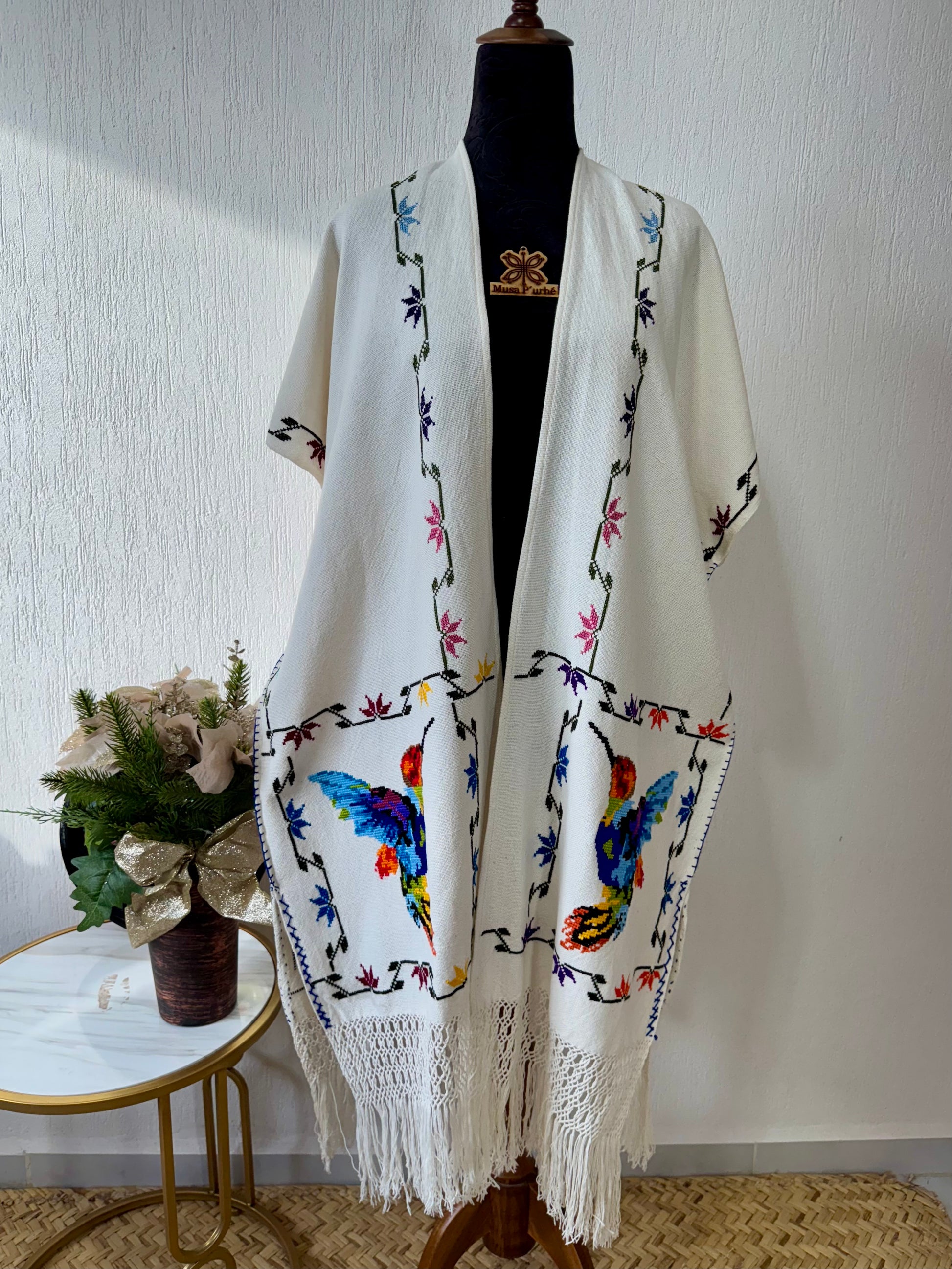 Tejido en telar rústico, confeccionado, empuntado y bordado en punto de cruz totalmente a mano
