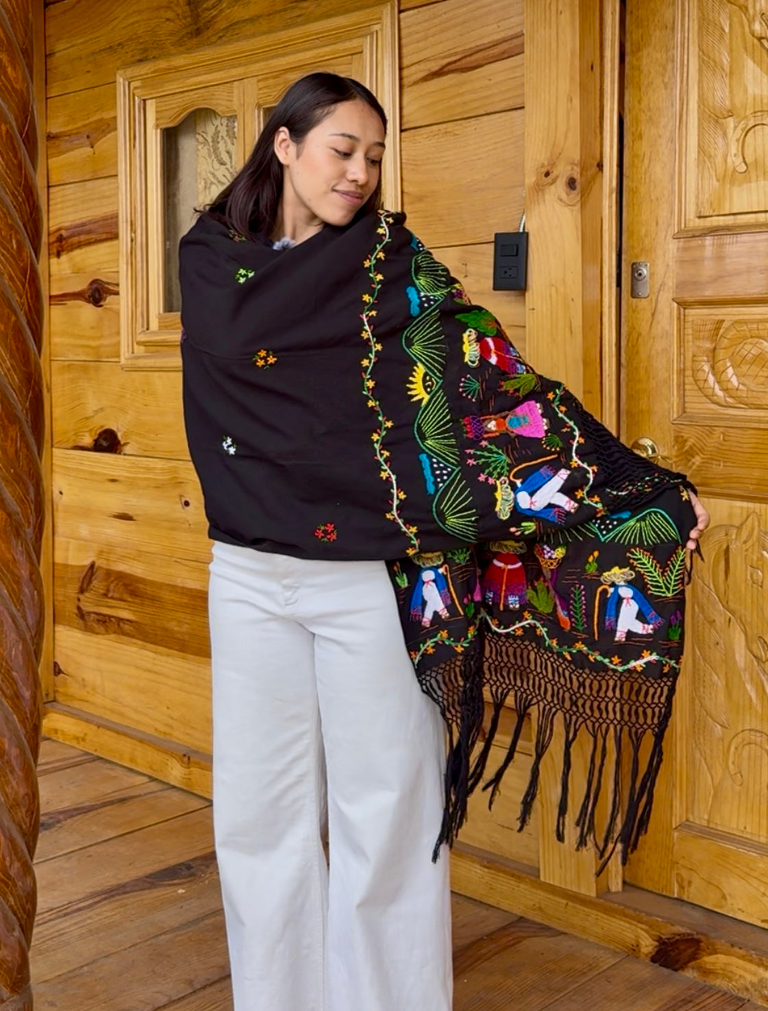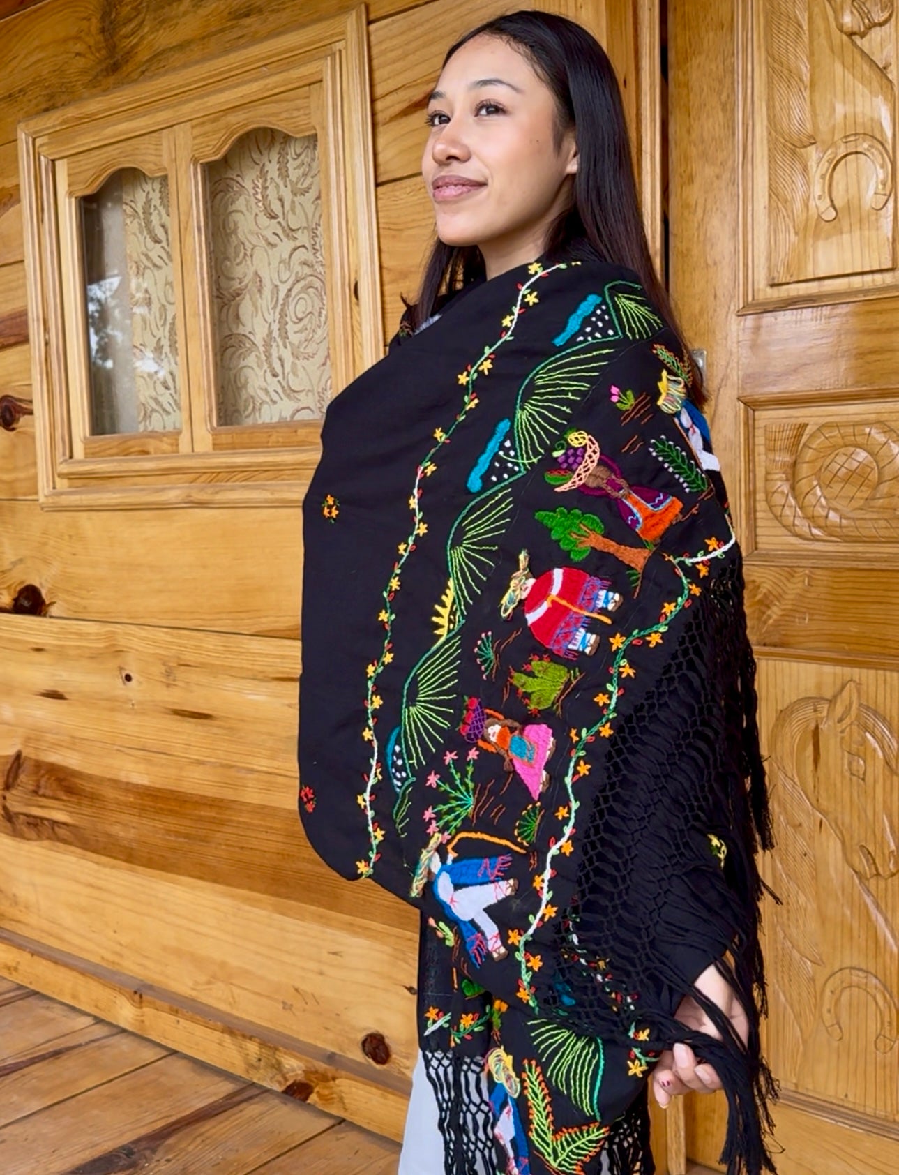 Tejido en telar rústico, confeccionado y bordado en punto pastel totalmente a mano