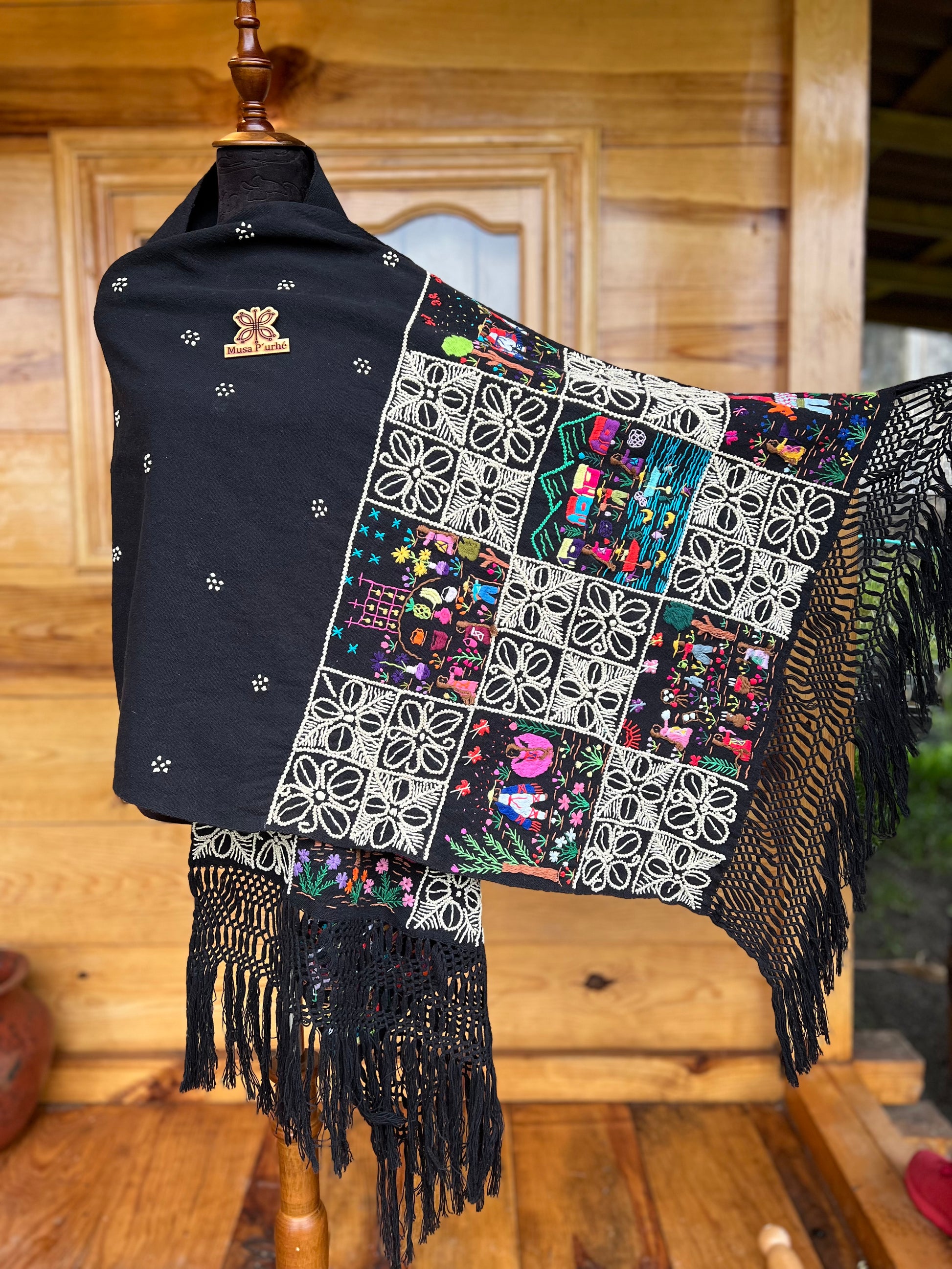 Tejido telar rústico, confeccionado y bordado de historias totalmente a mano.