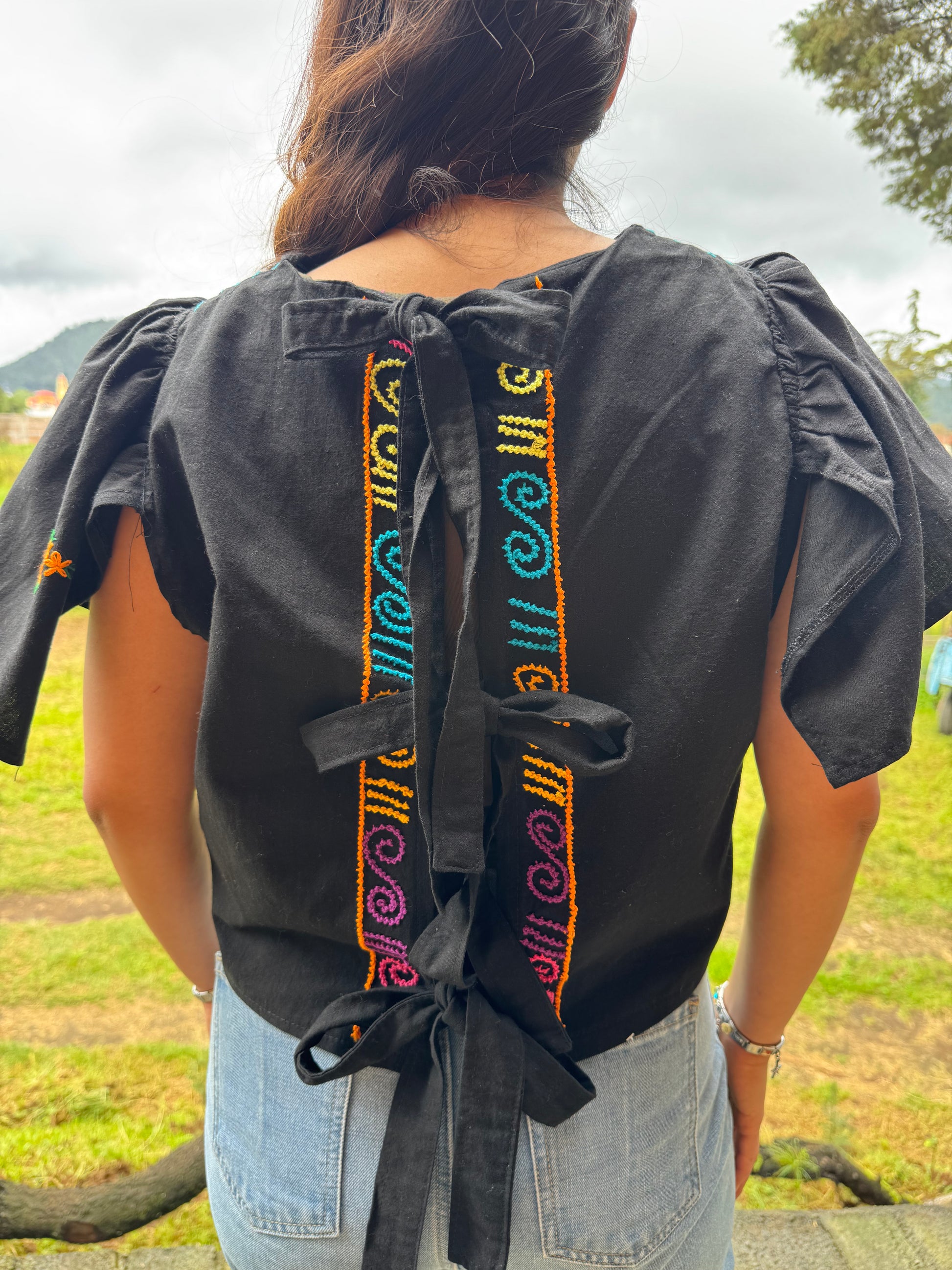 Manta 100% algodón, color negra y bordado de historias totalmente a mano.