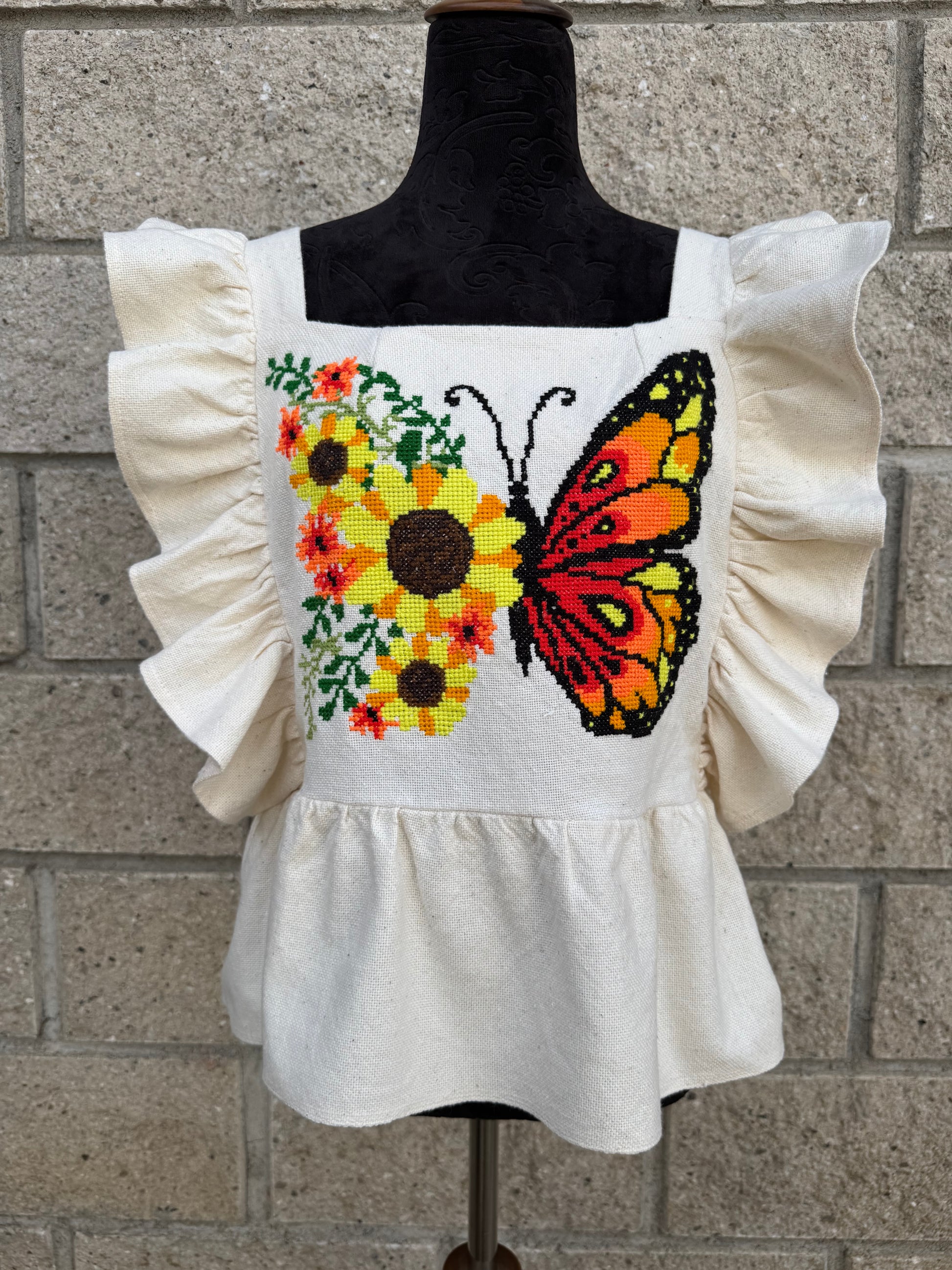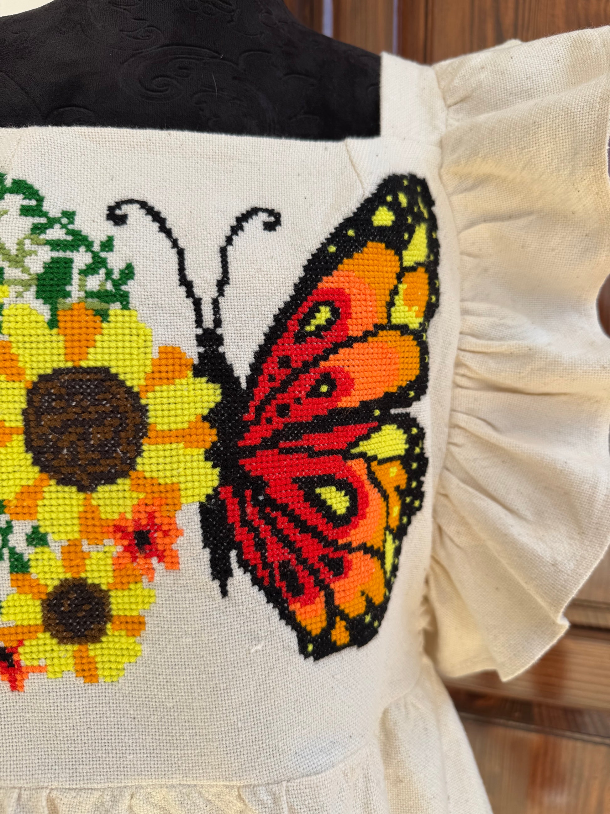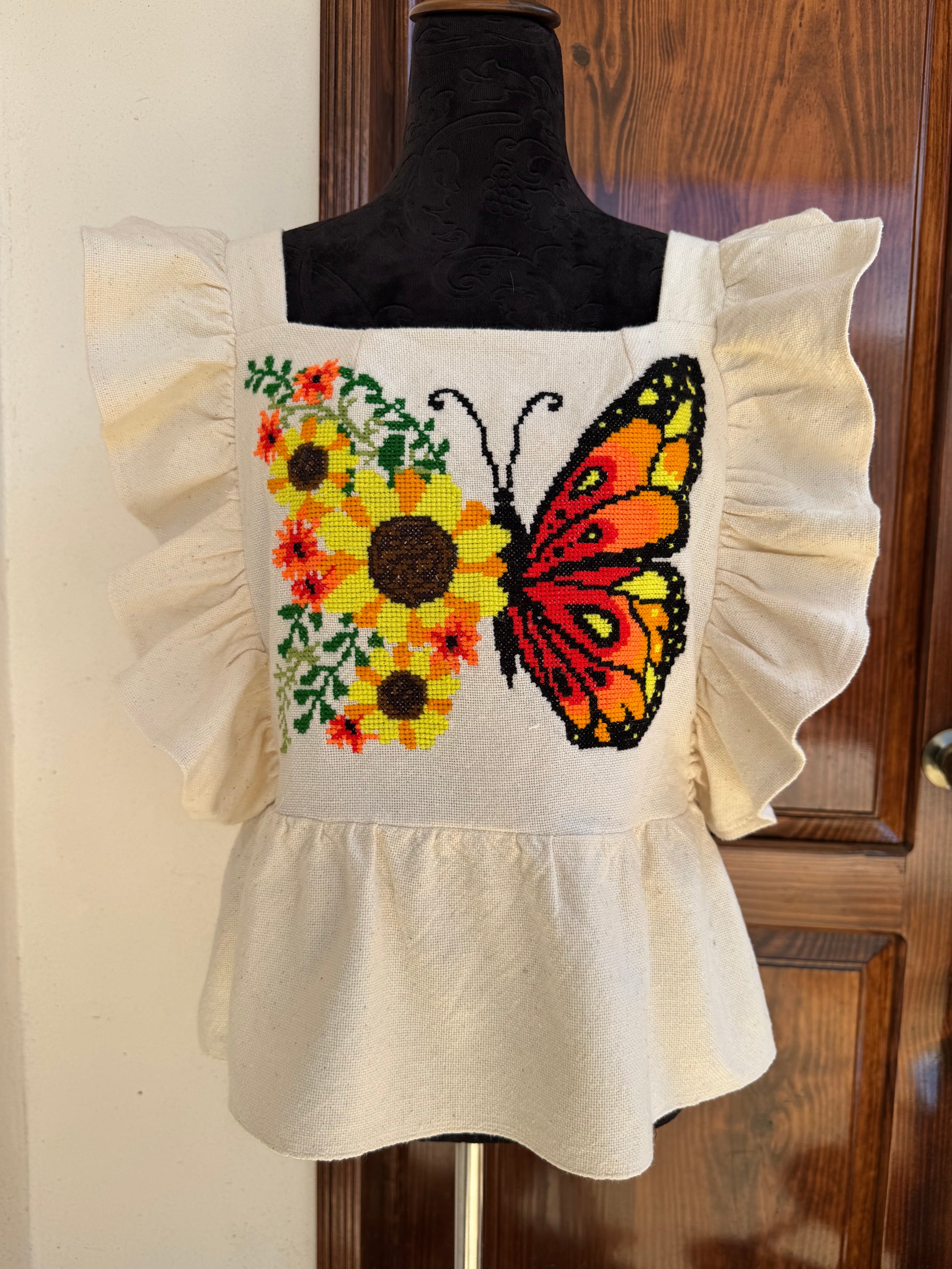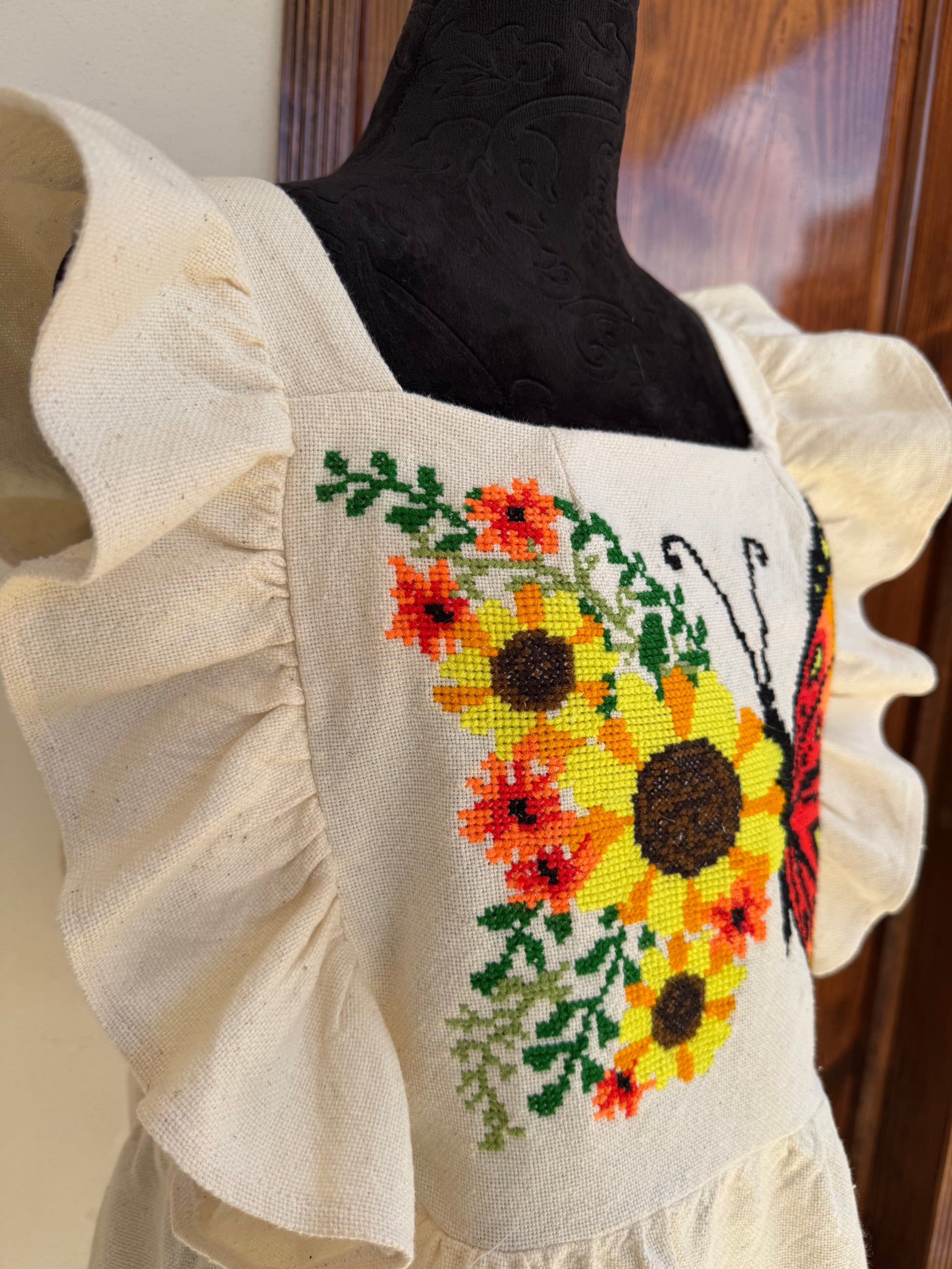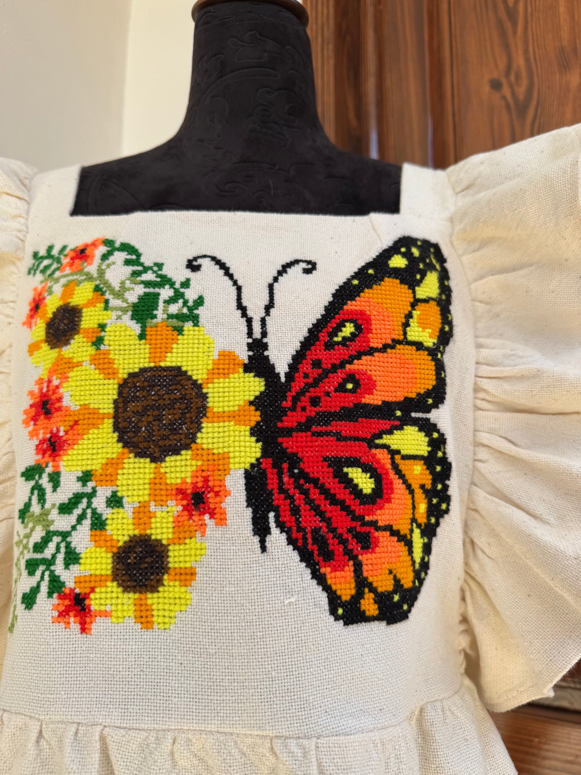 Tejido en telar rústico, confeccionado y bordado en punto de cruz totalmente a mano