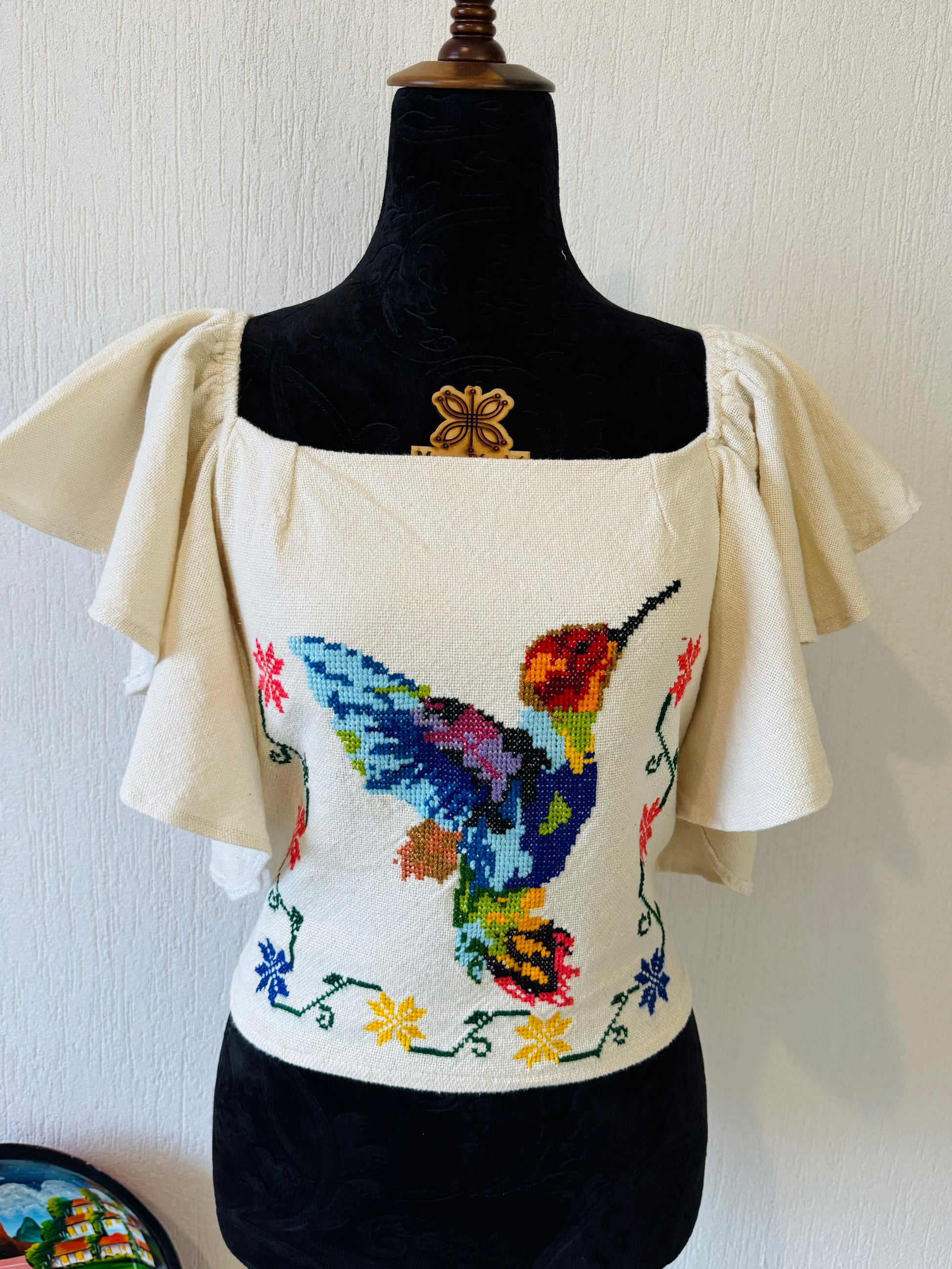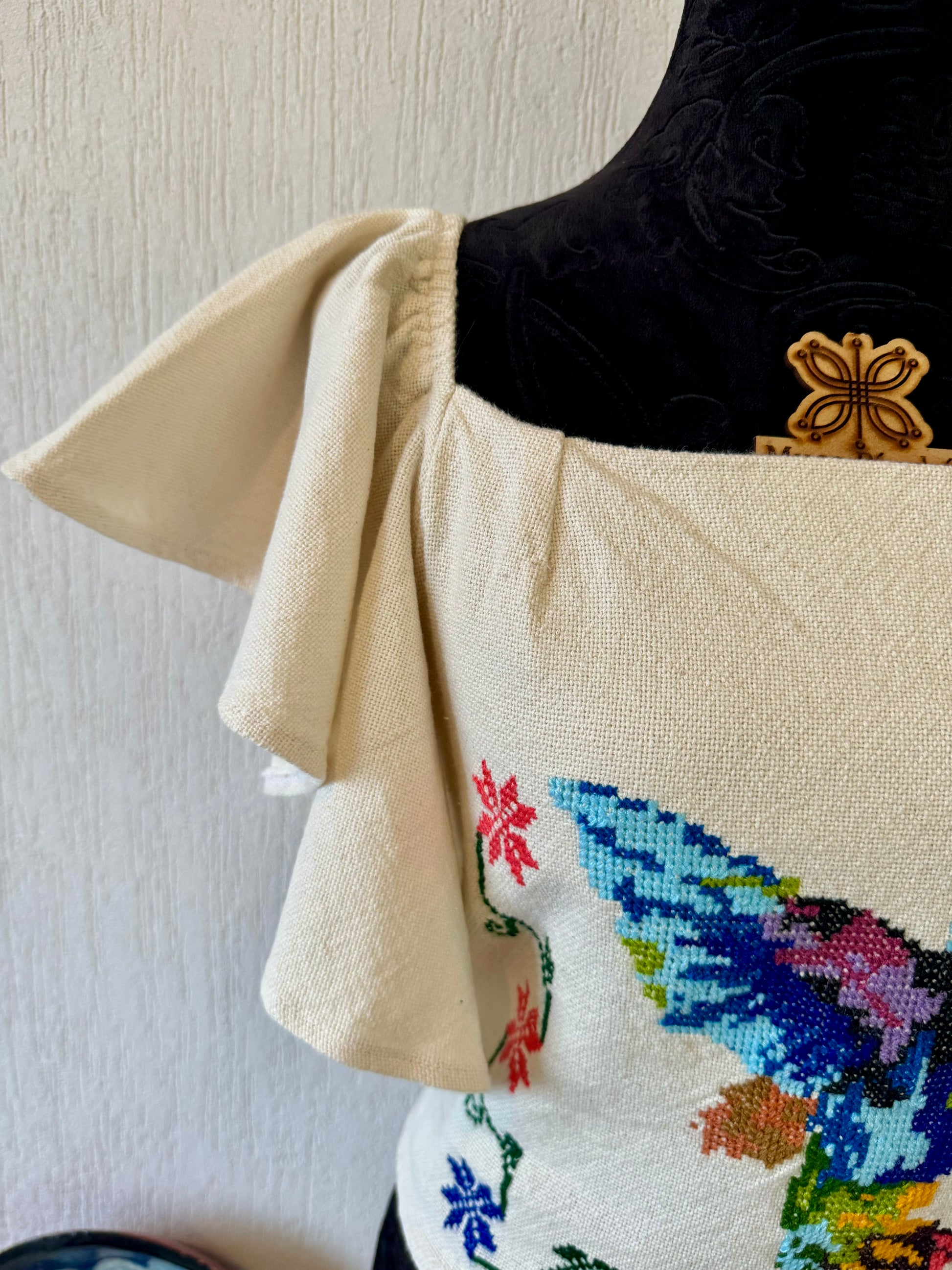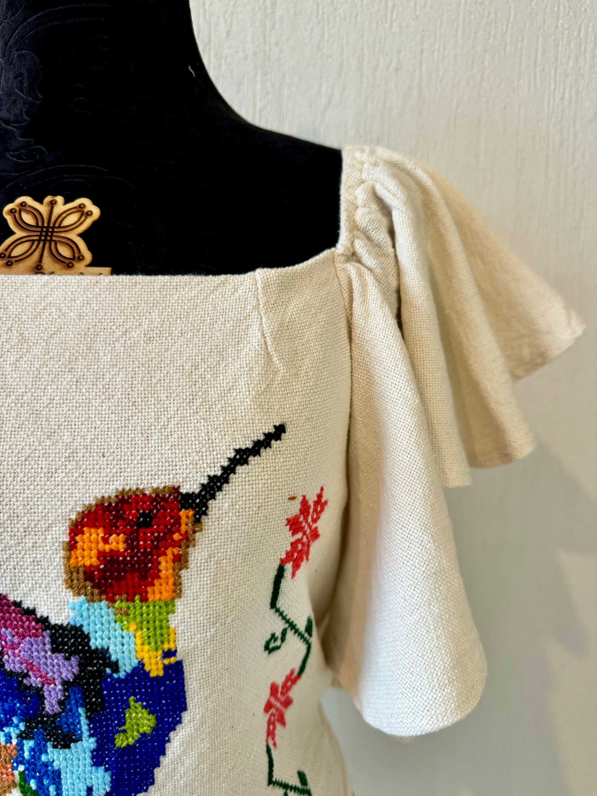 Tejido en telar rústico, confeccionado y bordado en punto de cruz totalmente a mano