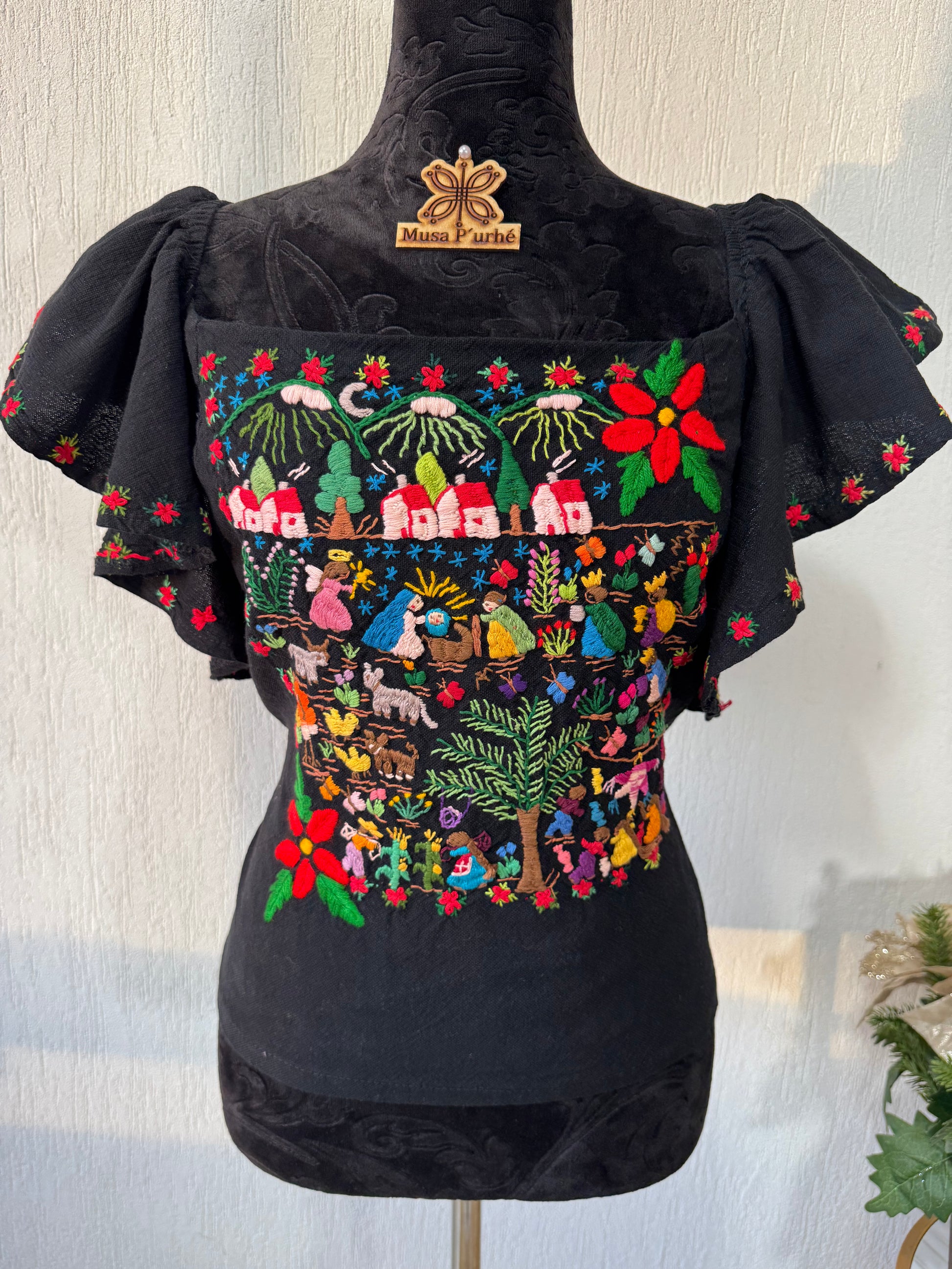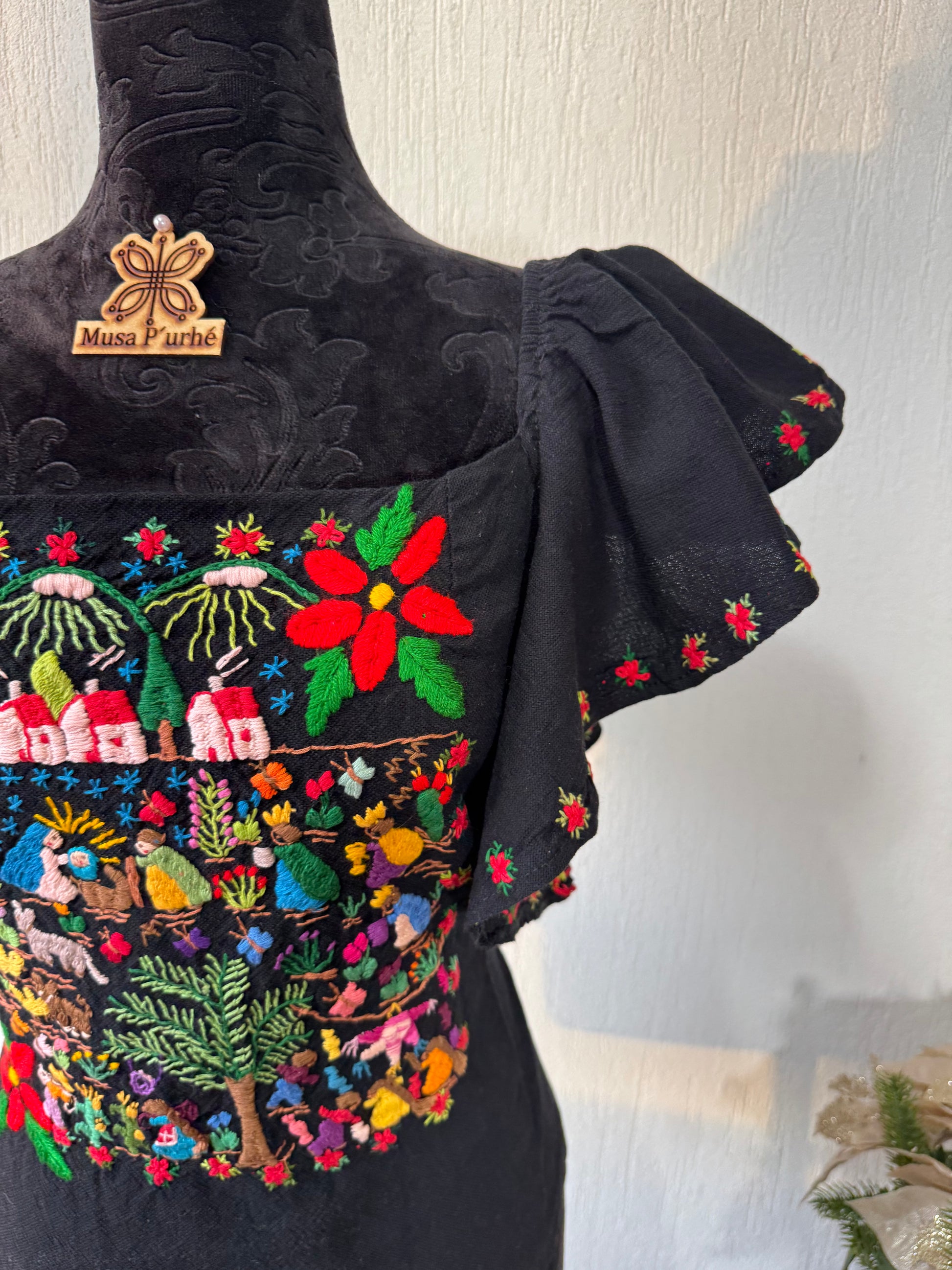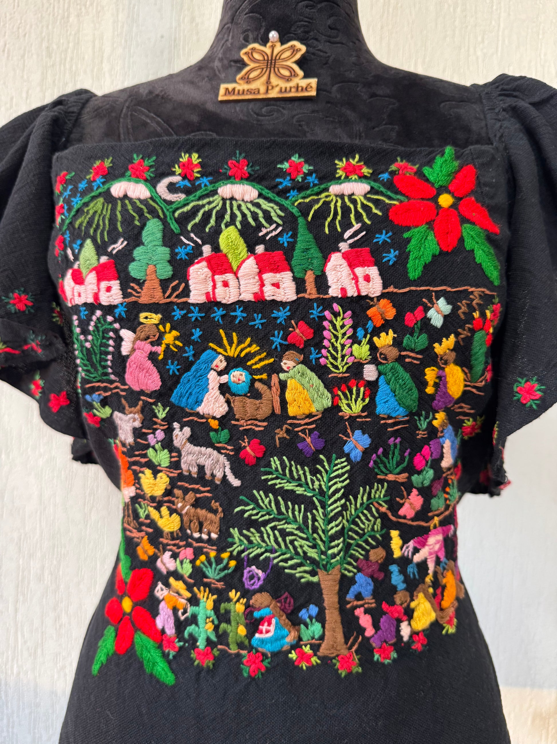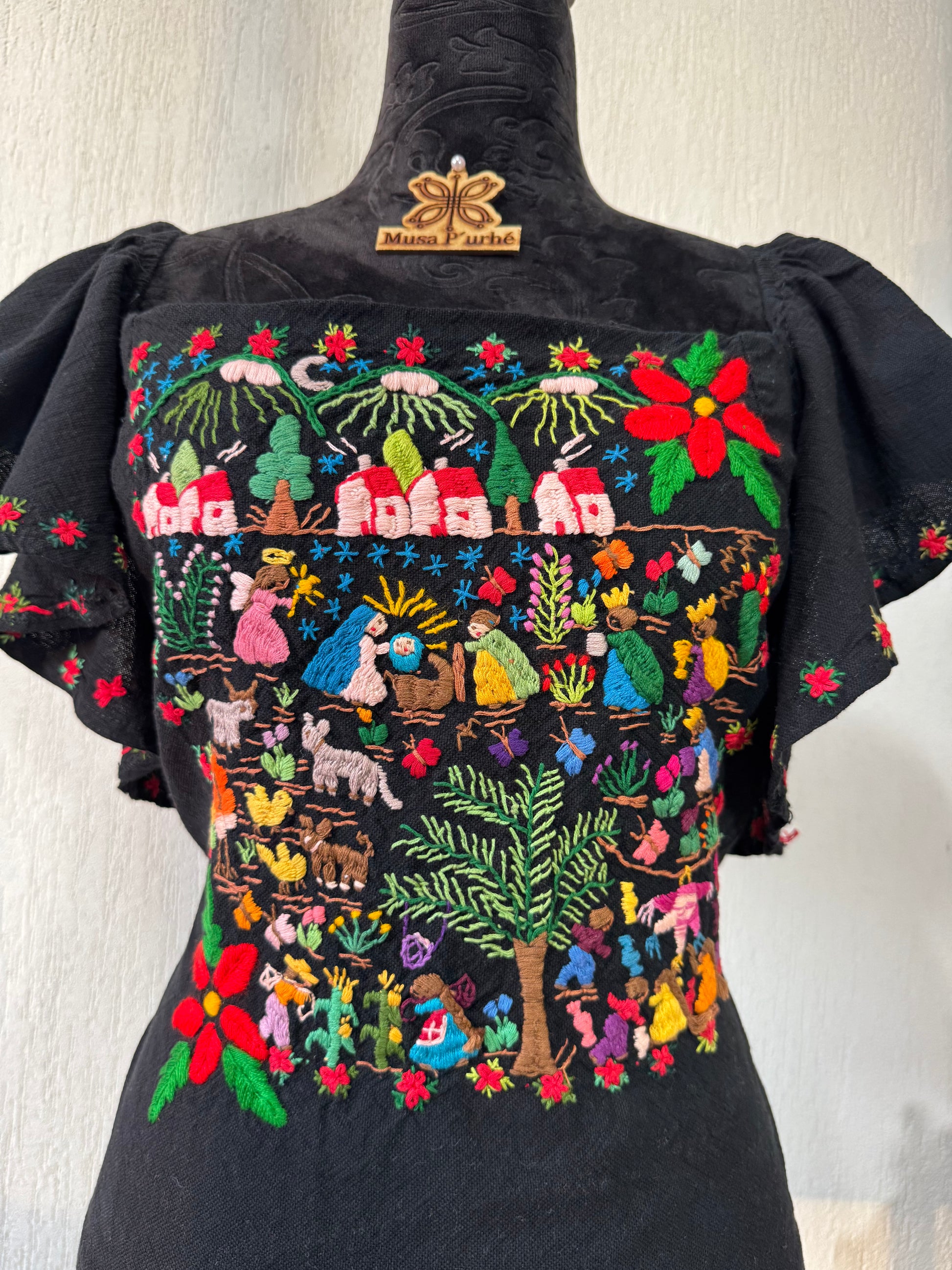 Tejido telar rústico, confeccionado y bordado de historias totalmente a mano