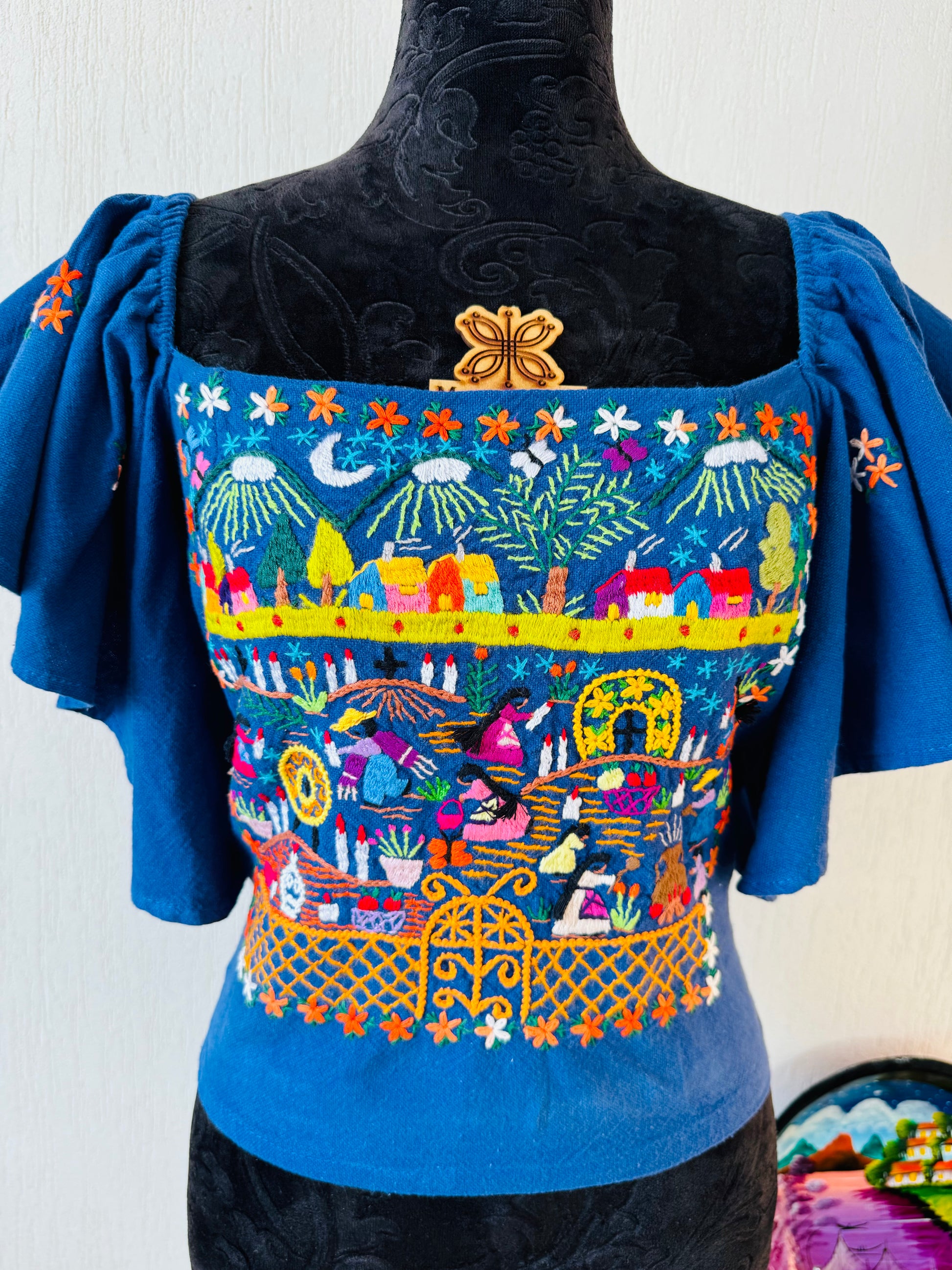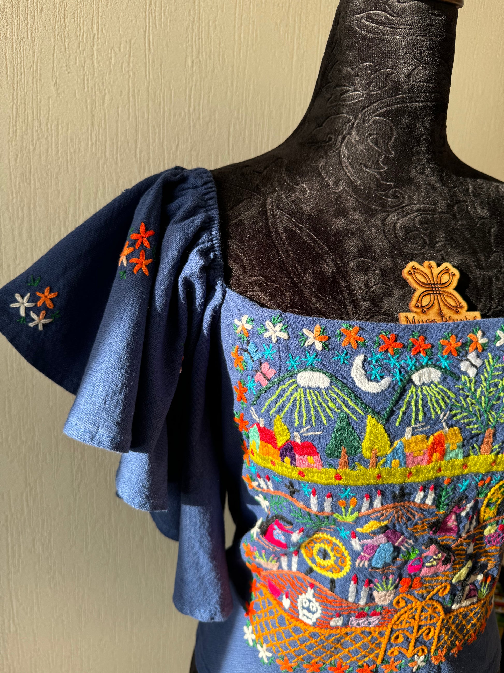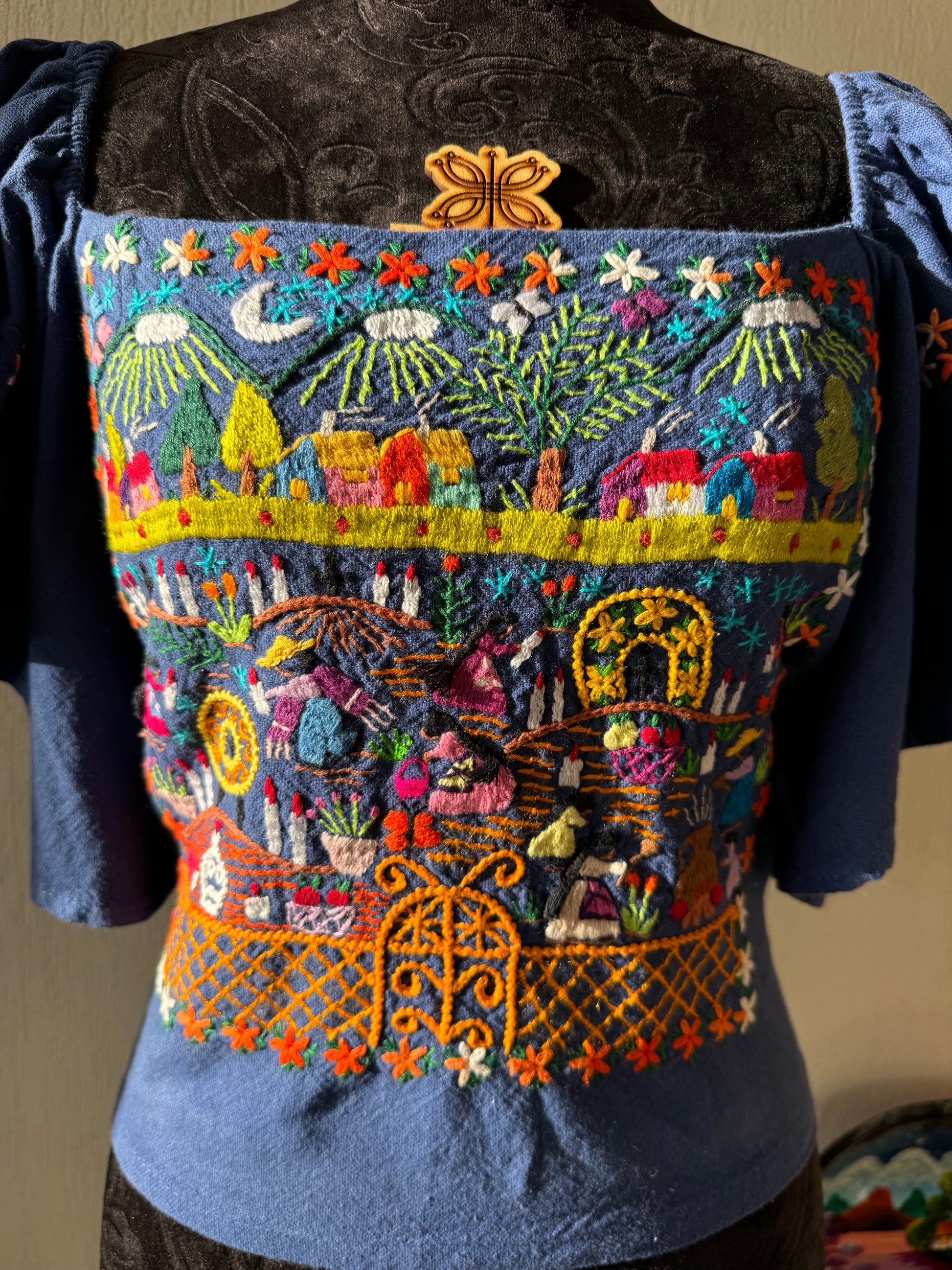 Tejido telar rústico, confeccionado y bordado de historias totalmente a mano
