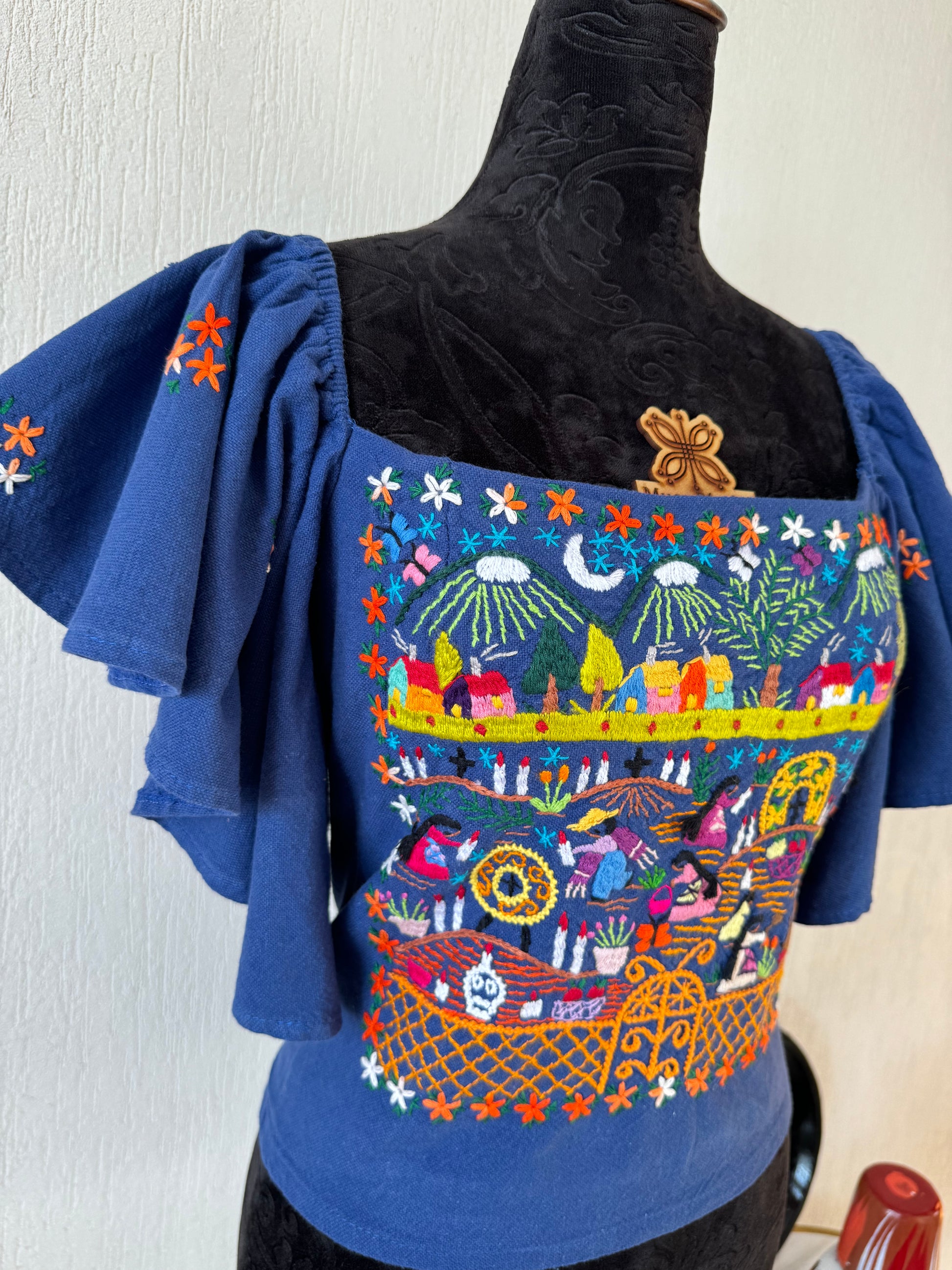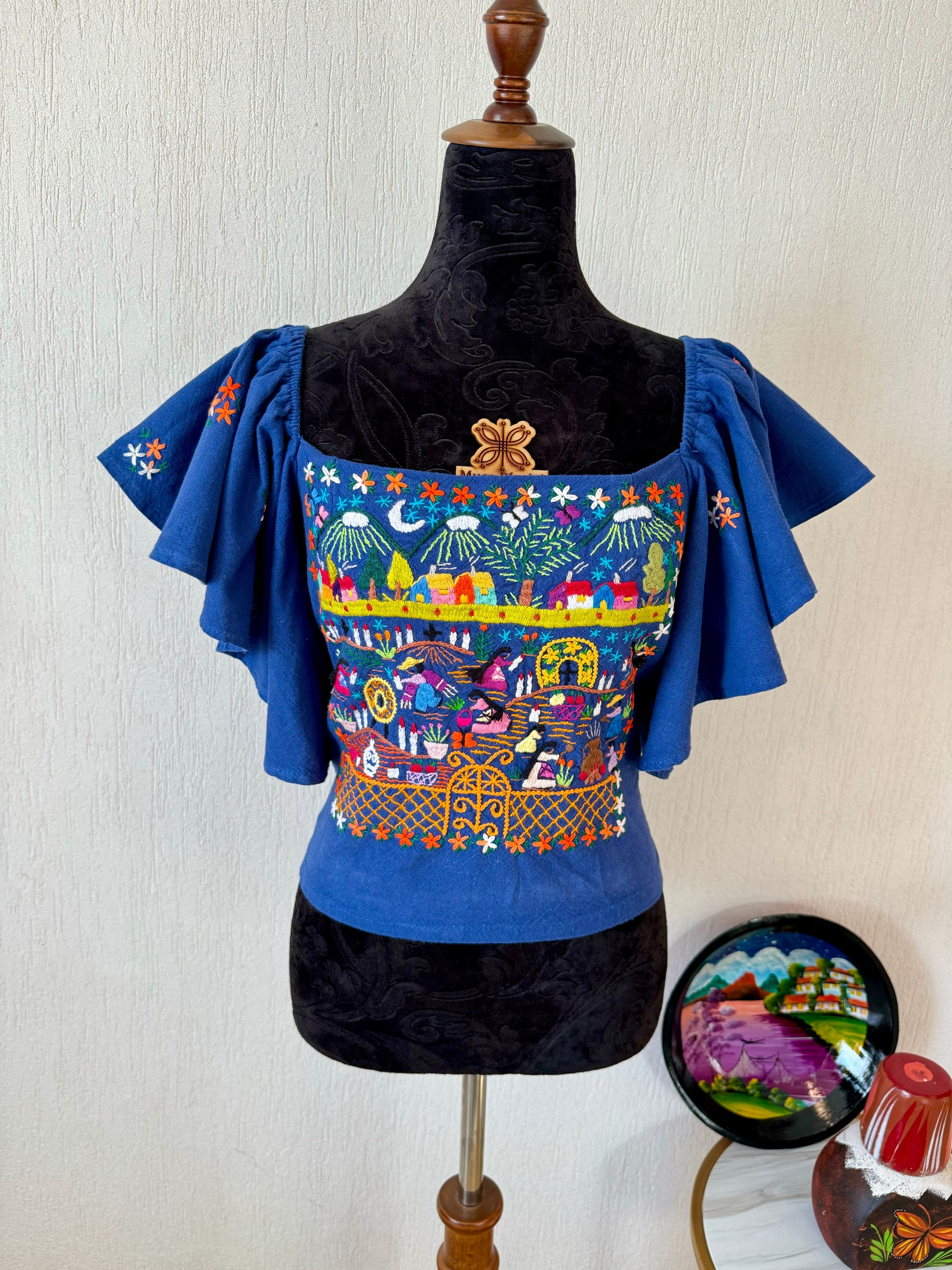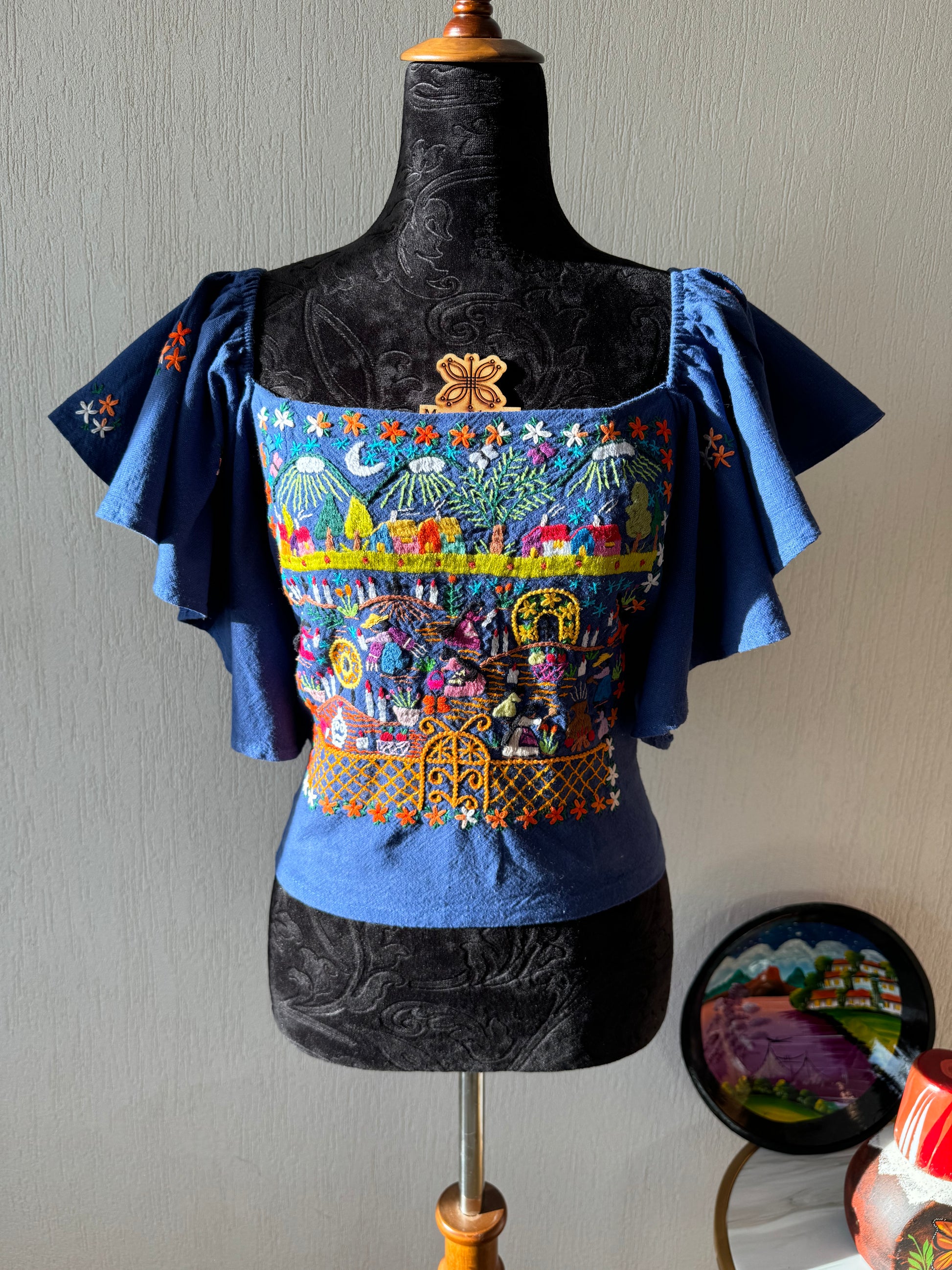 Tejido telar rústico, confeccionado y bordado de historias totalmente a mano