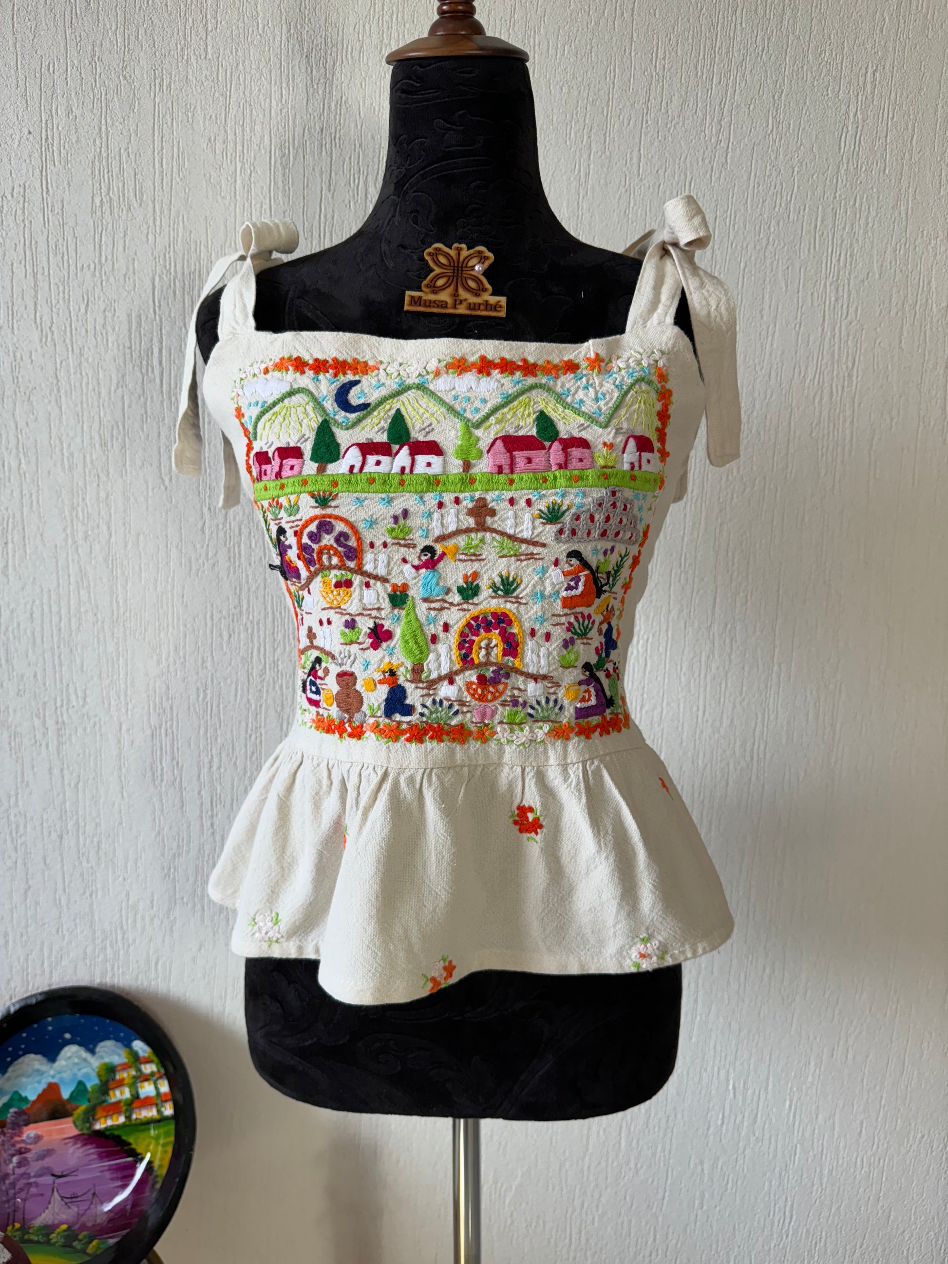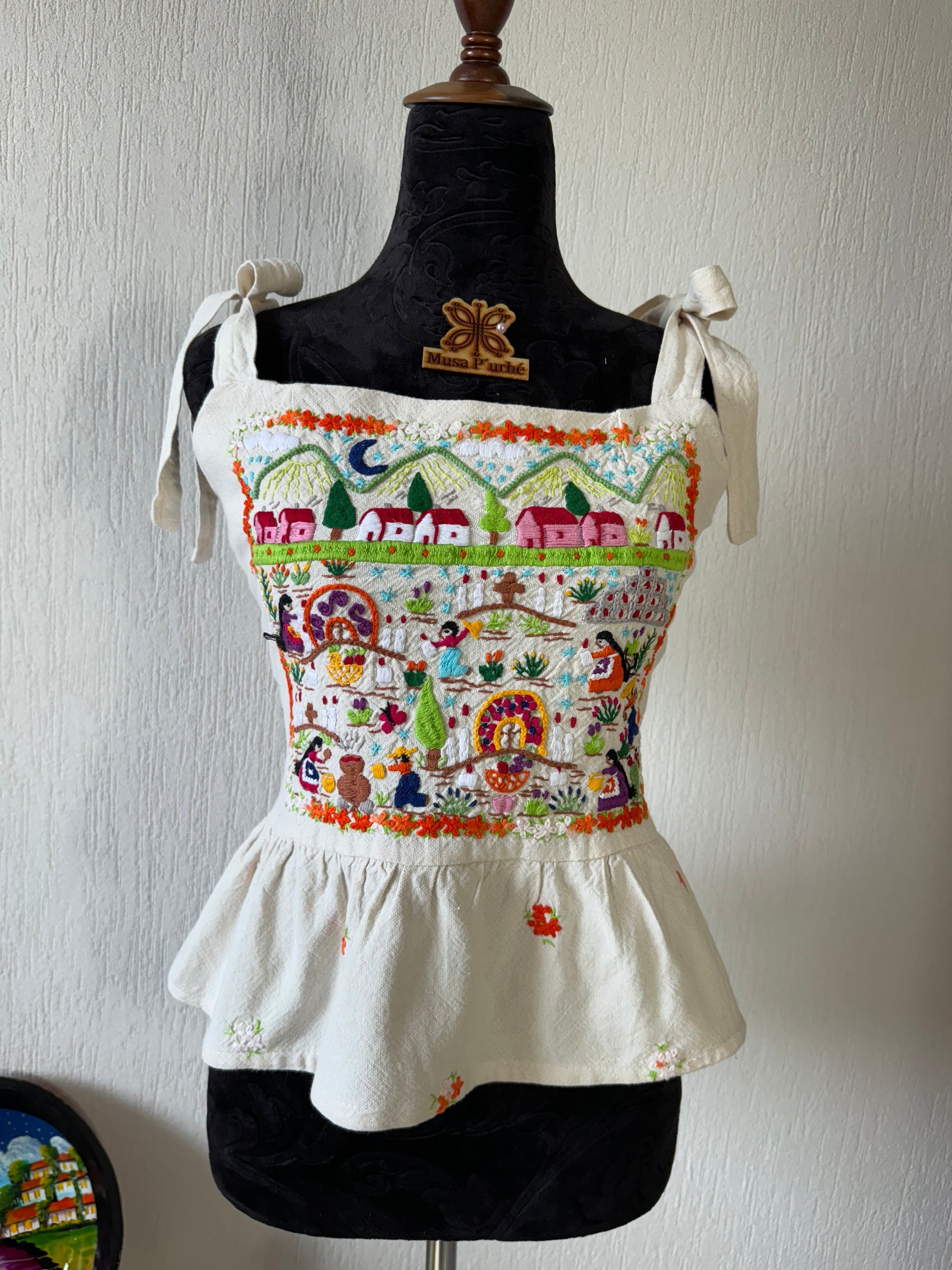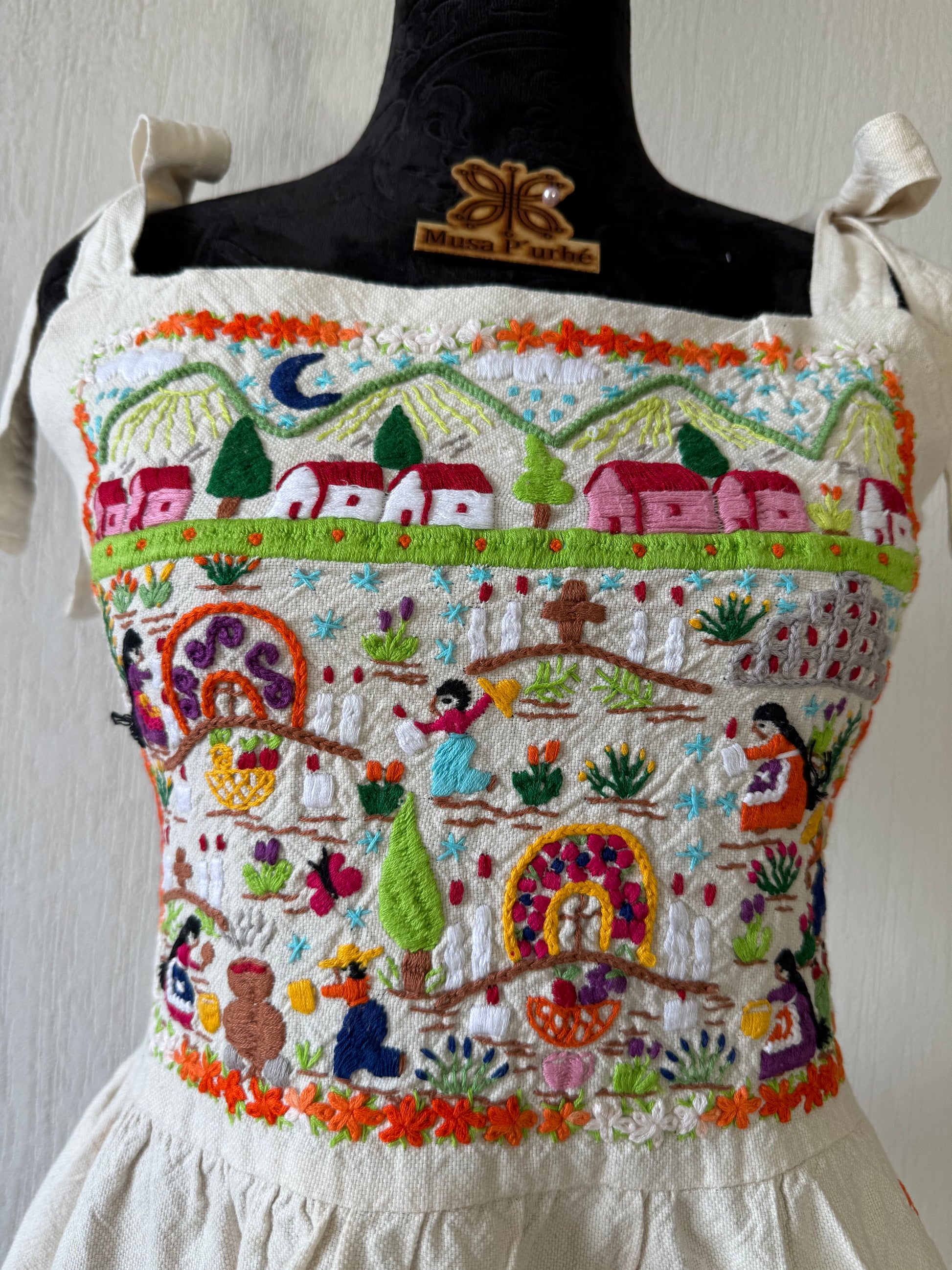 Tejido telar rústico, confeccionado y bordado de historias totalmente a mano