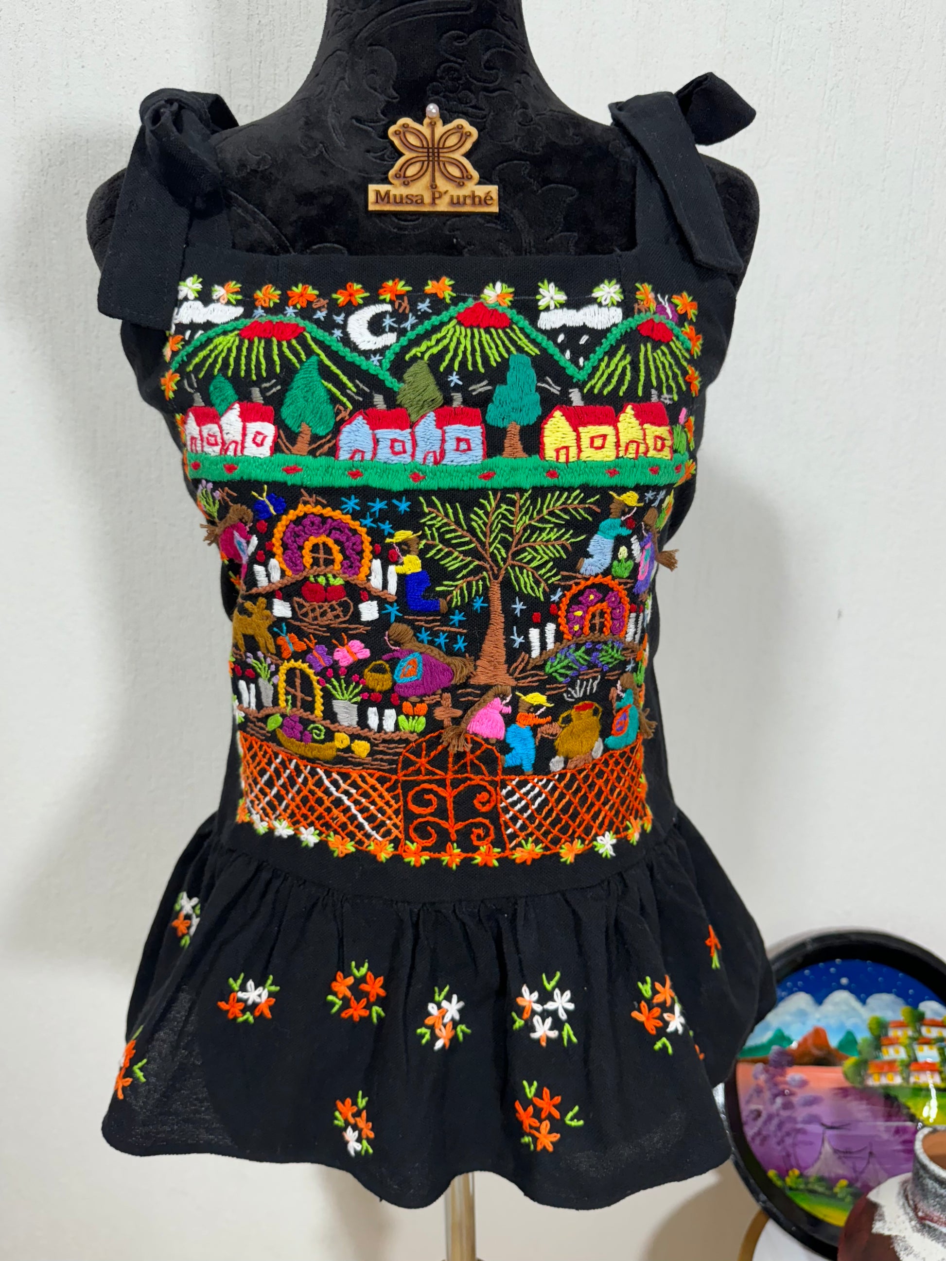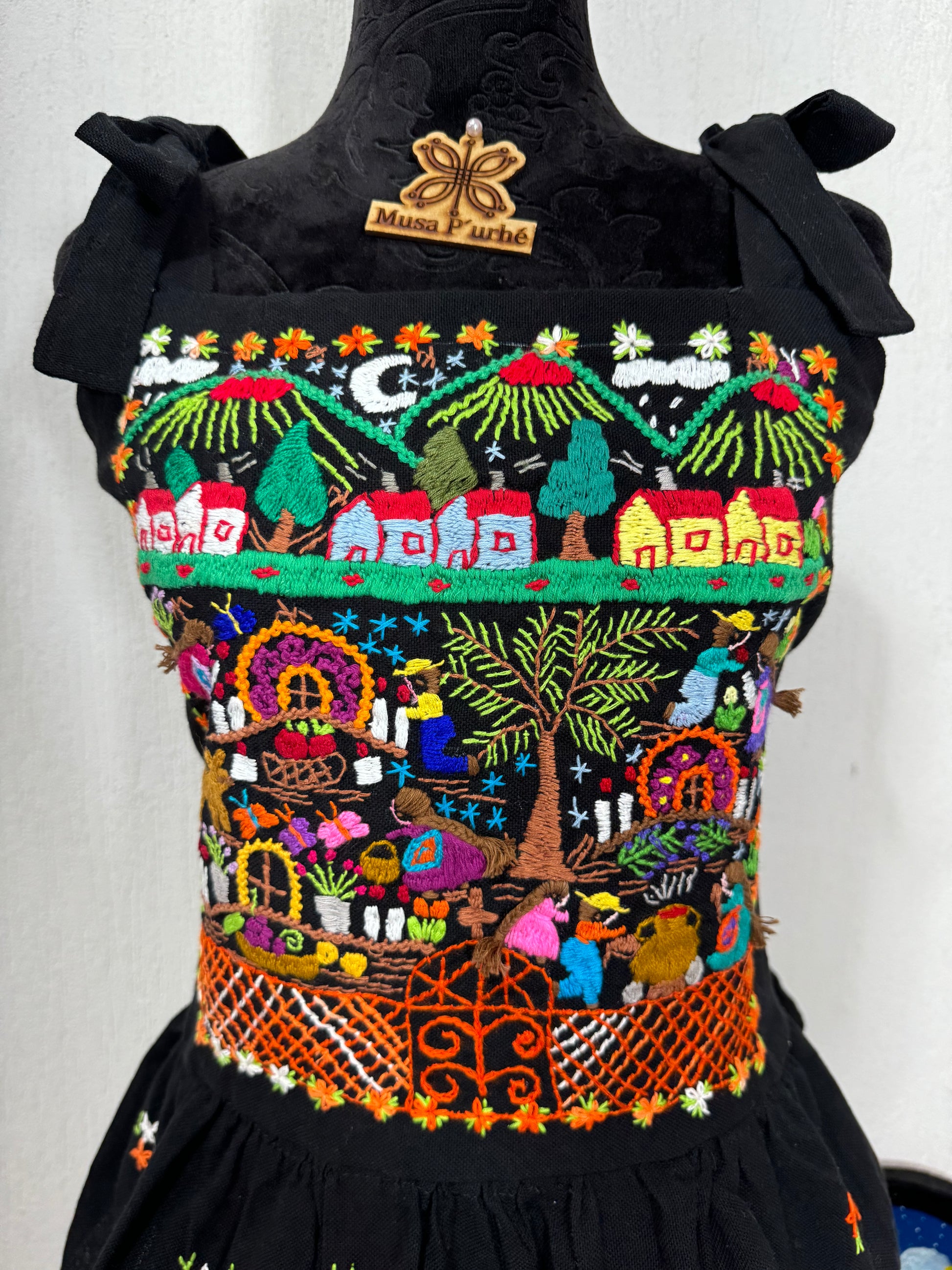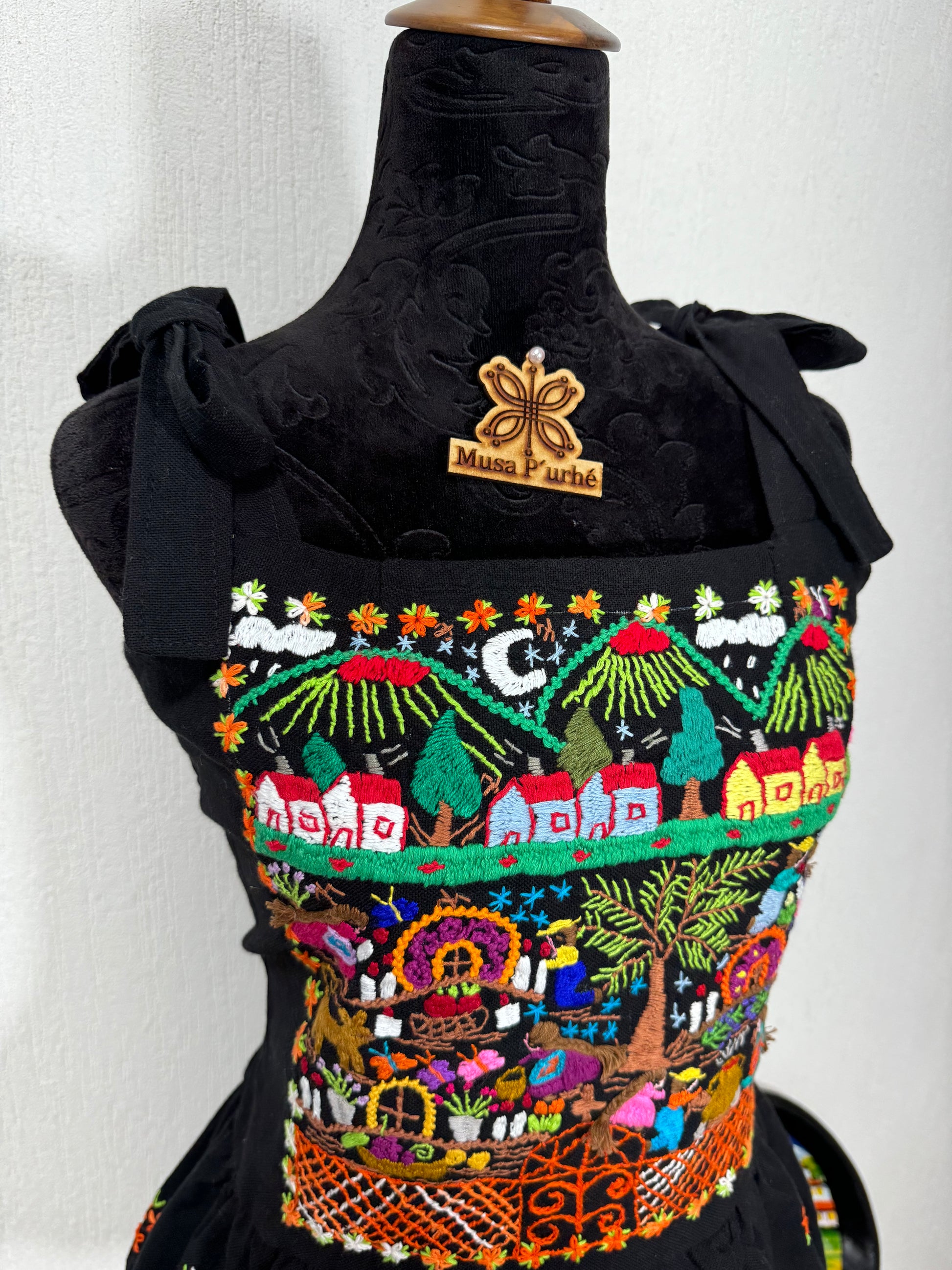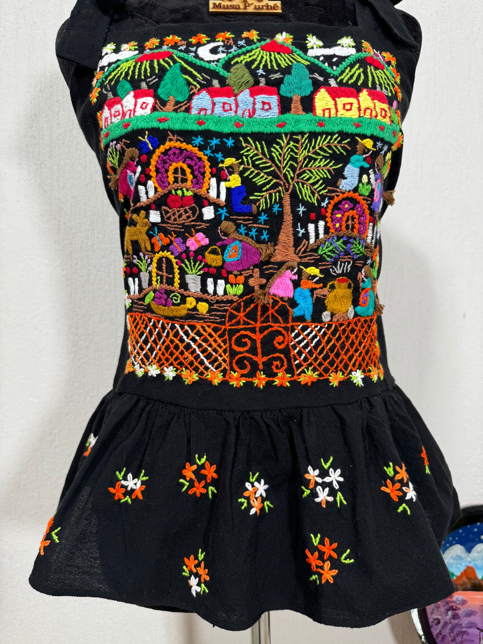 Tejido telar rústico, confeccionado y bordado de historias totalmente a mano