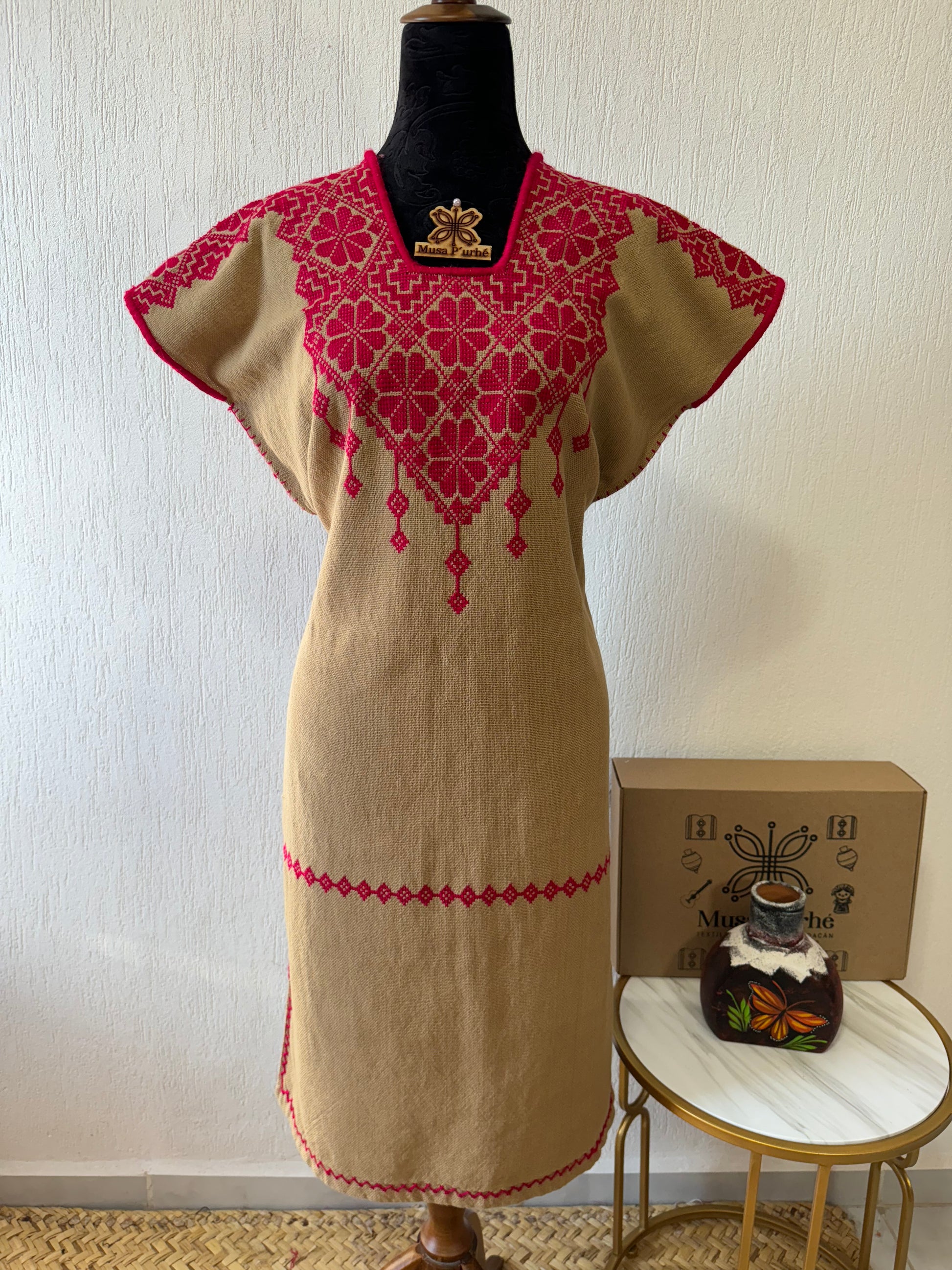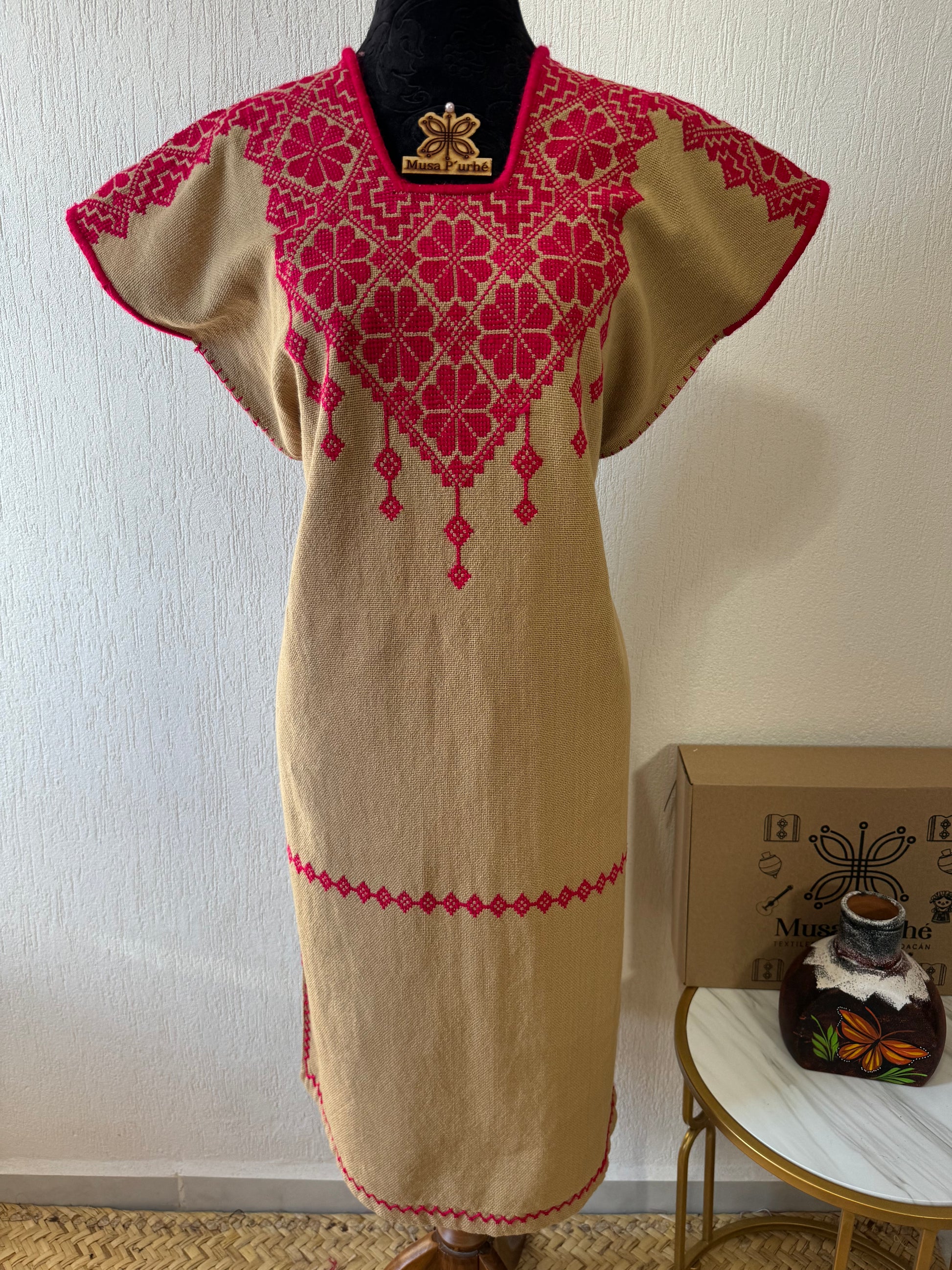 Tejido en telar rústico, confeccionado y bordado en punto de cruz totalmente a mano por ambos lados