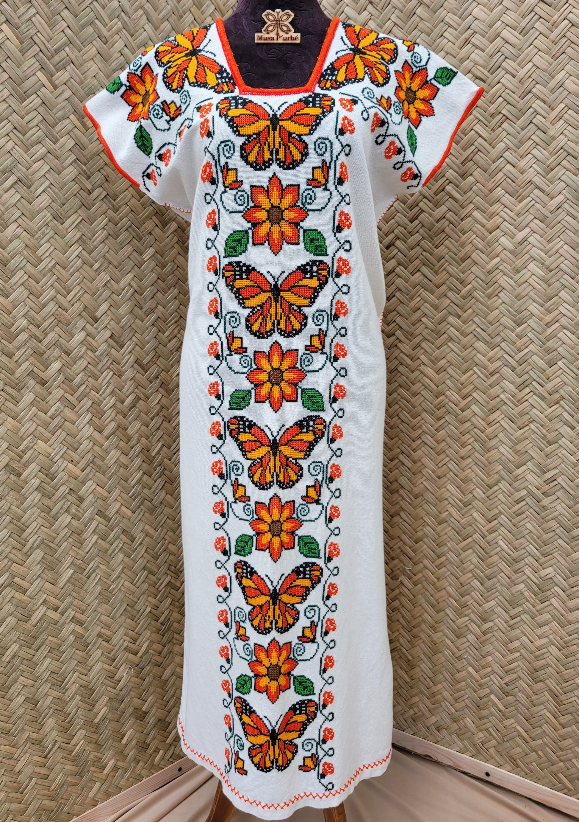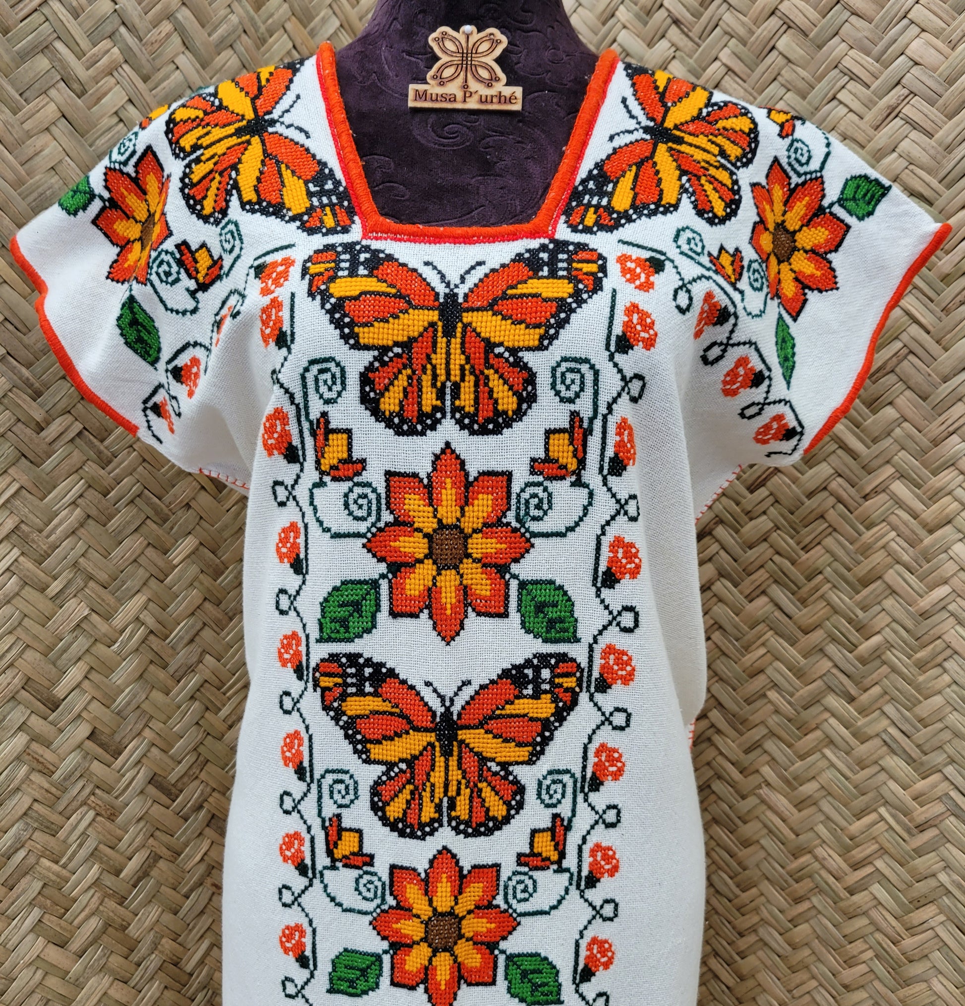 Tejido en telar rústico, confeccionado y bordado en punto de cruz totalmente a mano
