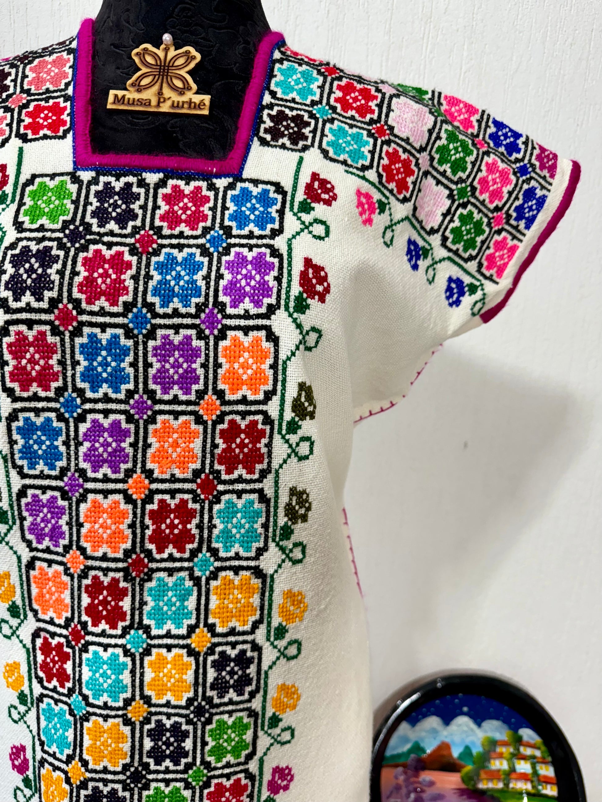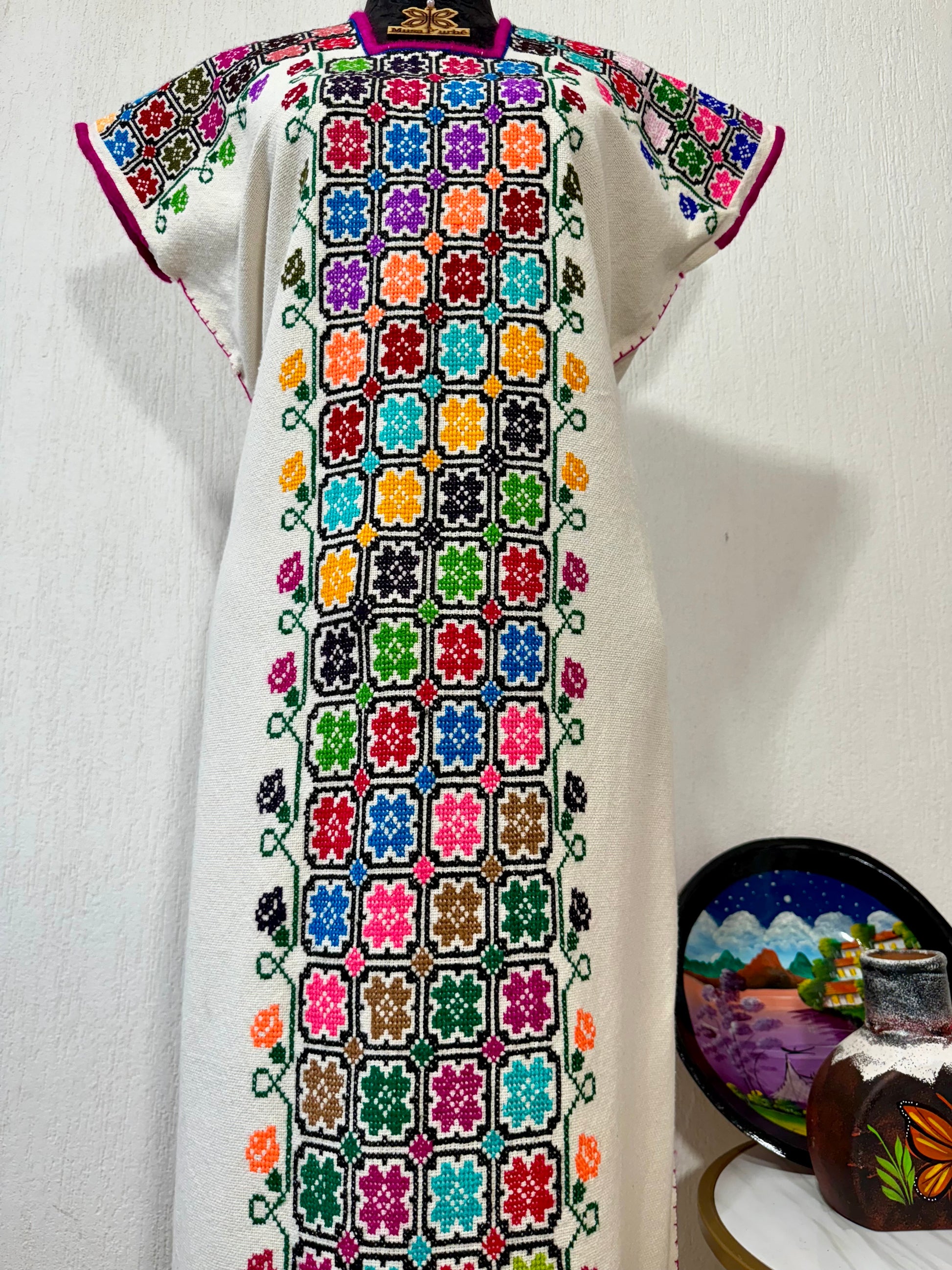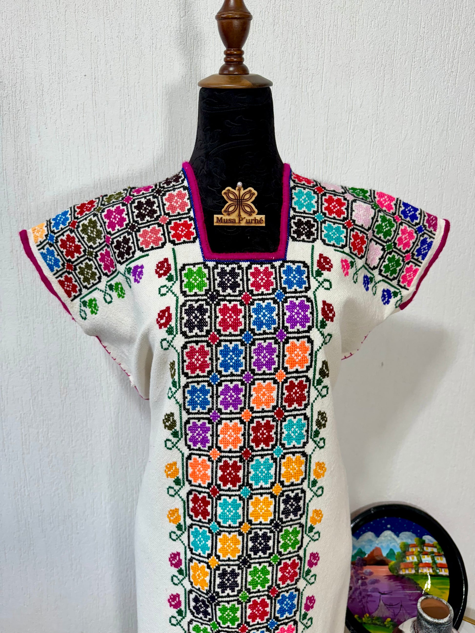 Tejido en telar rústico, confeccionado y bordado en punto de cruz totalmente a mano solo por enfrente.
